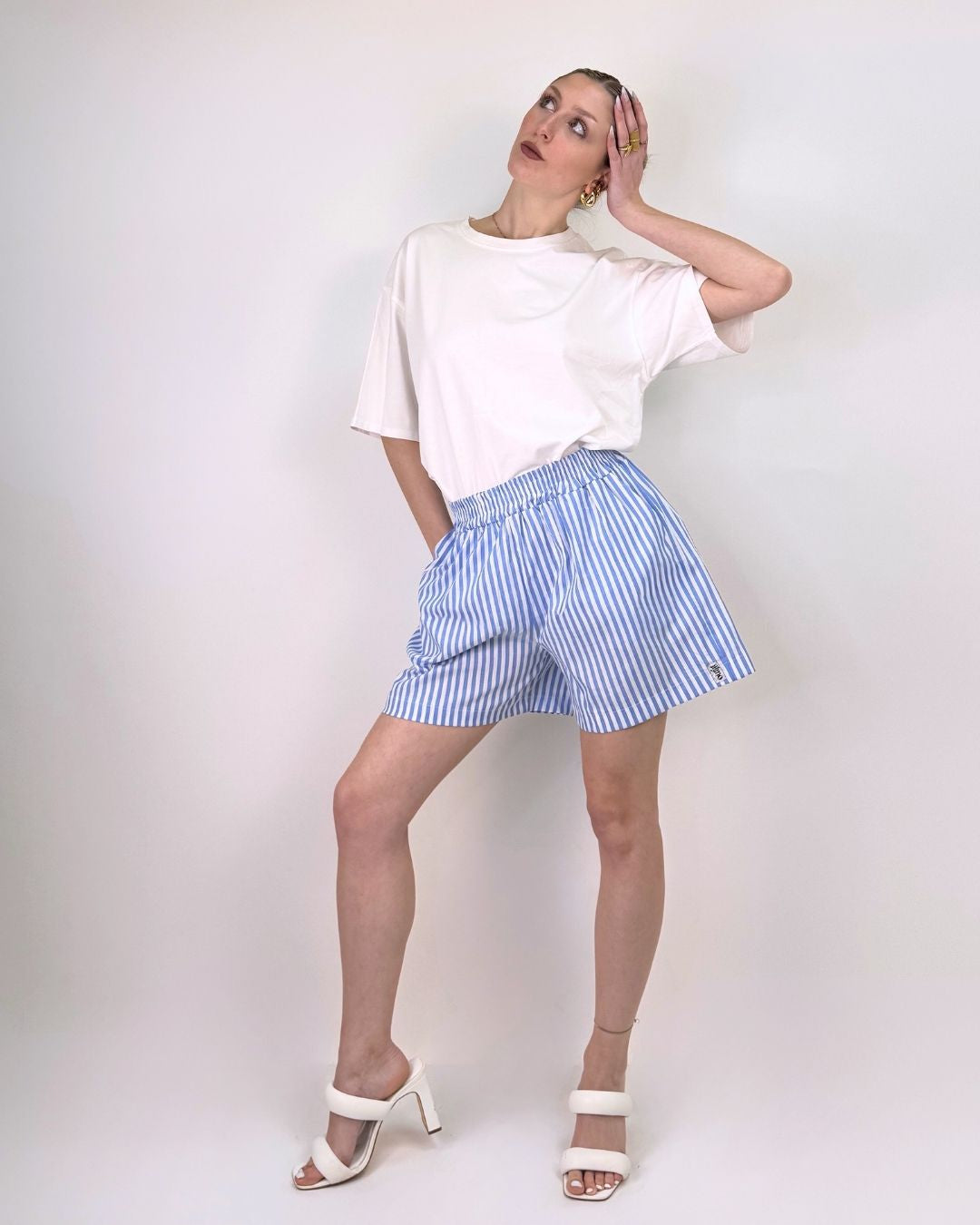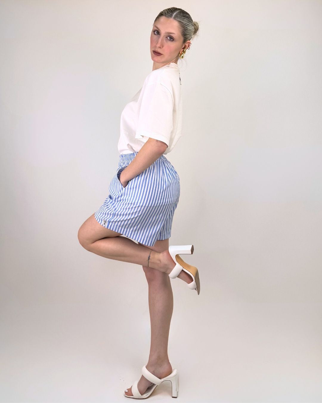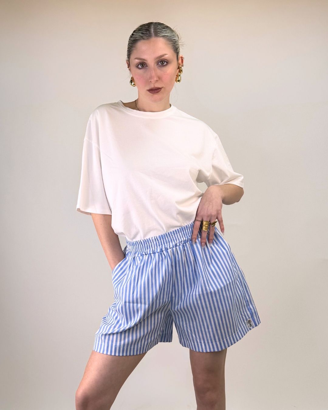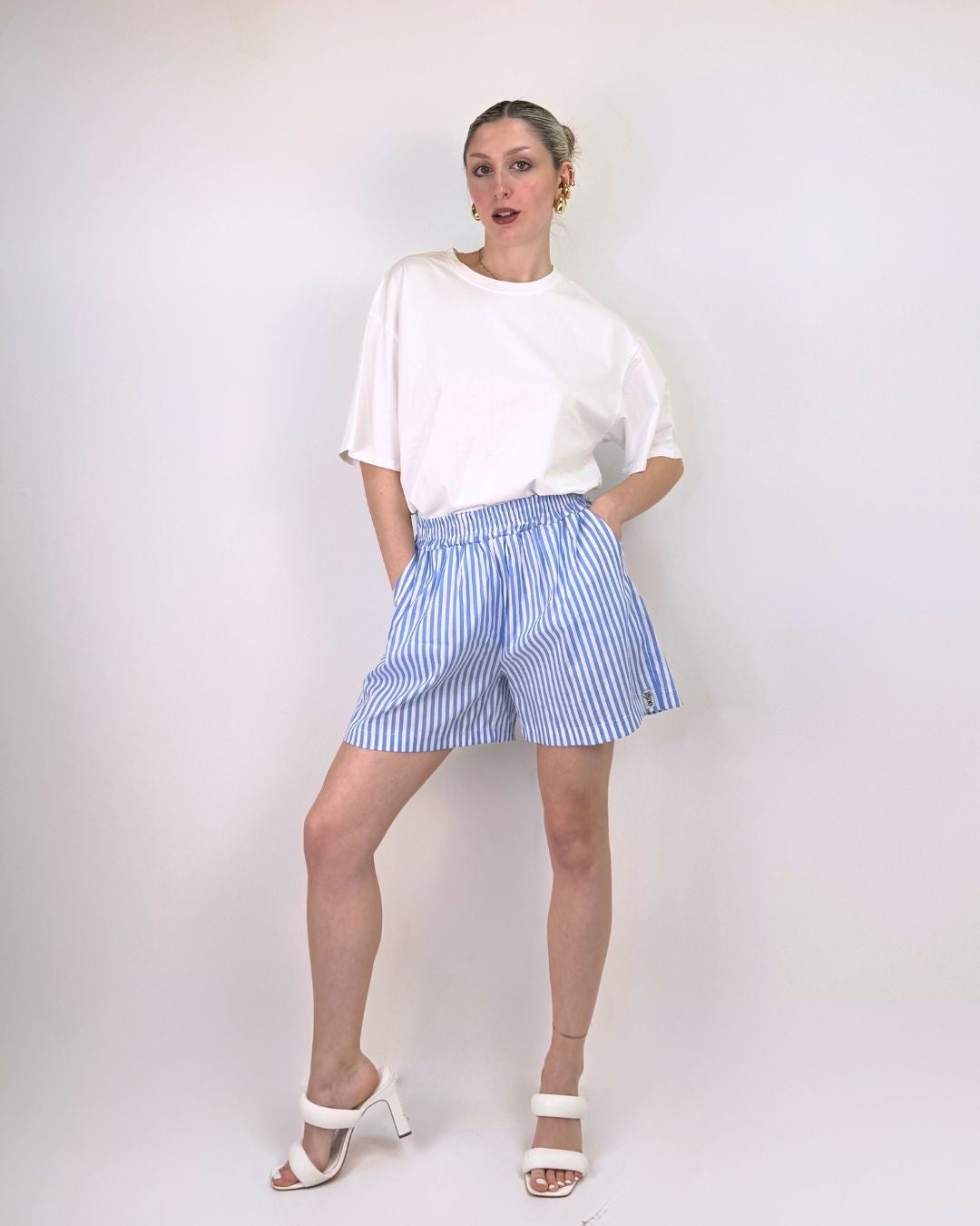Pantaloncino stile boyfriend con cinturino elasticizzato e tasche. Questo shorts in tessuto super fresco è ideale per le vacanze e le giornate di mare, super comodo stile provenzale si adatta a tutti i fisici. Veste dalla taglia XS alla taglia L.