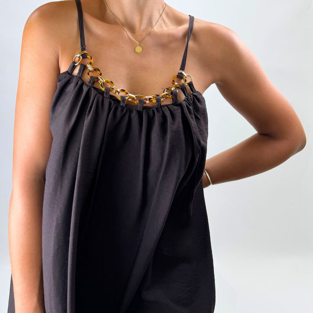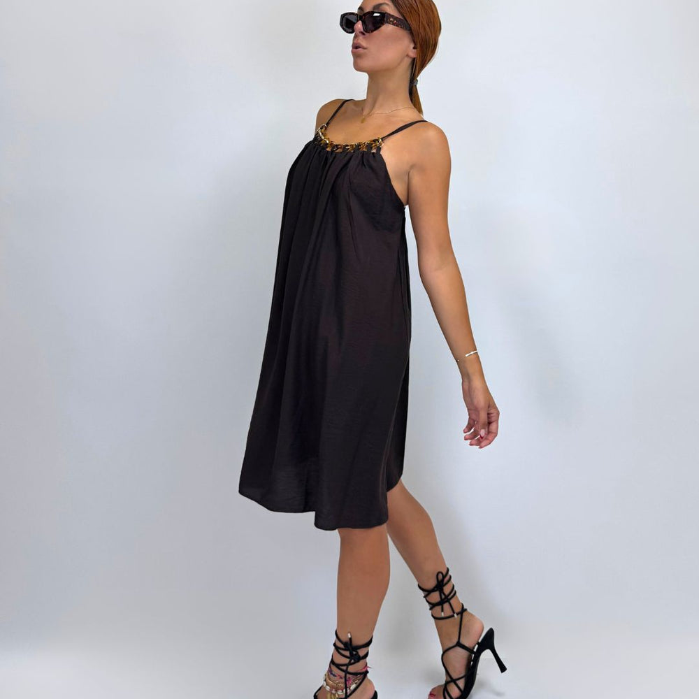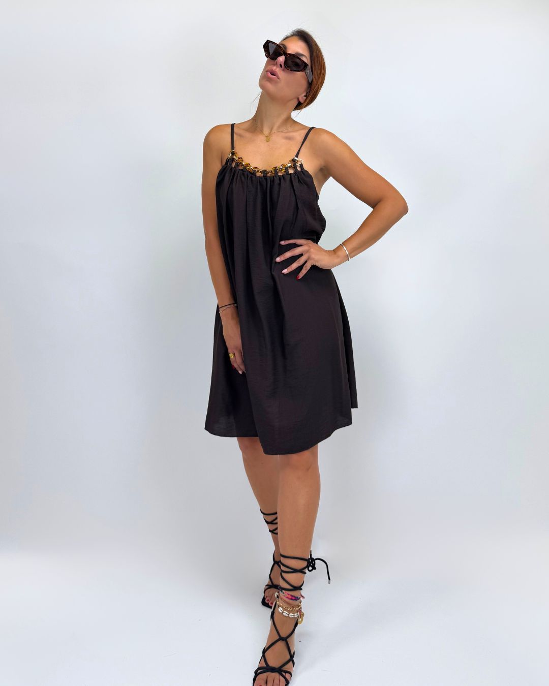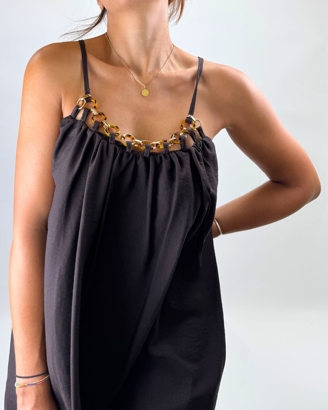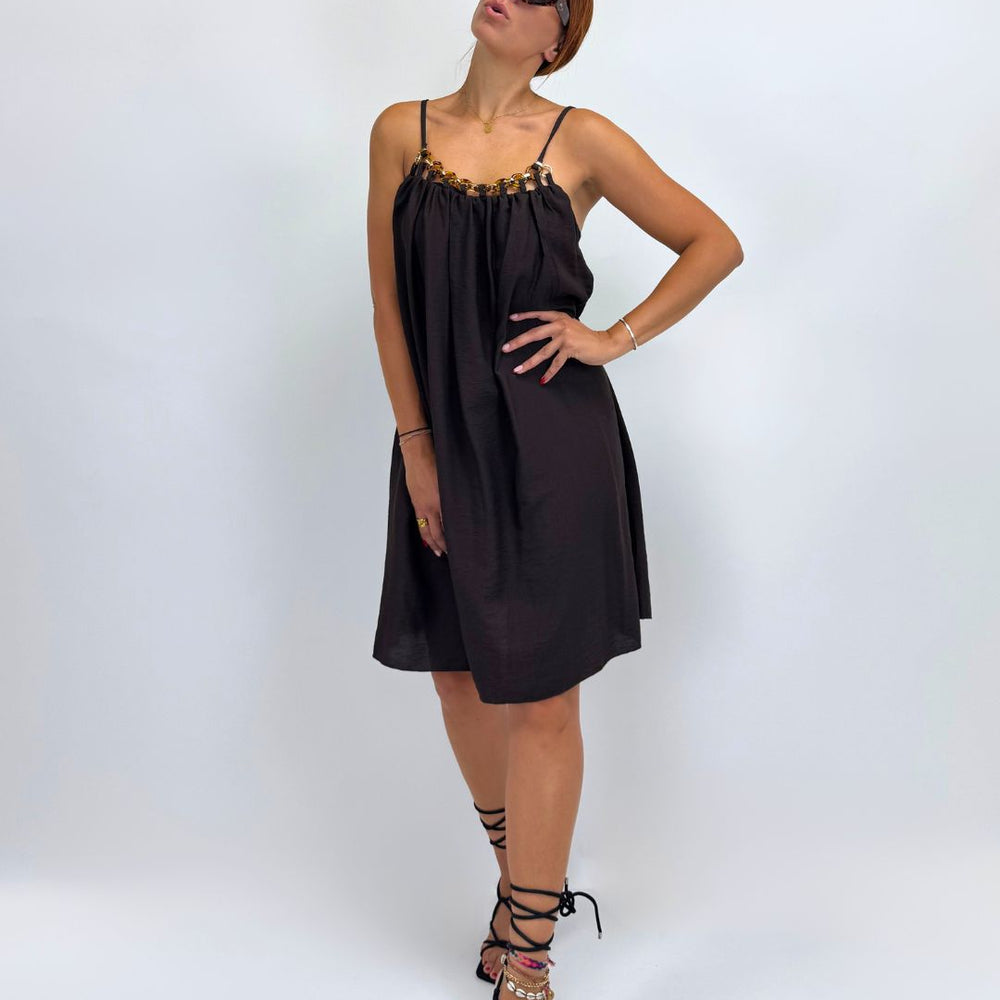 Abito ampio in tessuto leggero e fresco, ideale per l'estate, con catena in plastica tartarugata sullo scollo, bordo elasticizzato che aiuta la vestibilità. Veste dalla taglia XS alla taglia XL.