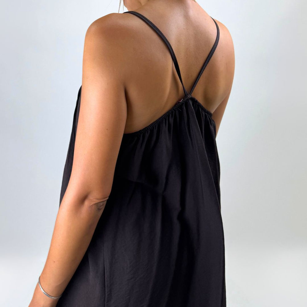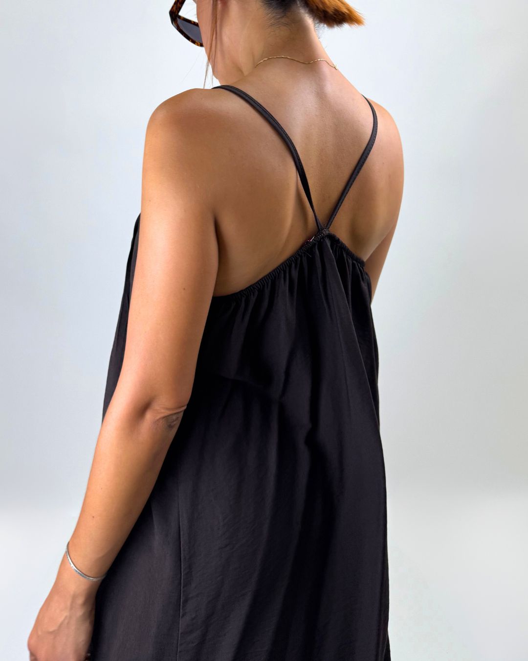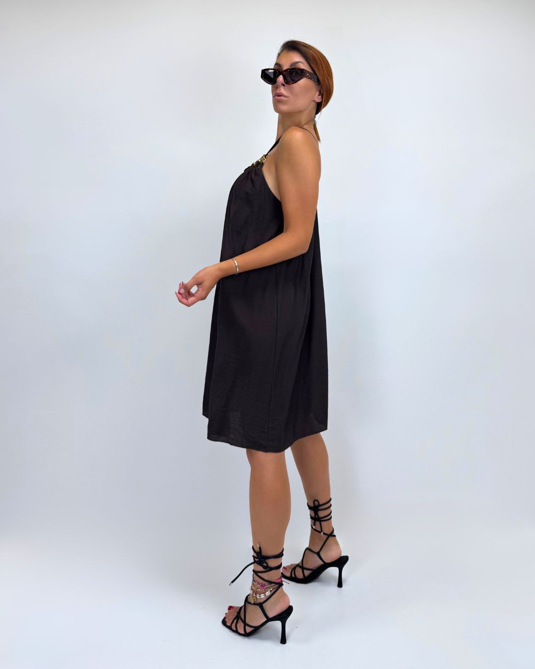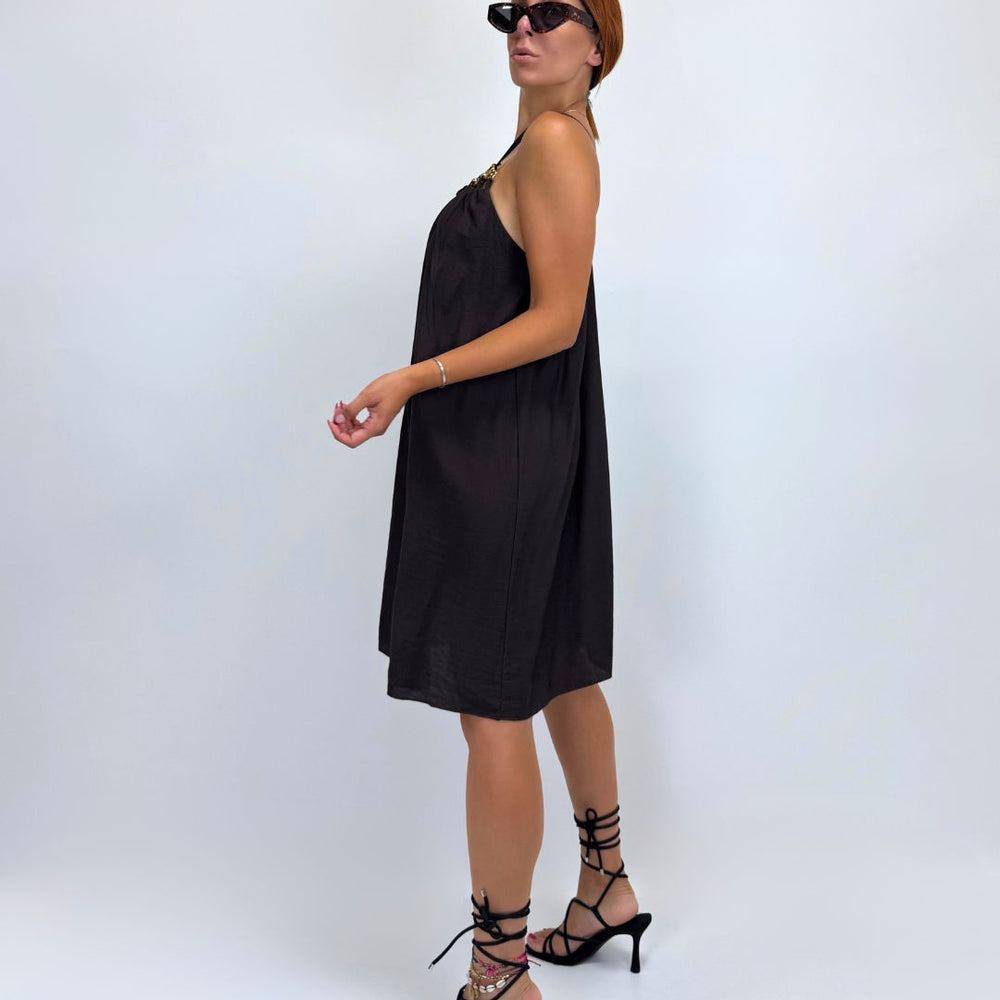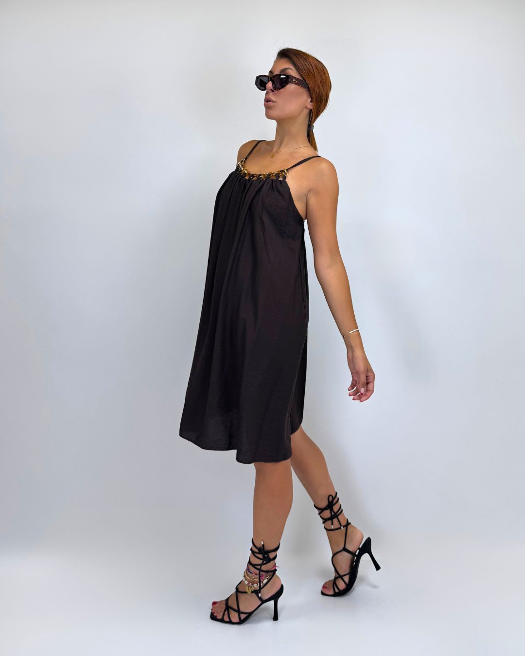 Abito ampio in tessuto leggero e fresco, ideale per l'estate, con catena in plastica tartarugata sullo scollo, bordo elasticizzato che aiuta la vestibilità. Veste dalla taglia XS alla taglia XL.