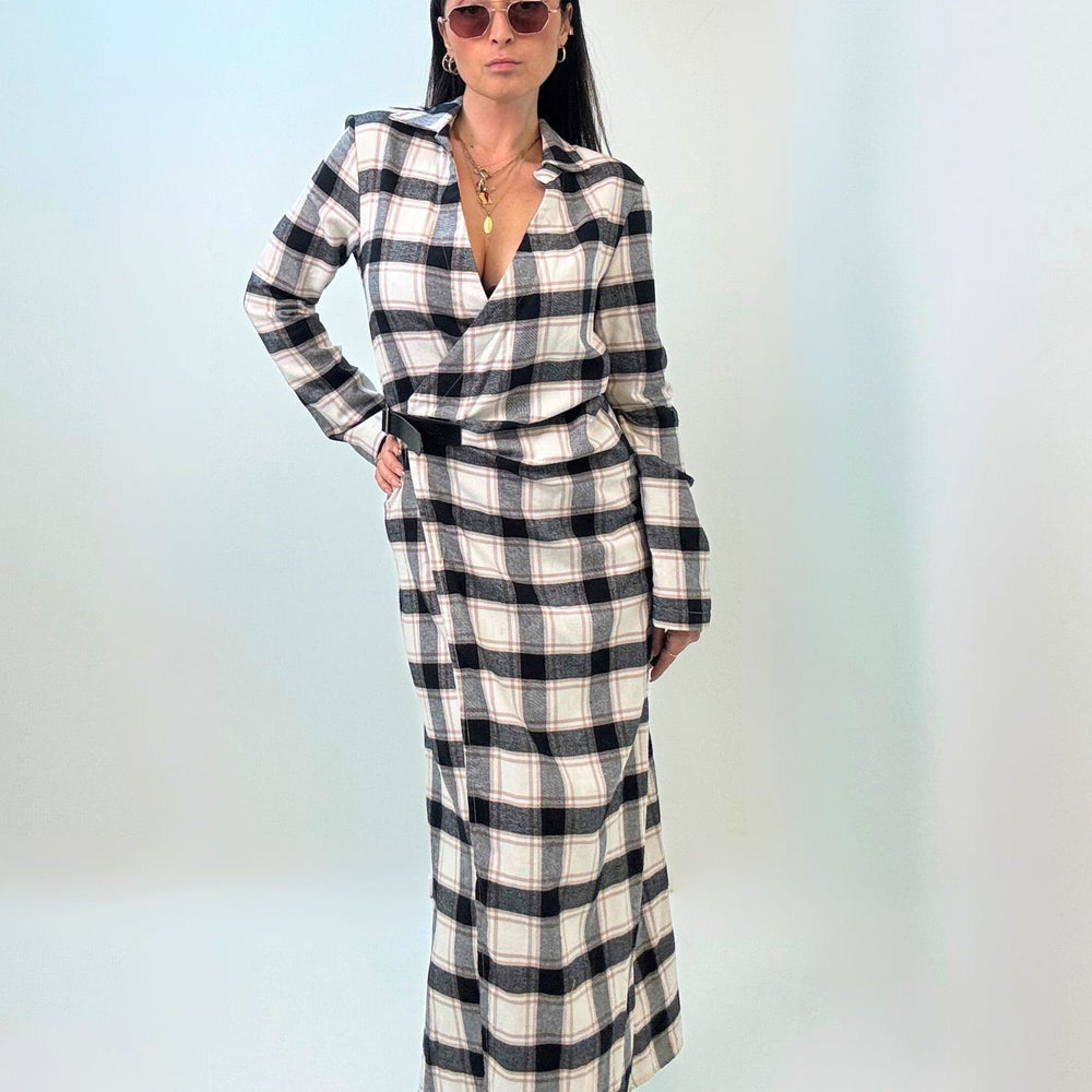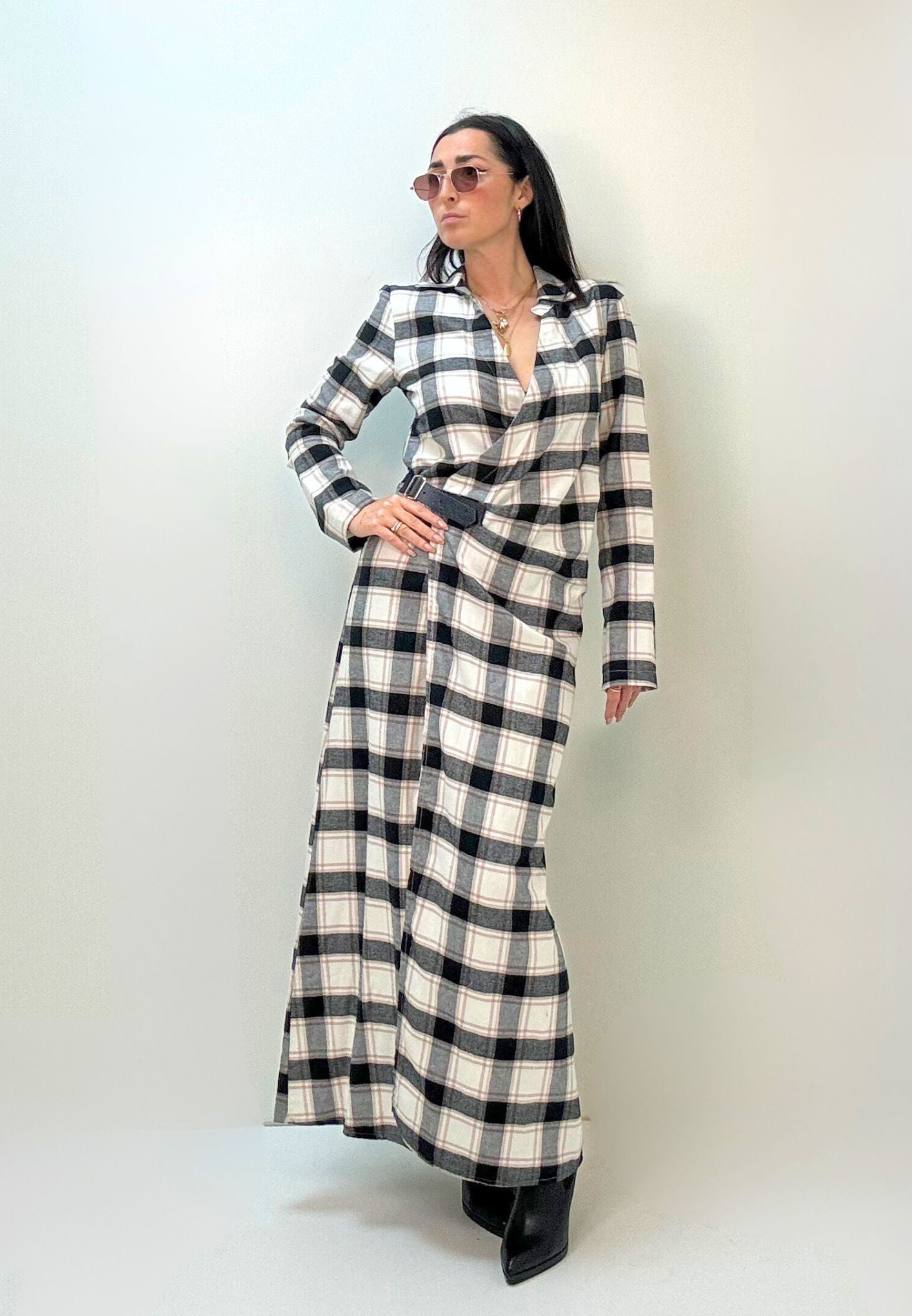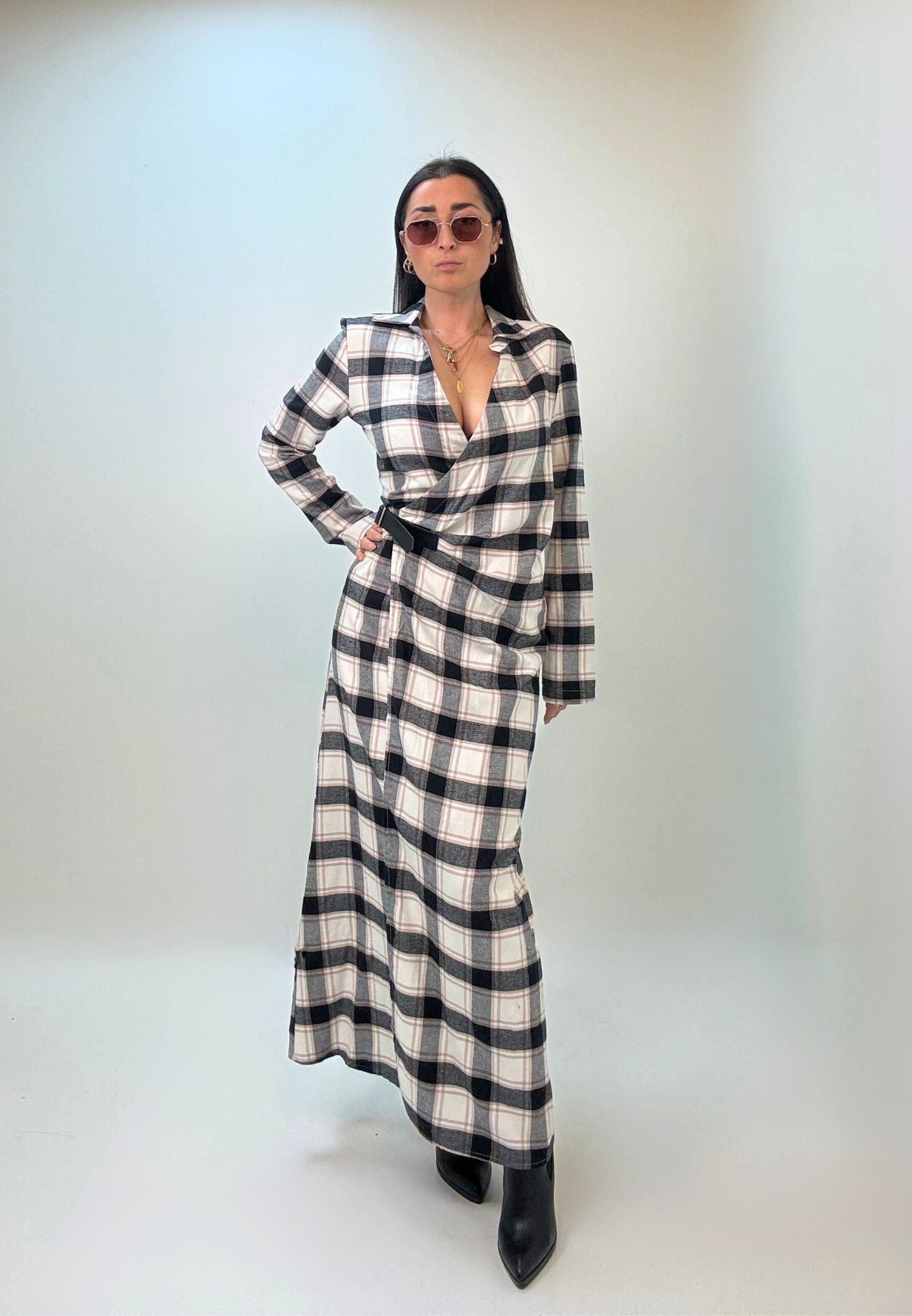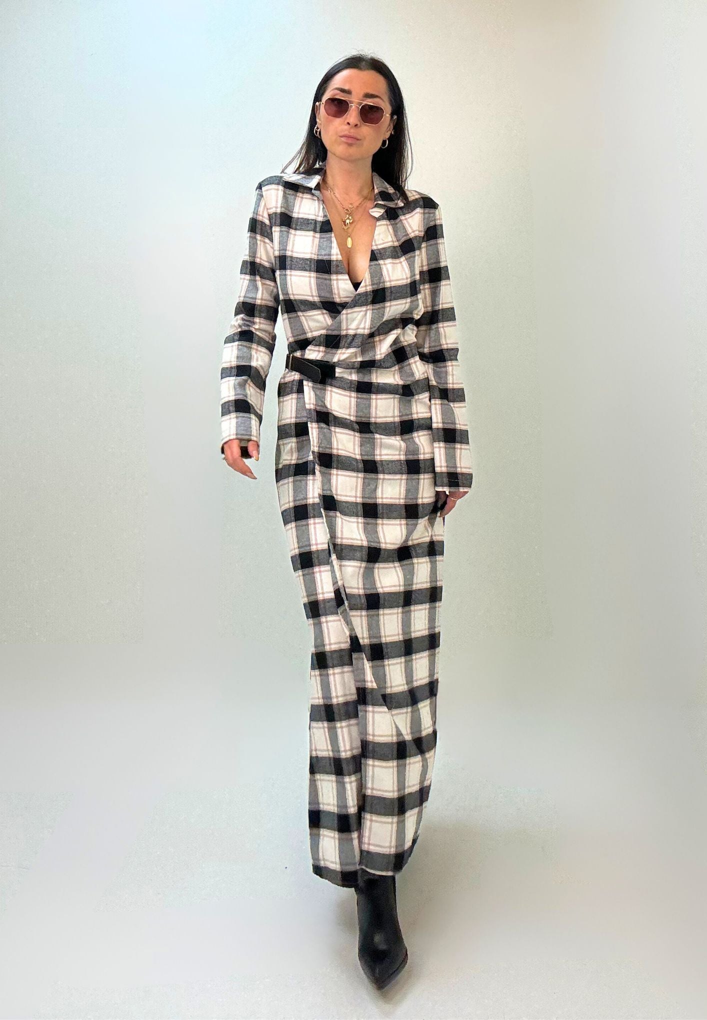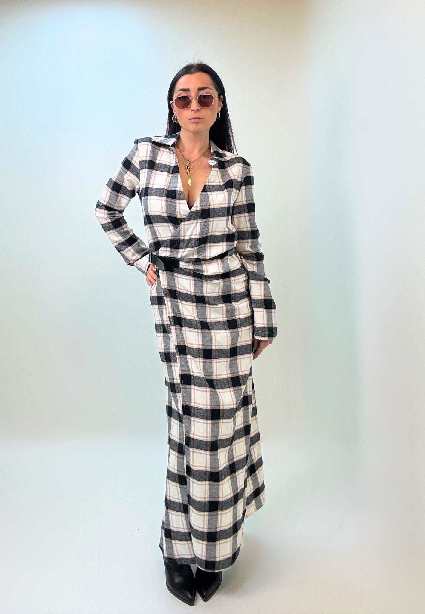 Abito a portafoglio in 100% cotone caldo, chiusura con lacci interni e fibbia esterna, scollo v con colletto a camicia, dietro arricciato sul punto vita. Ideale da insdossare con anfibi o stivaletti.