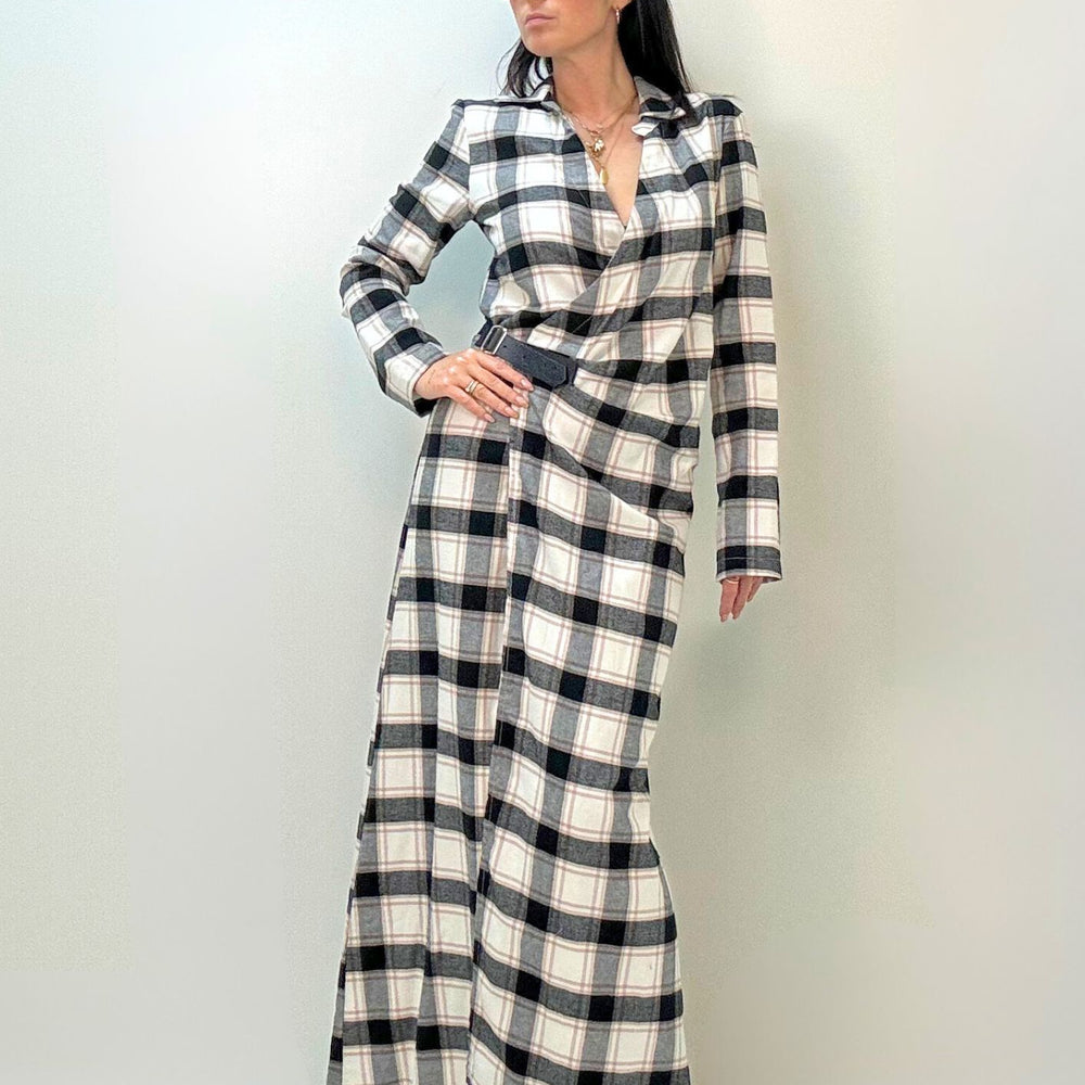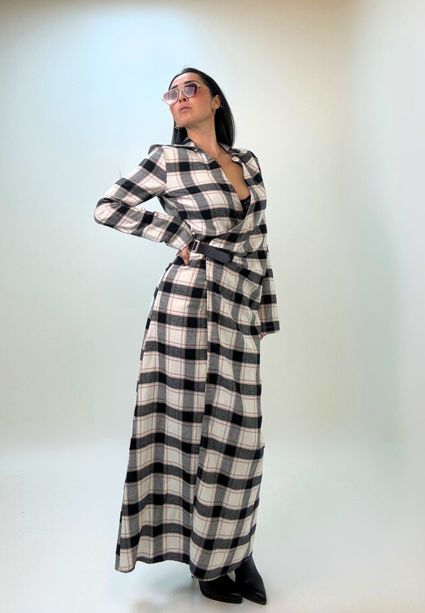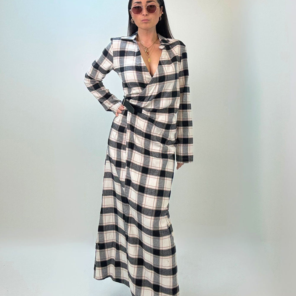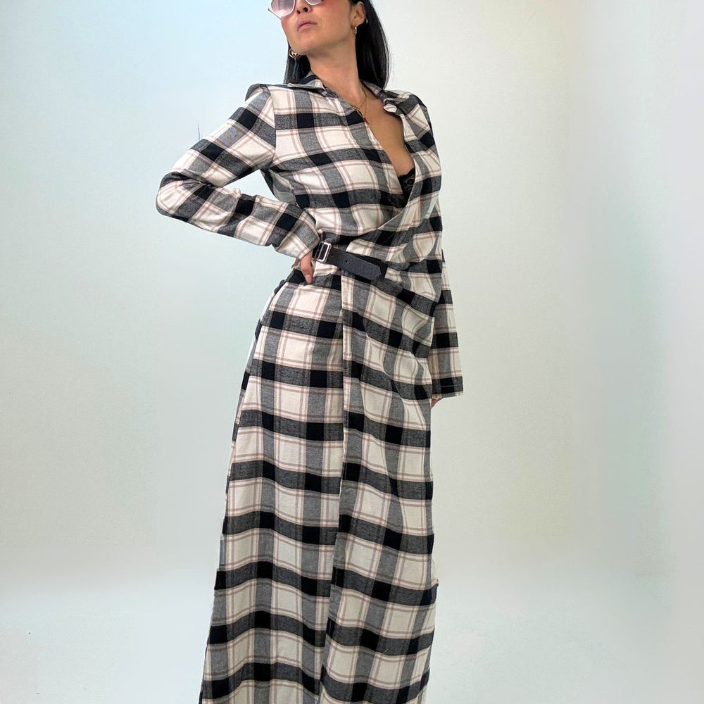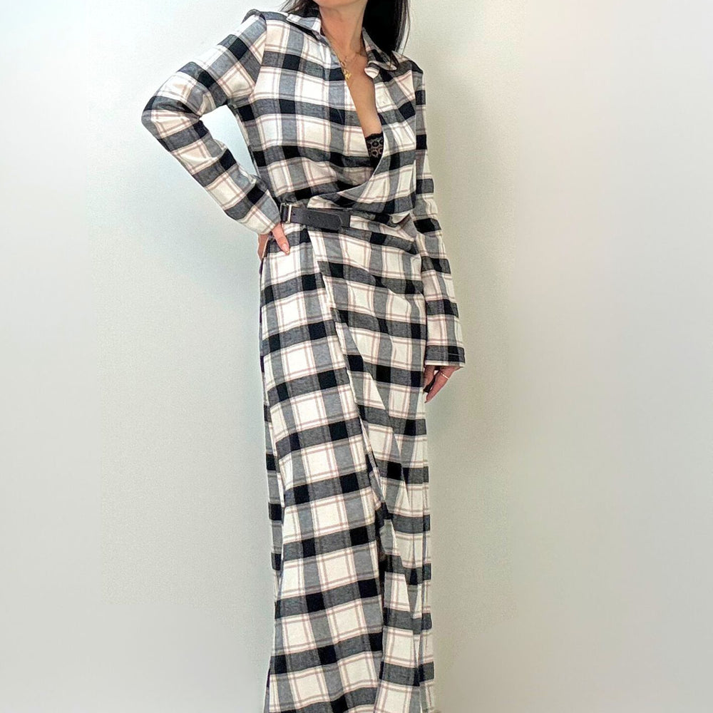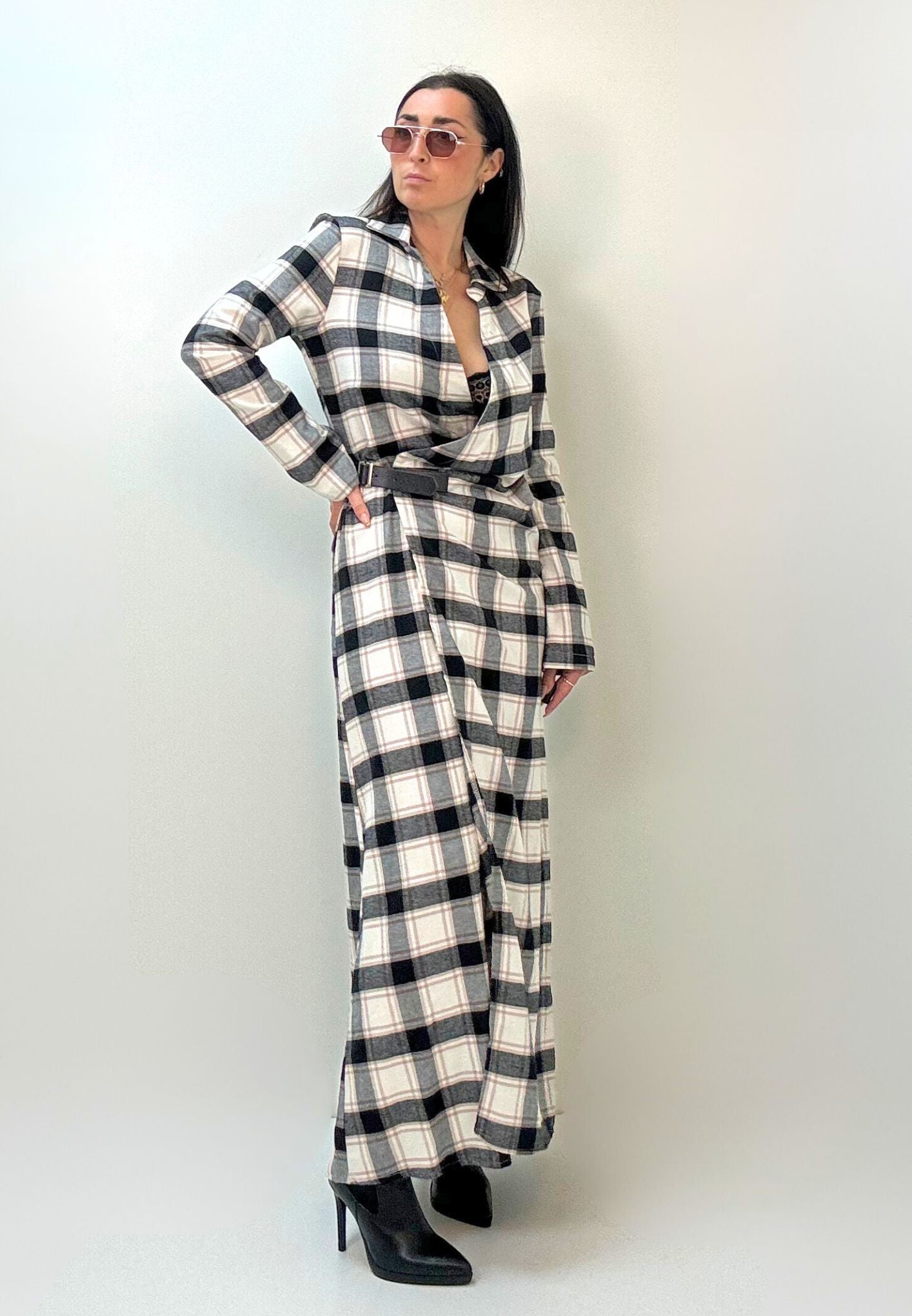 Abito a portafoglio in 100% cotone caldo, chiusura con lacci interni e fibbia esterna, scollo v con colletto a camicia, dietro arricciato sul punto vita. Ideale da insdossare con anfibi o stivaletti.