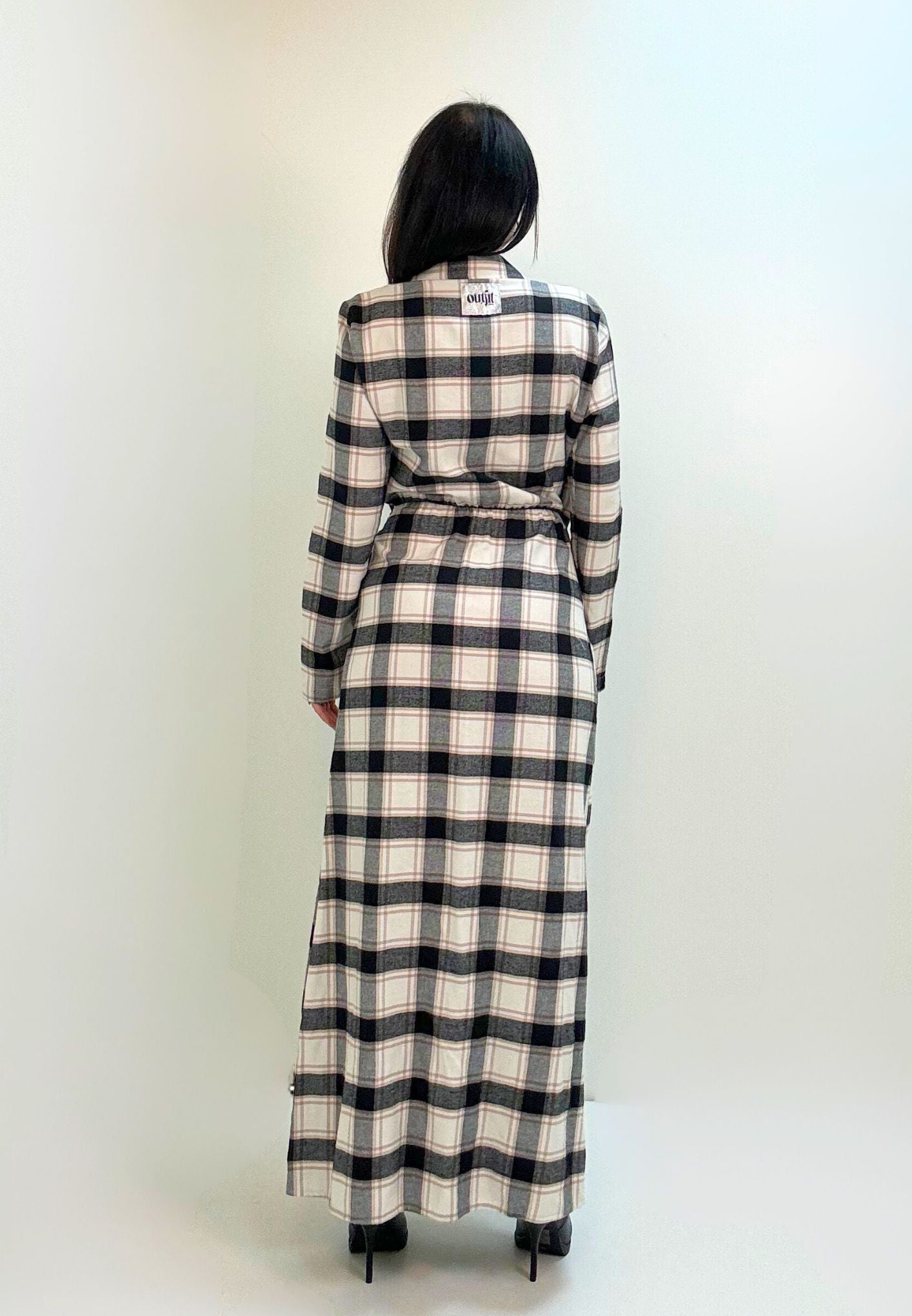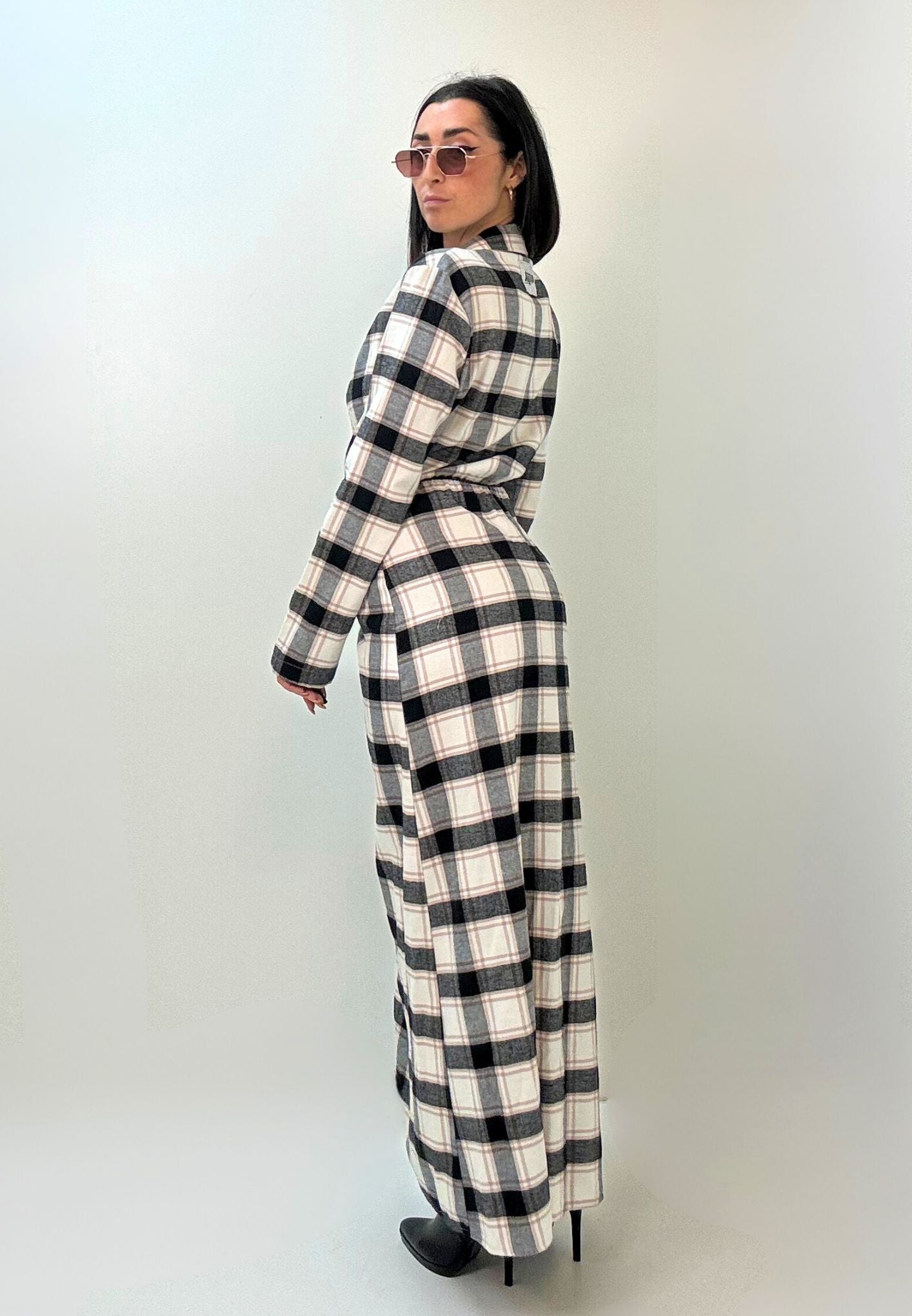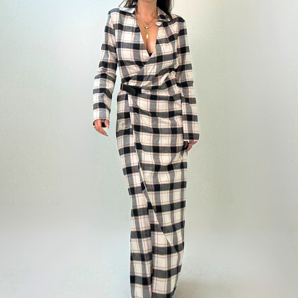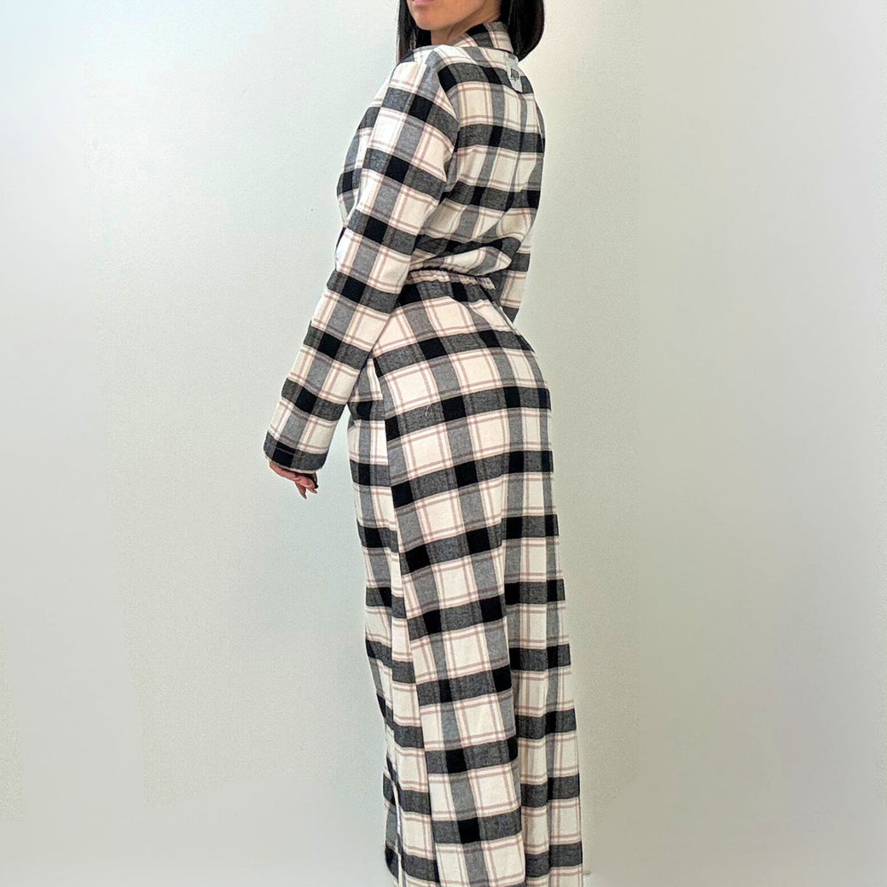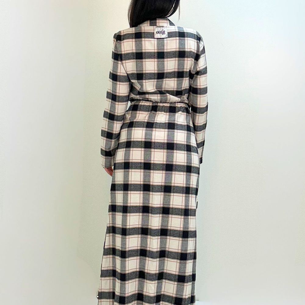 Abito a portafoglio in 100% cotone caldo, chiusura con lacci interni e fibbia esterna, scollo v con colletto a camicia, dietro arricciato sul punto vita. Ideale da insdossare con anfibi o stivaletti.