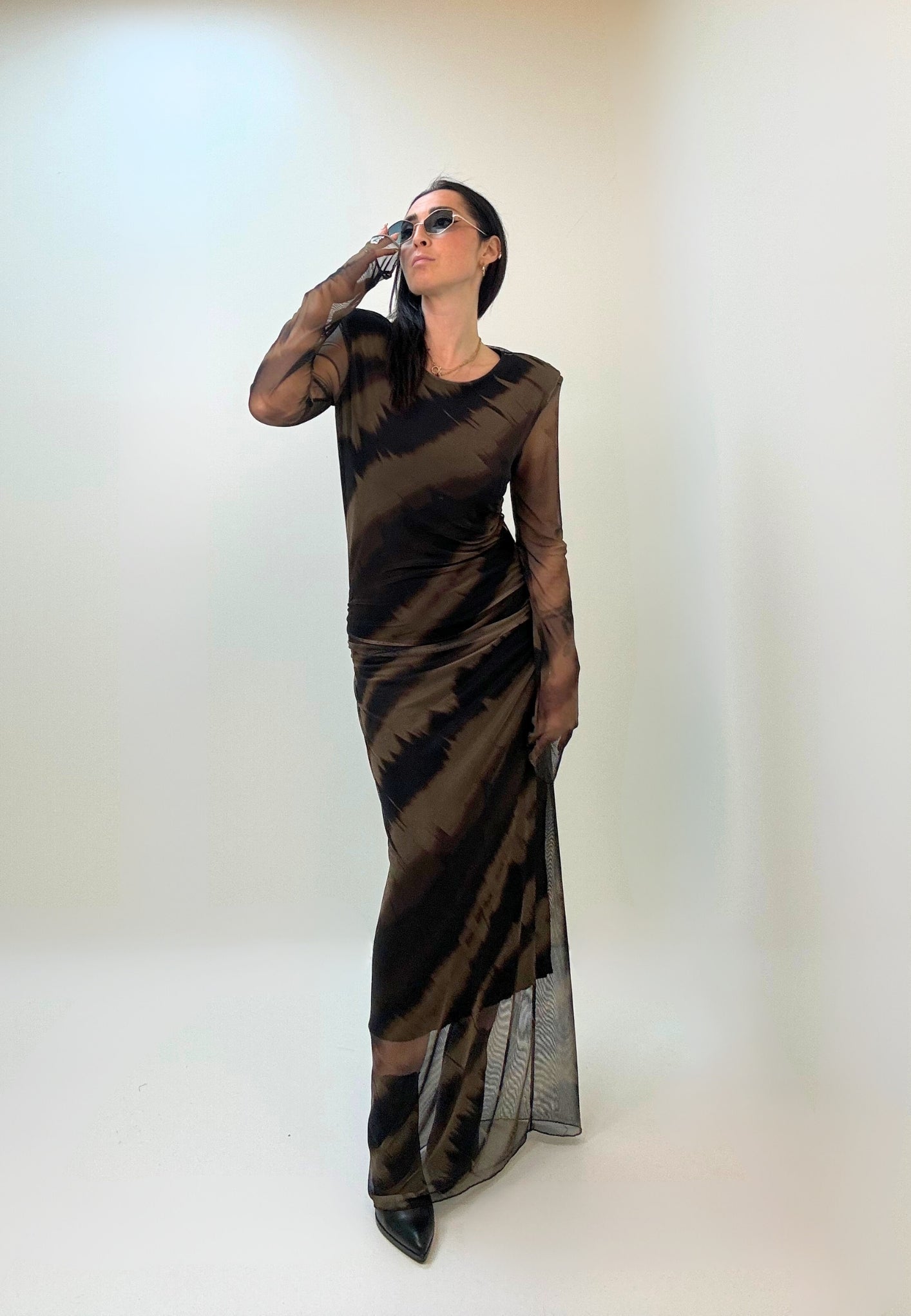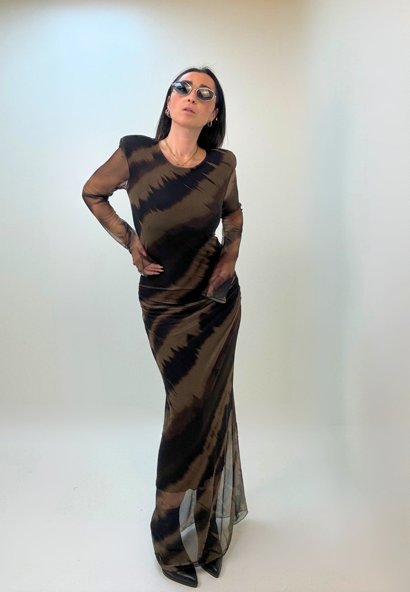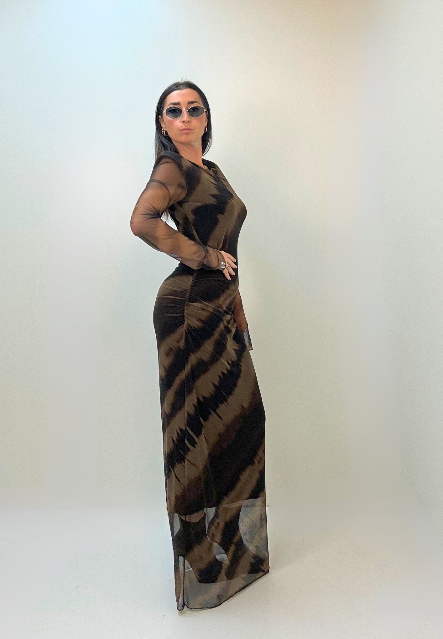 Abito lungo in tulle stampato, foderato di jersey con maniche trasparenti, spalline e arricciatura su fianchi. Veste dalla taglia S alla taglia L.