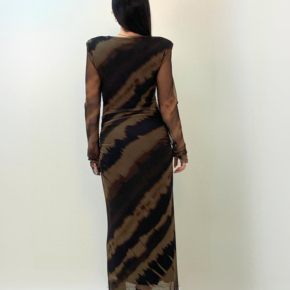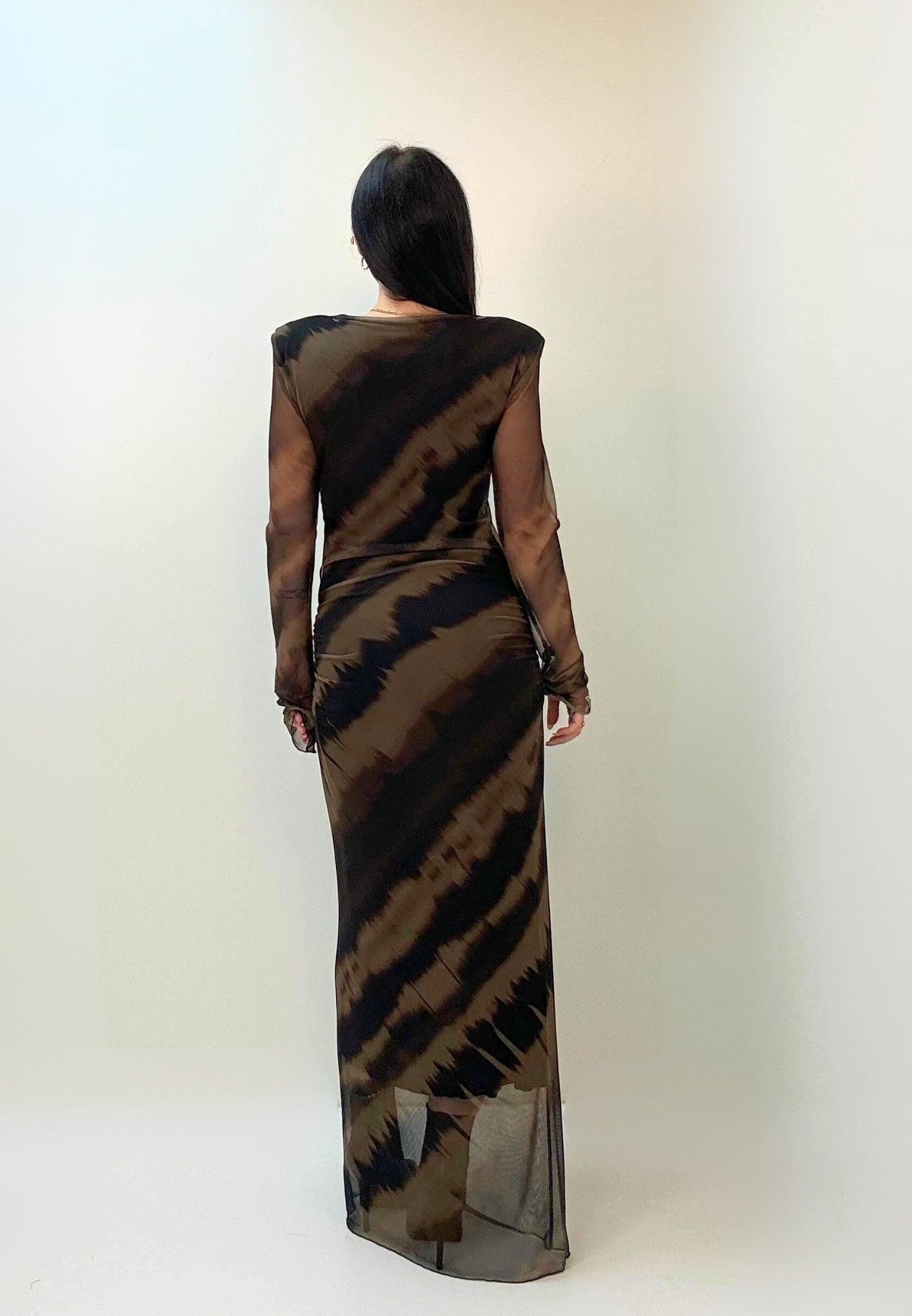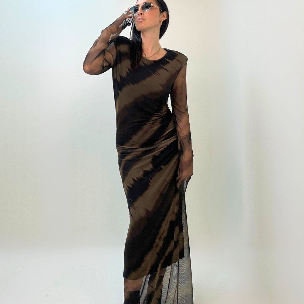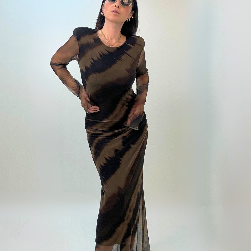 Abito lungo in tulle stampato, foderato di jersey con maniche trasparenti, spalline e arricciatura su fianchi. Veste dalla taglia S alla taglia L.