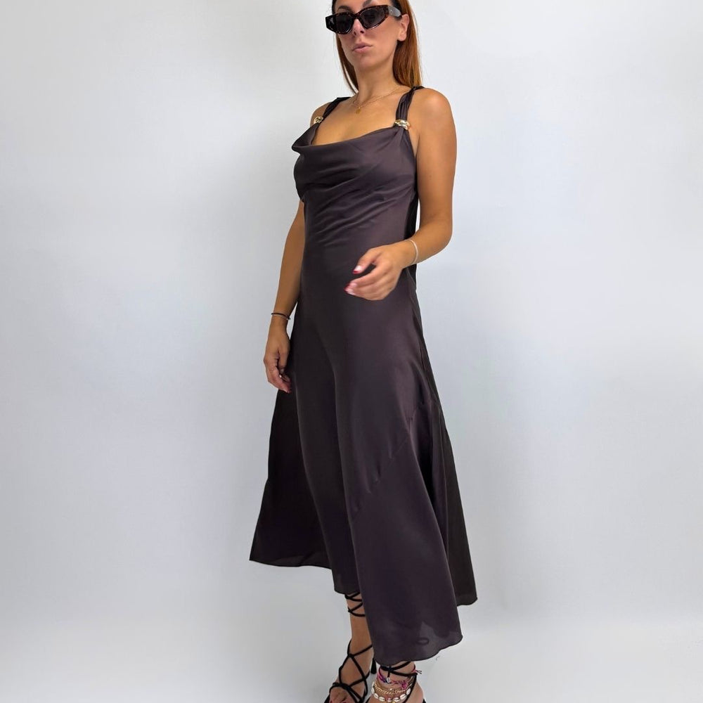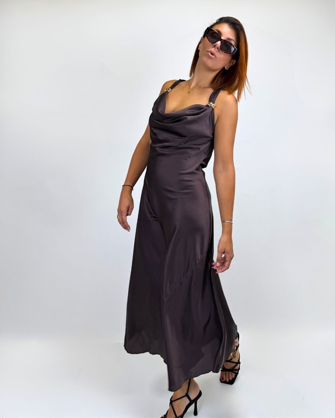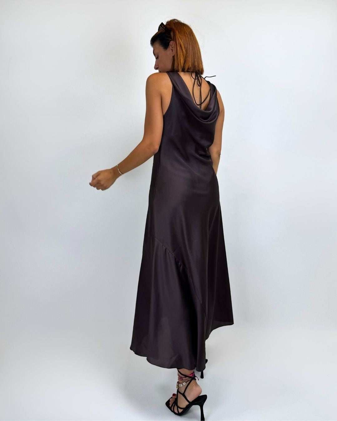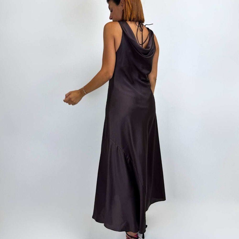 Abito lungo in tessuto lucido elasticizzato, scollo a goccia davanti e dietro regolabile con un laccino da chiudere a fiocco sulle spalle. Ideale per cerimonie e eventi eleganti. Veste dalla taglia XS alla taglia L