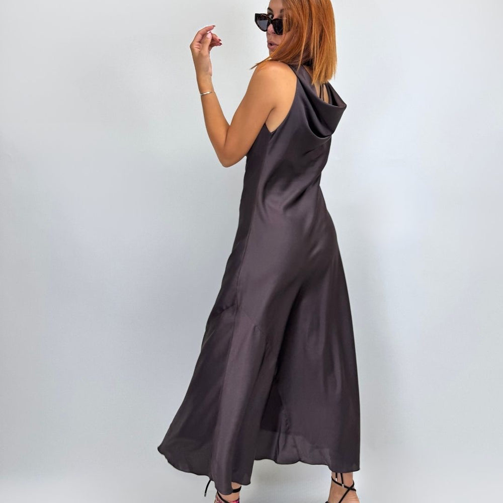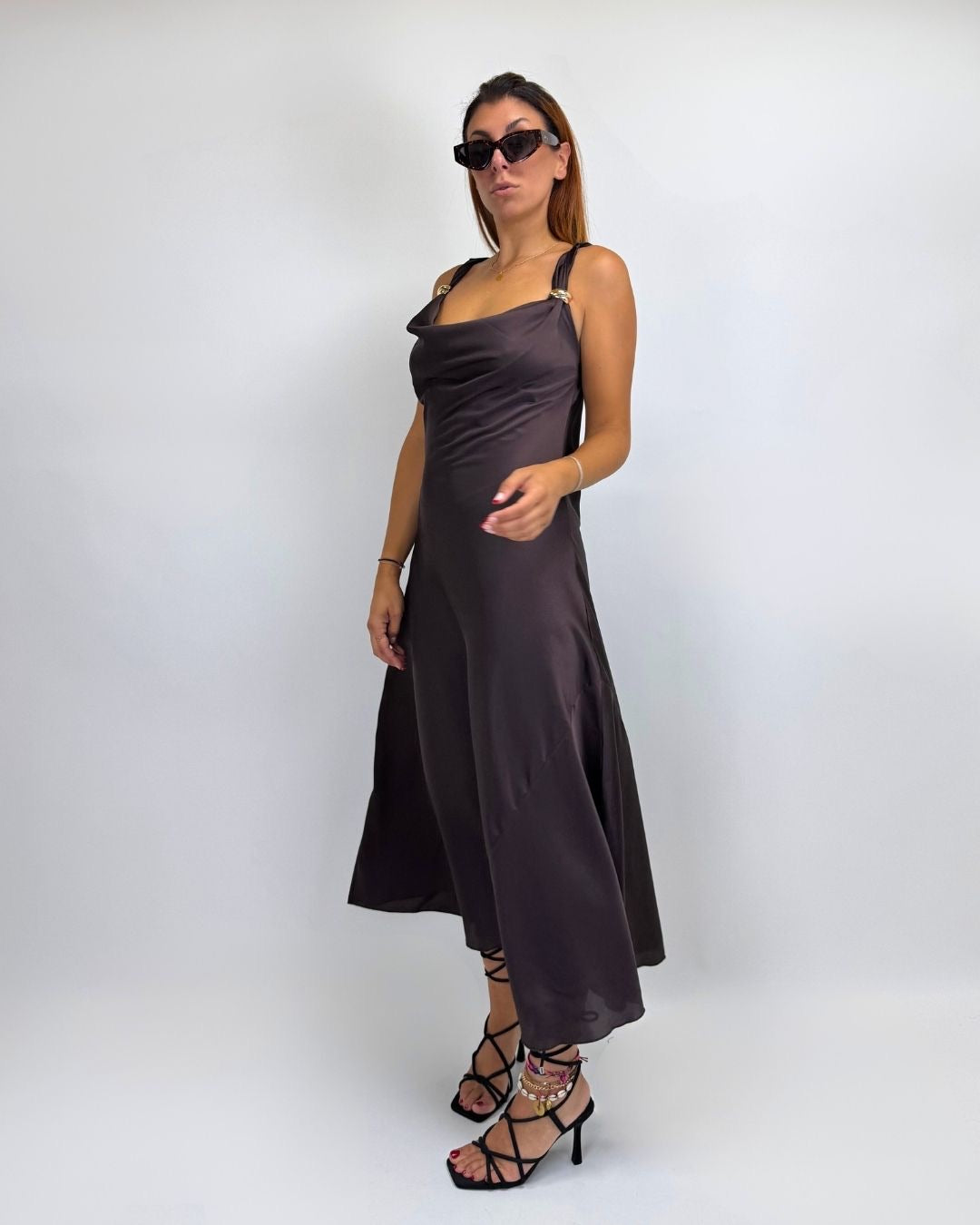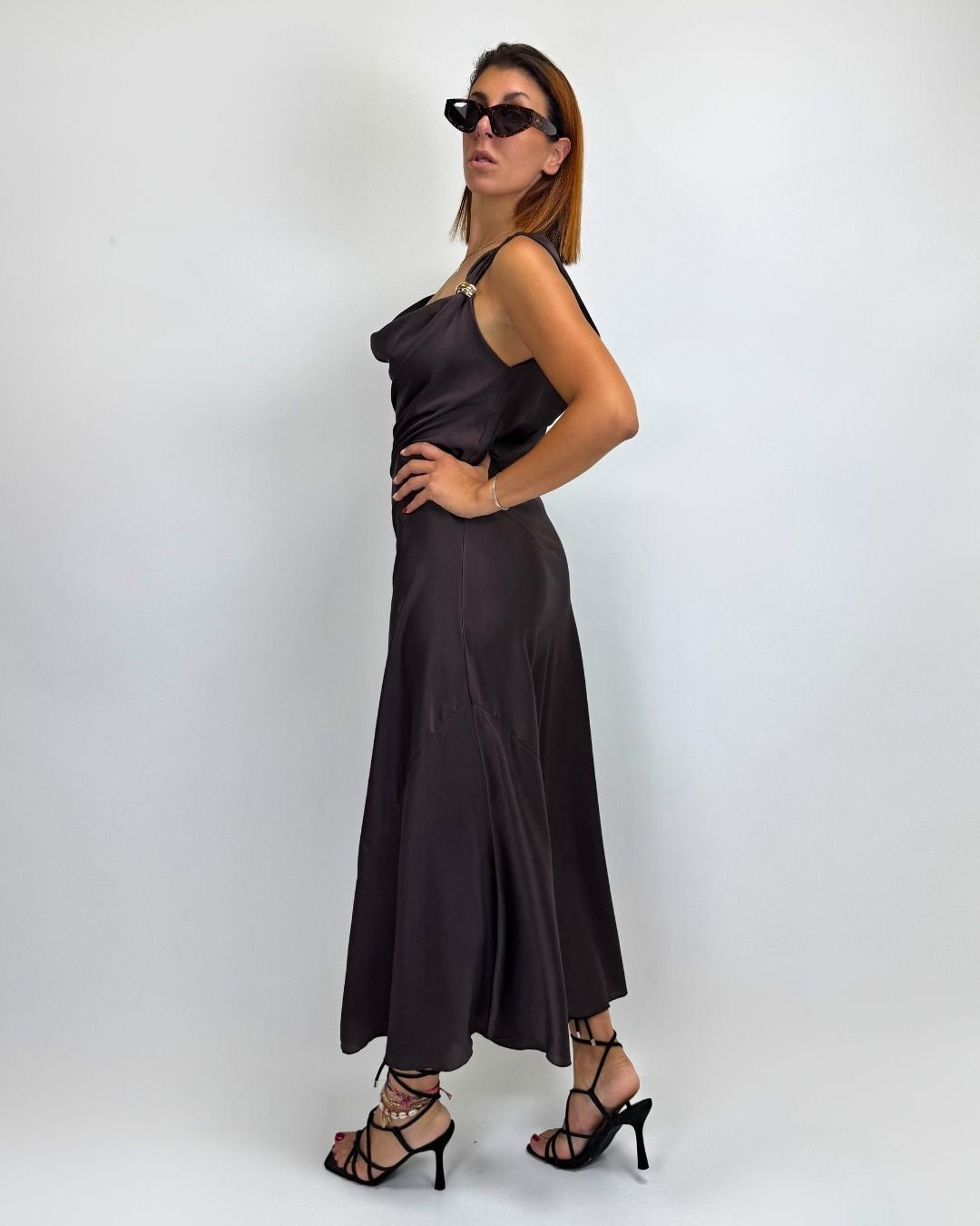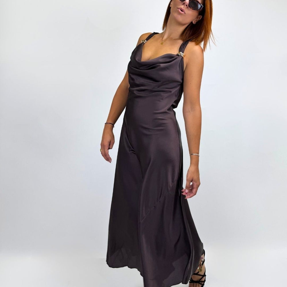 Abito lungo in tessuto lucido elasticizzato, scollo a goccia davanti e dietro regolabile con un laccino da chiudere a fiocco sulle spalle. Ideale per cerimonie e eventi eleganti. Veste dalla taglia XS alla taglia L