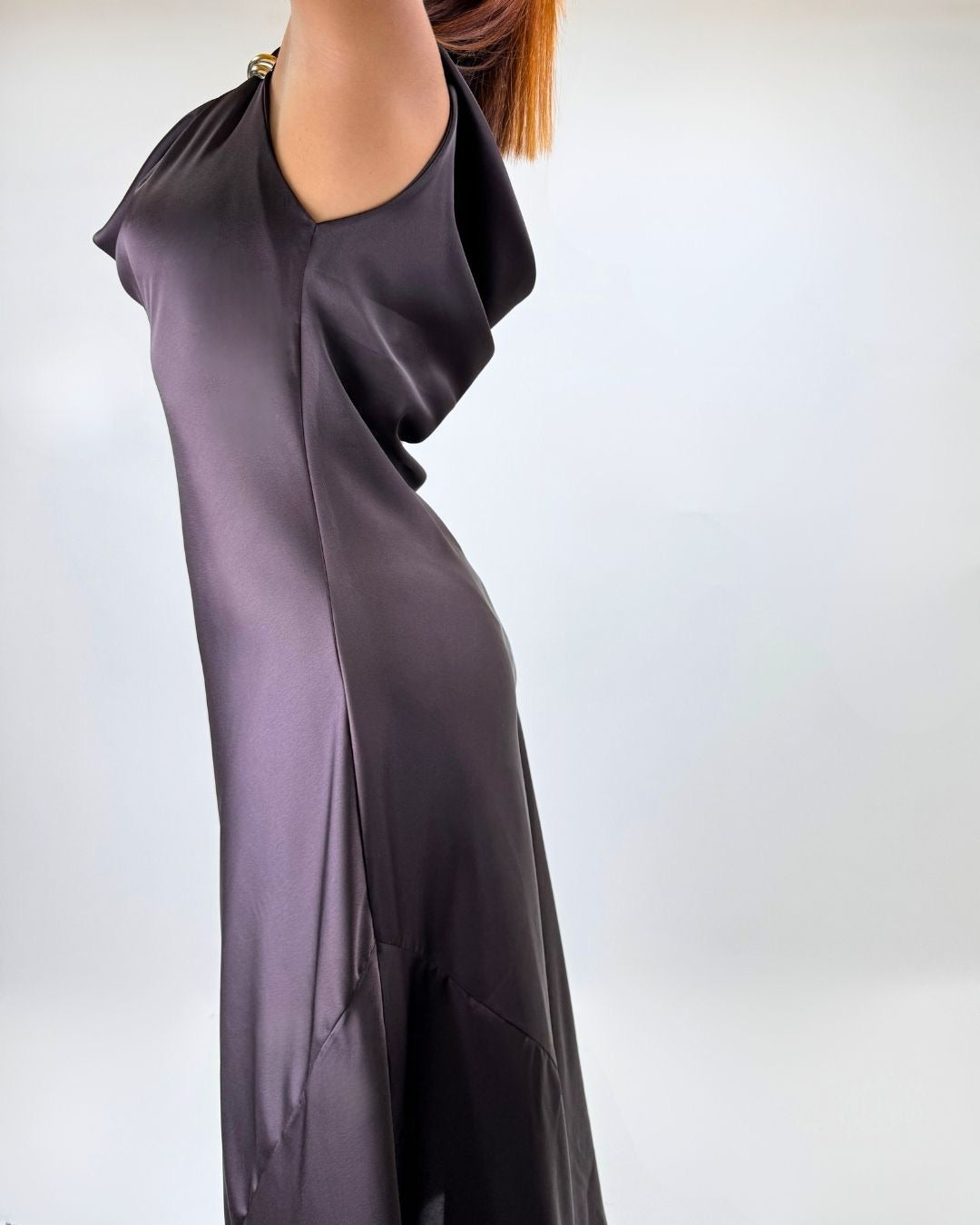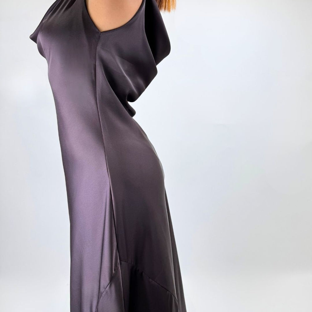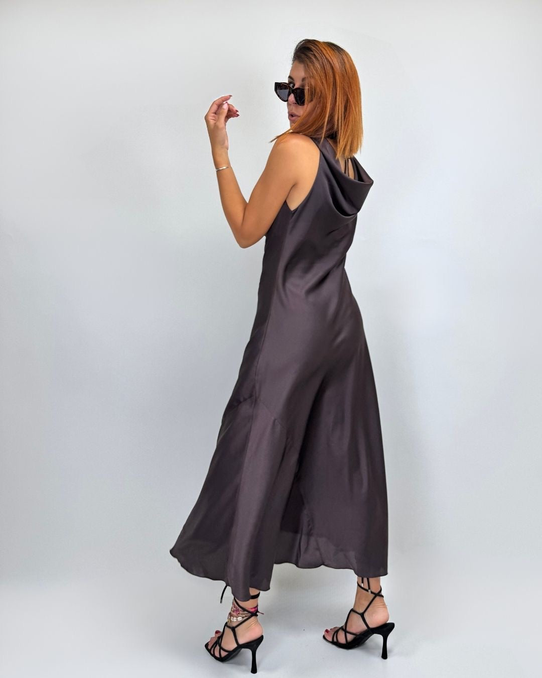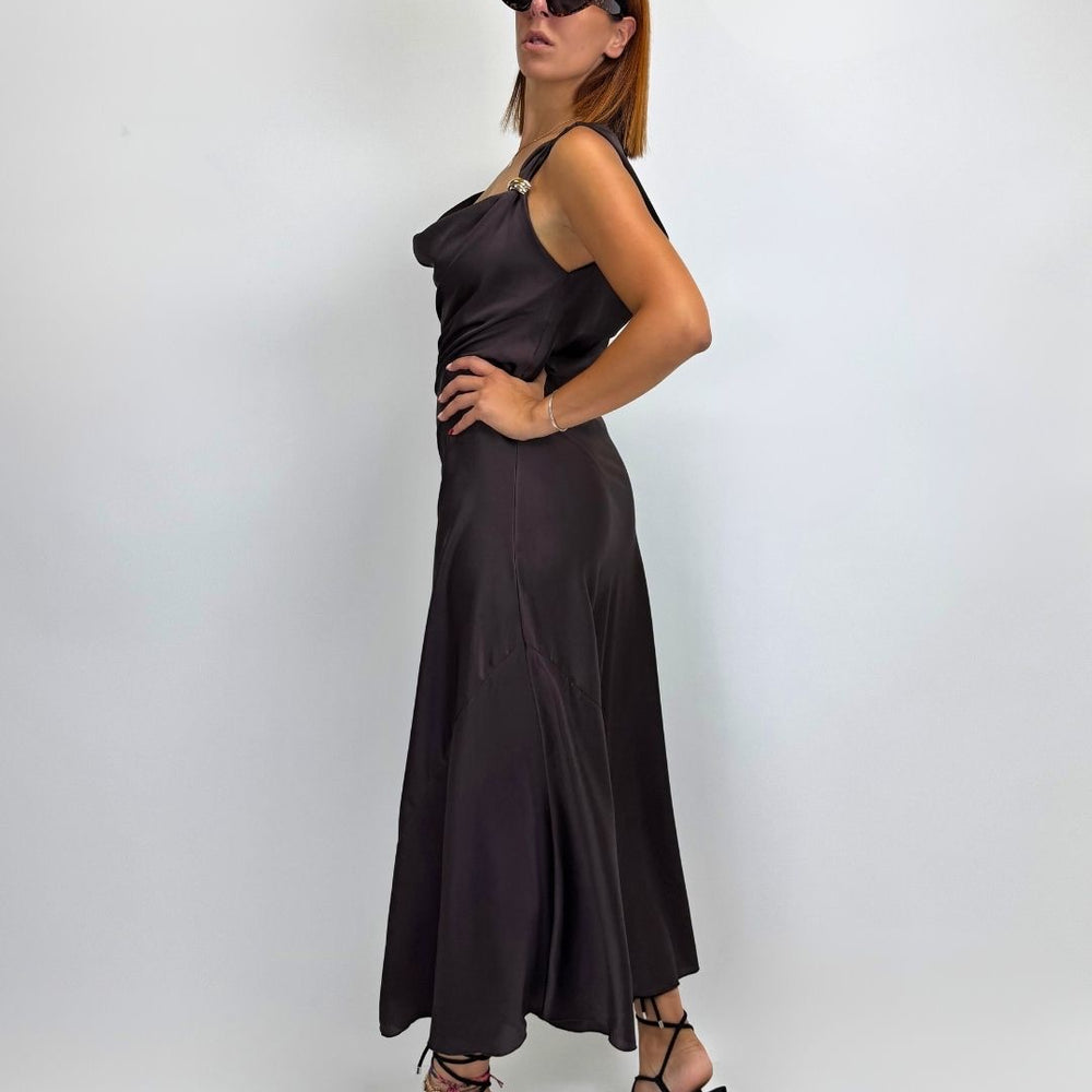 Abito lungo in tessuto lucido elasticizzato, scollo a goccia davanti e dietro regolabile con un laccino da chiudere a fiocco sulle spalle. Ideale per cerimonie e eventi eleganti. Veste dalla taglia XS alla taglia L