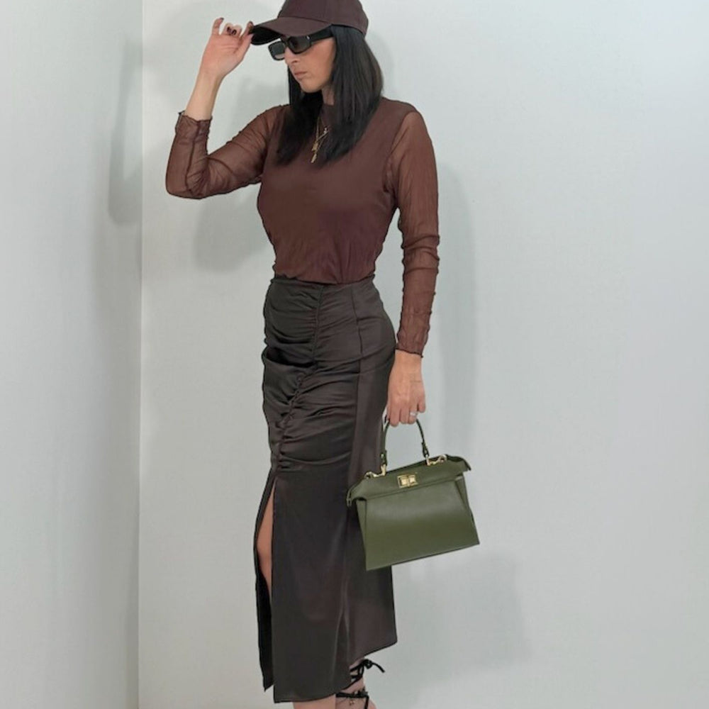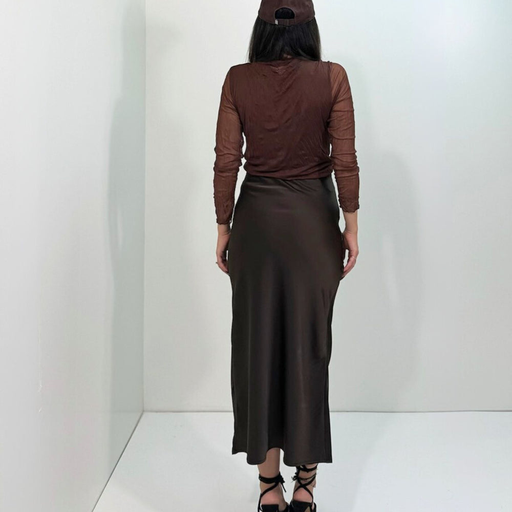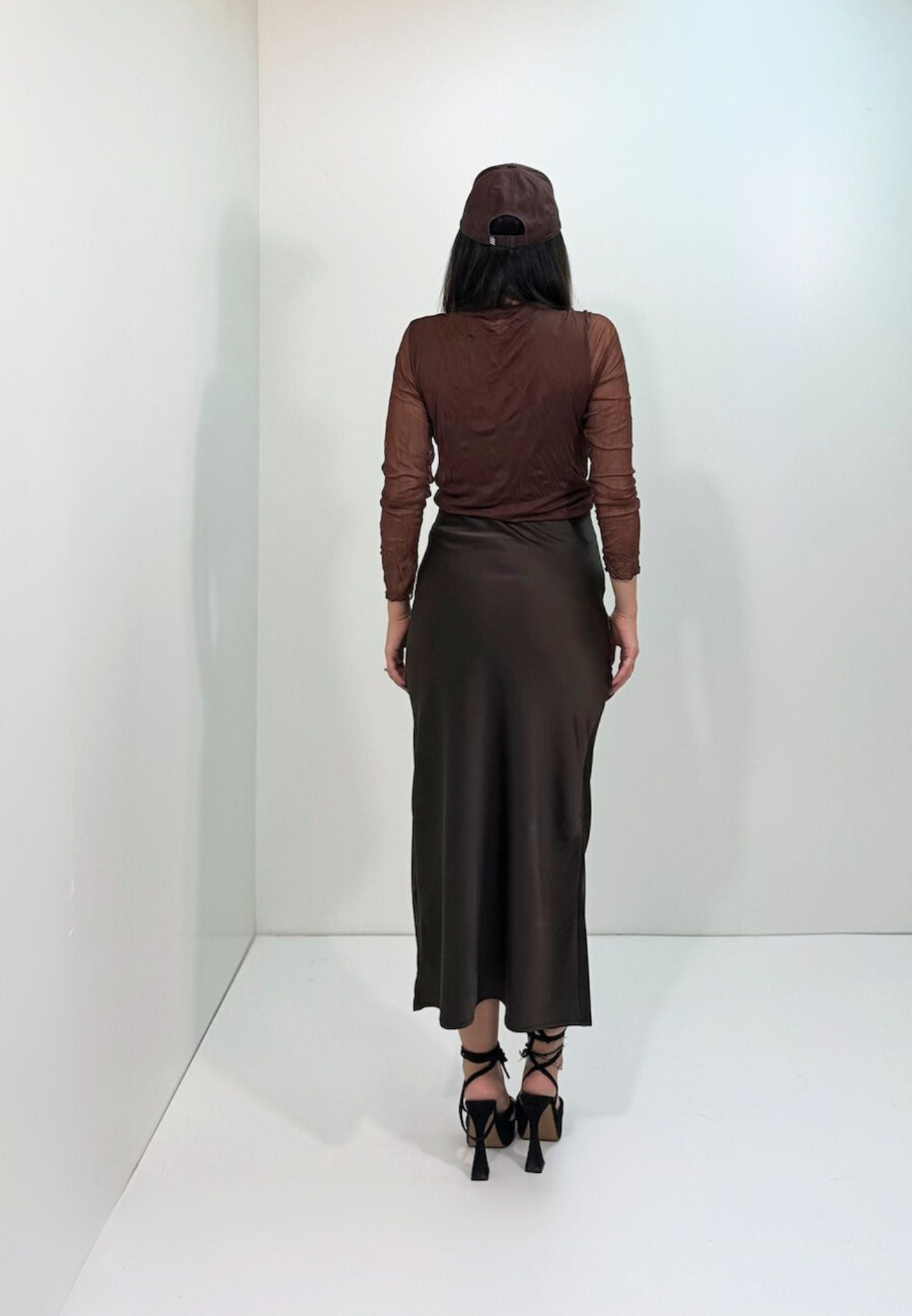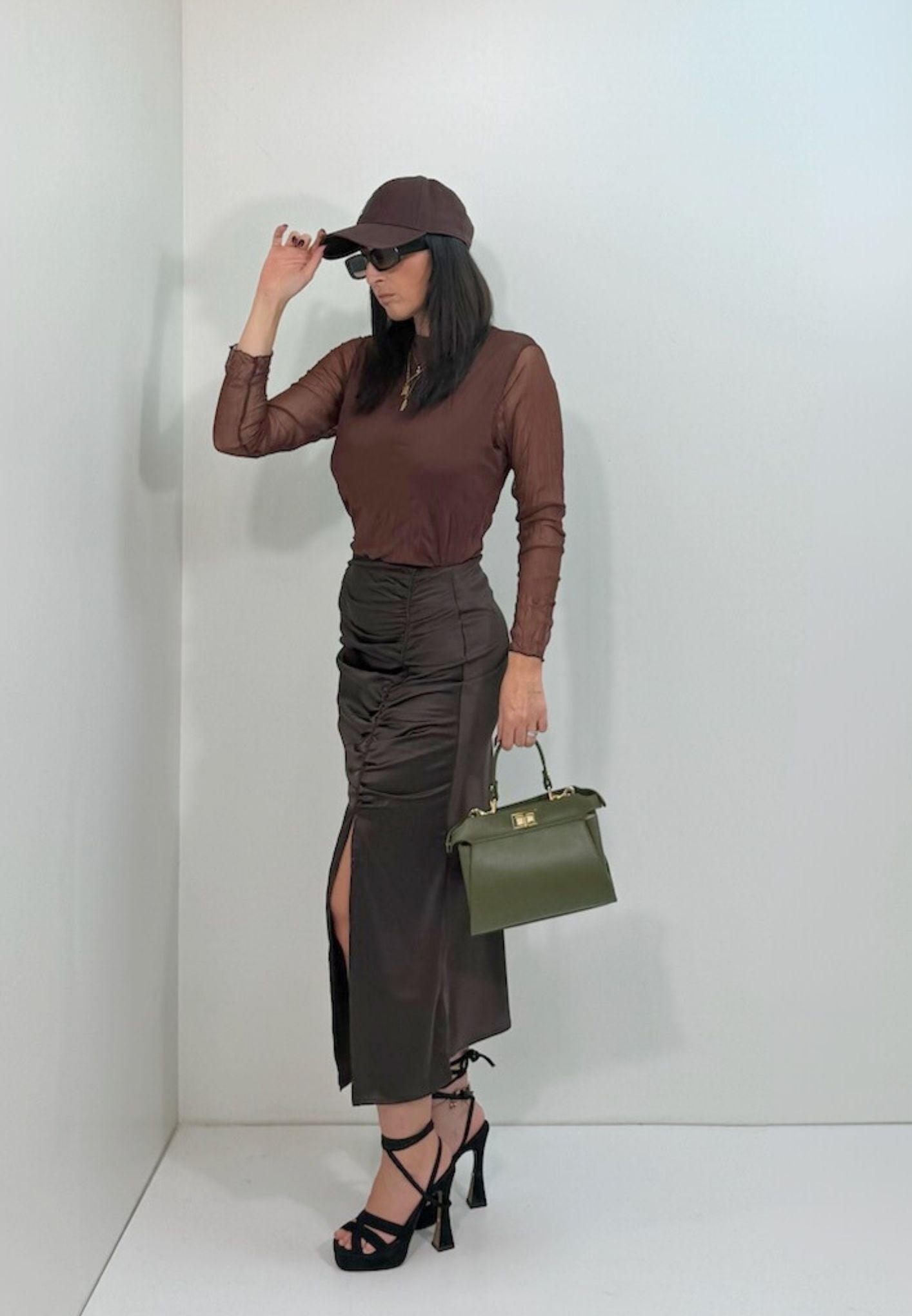 Gonna longuette in raso di viscosa con spacco laterale arricciato.