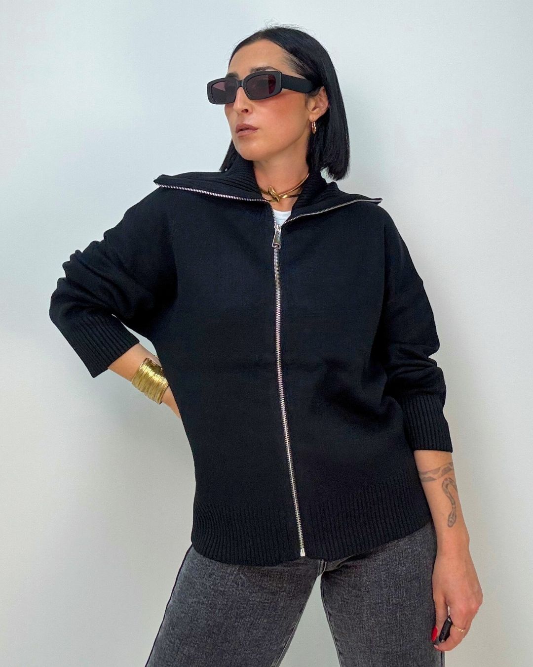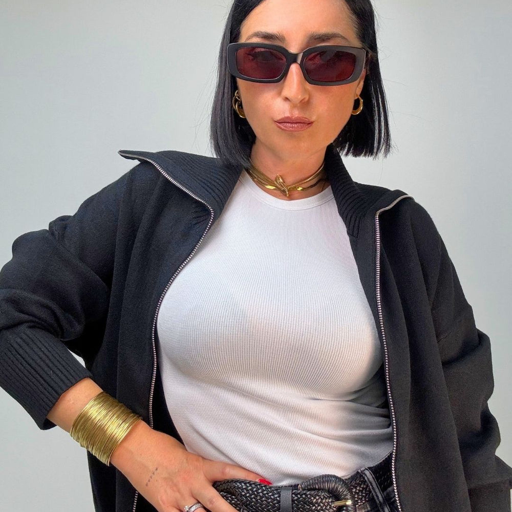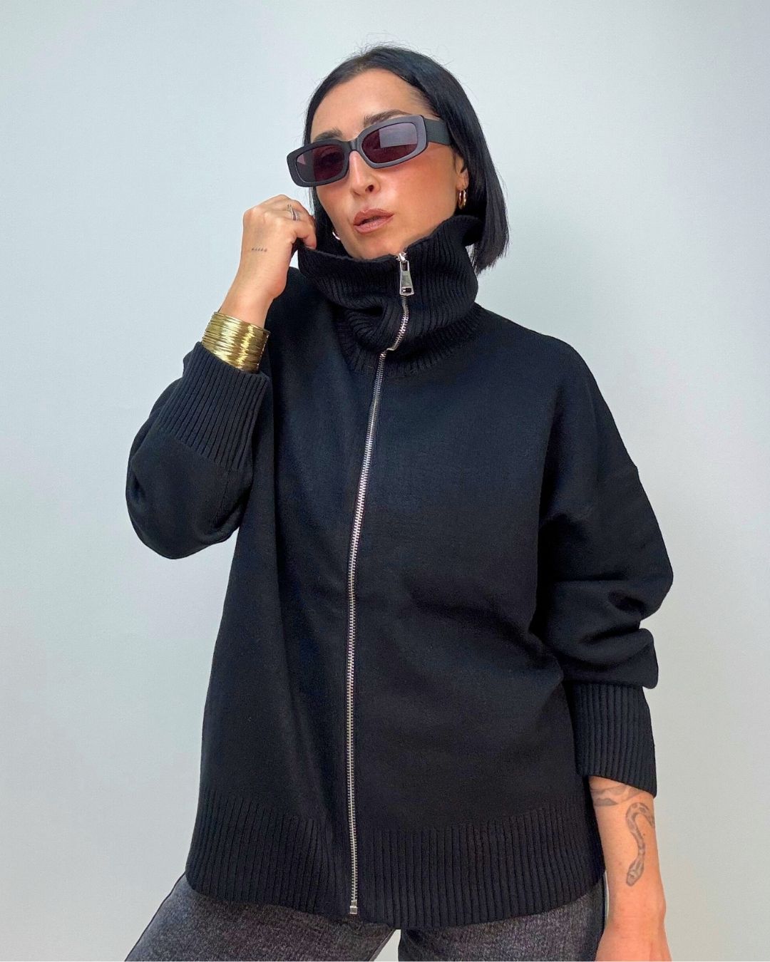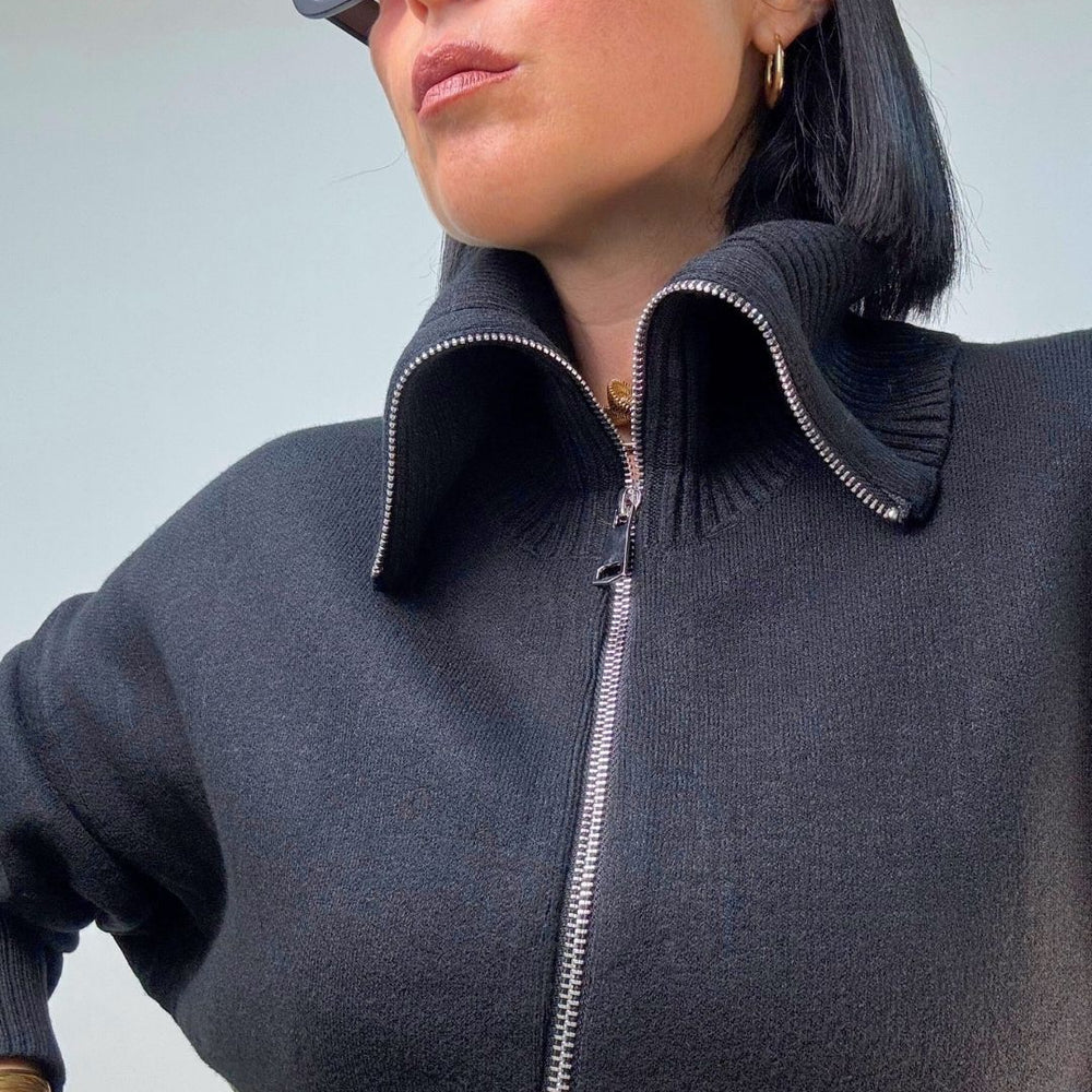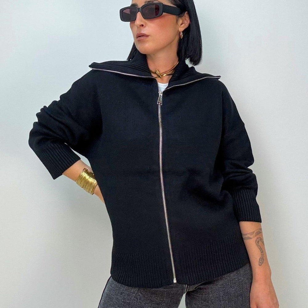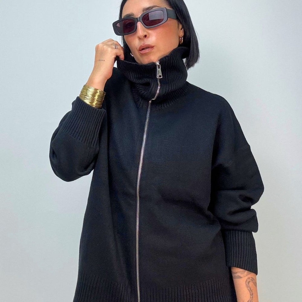Cardigan in maglia punto milano, con zip collo da portare a vela o tutto chiuso a collo alto. È ideale per le temperature più fredde, tiene molto caldo dal fit over versatile per più outfit. Veste dalla XS alla XL