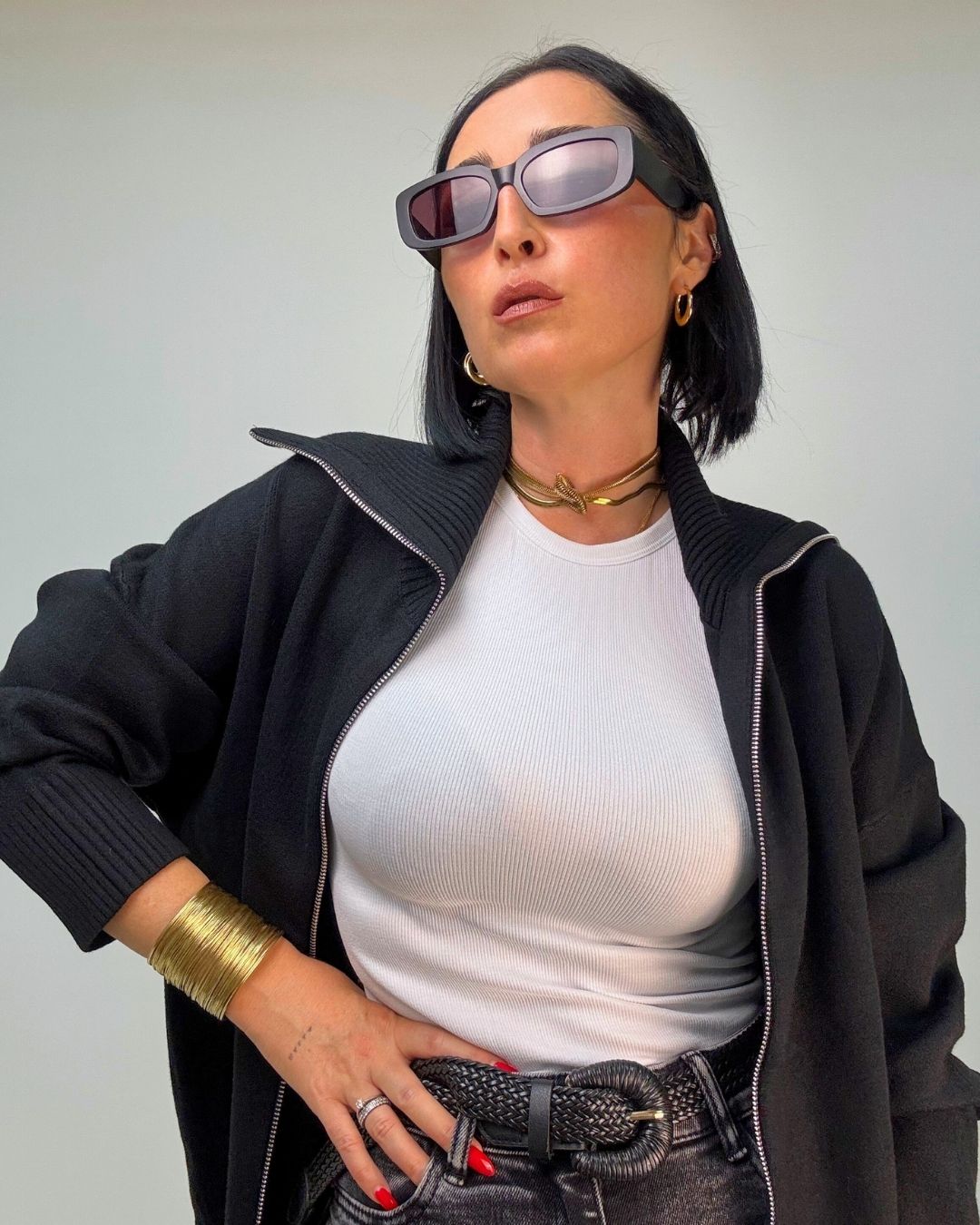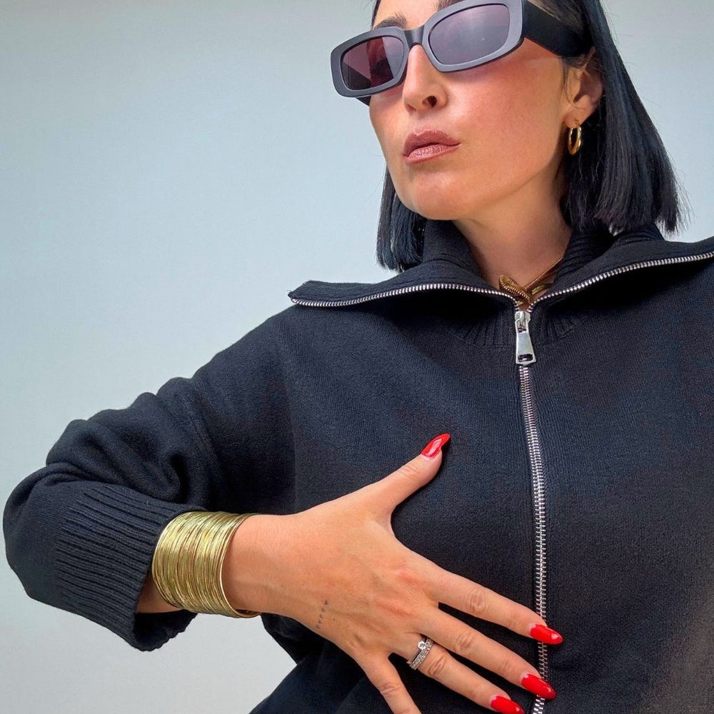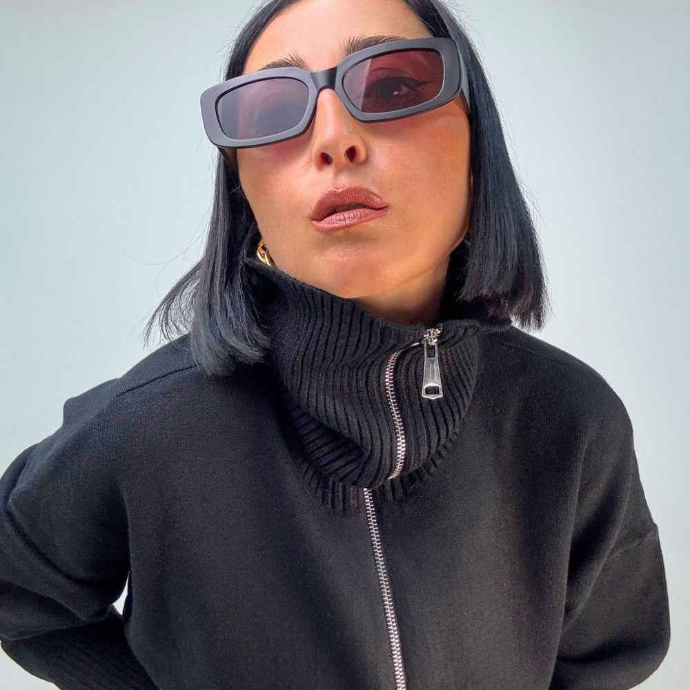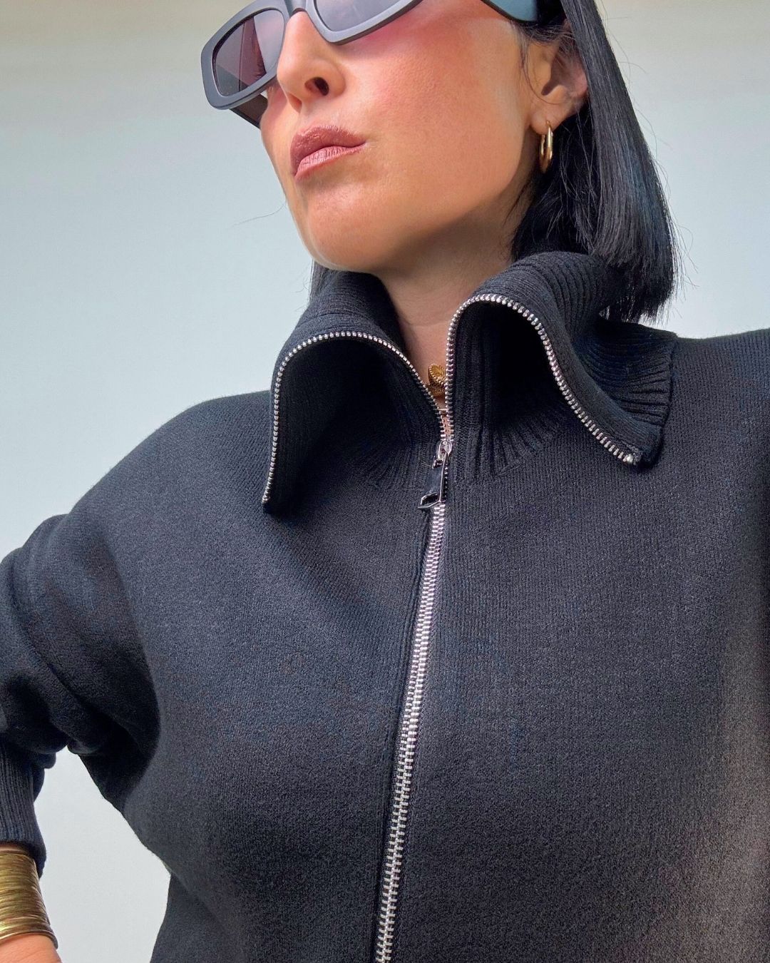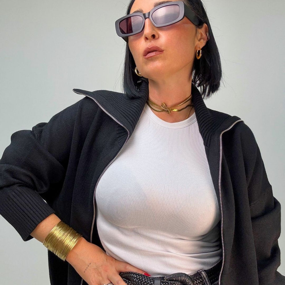 Cardigan in maglia punto milano, con zip collo da portare a vela o tutto chiuso a collo alto. È ideale per le temperature più fredde, tiene molto caldo dal fit over versatile per più outfit. Veste dalla XS alla XL