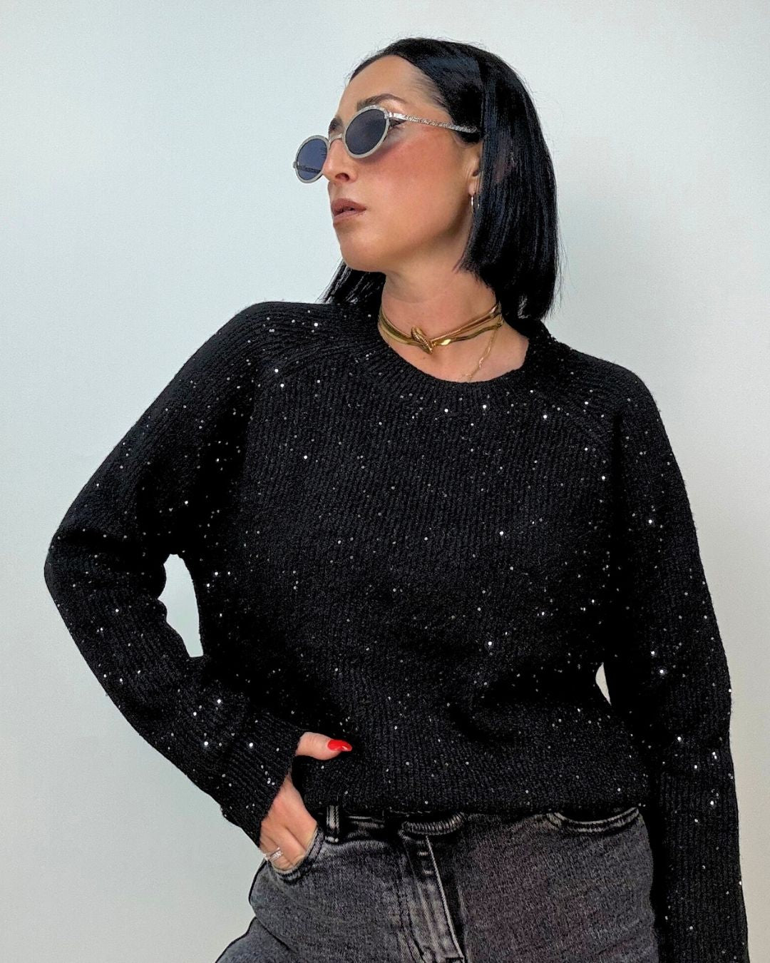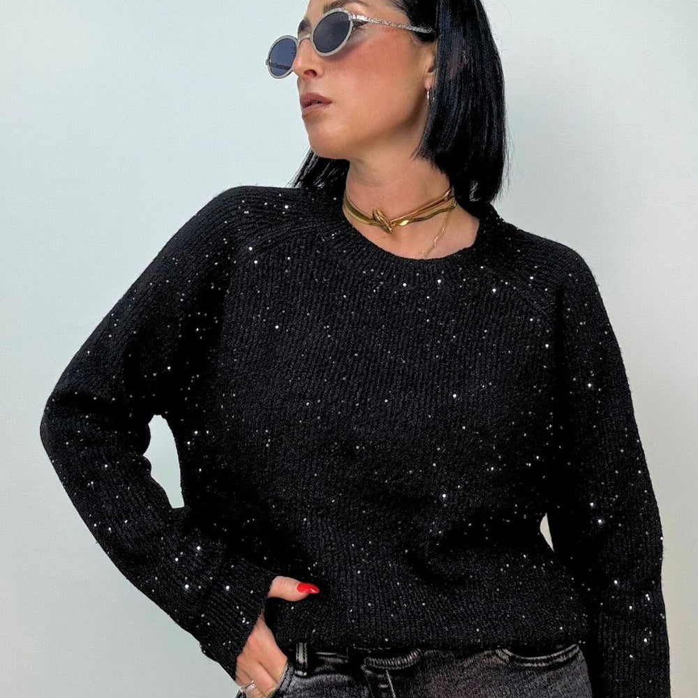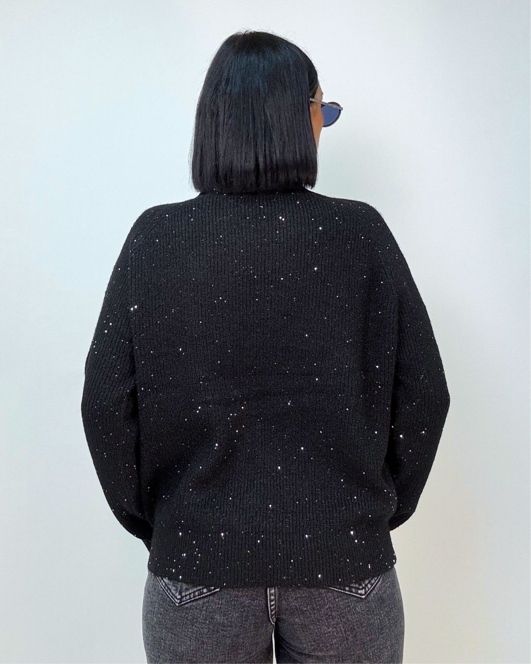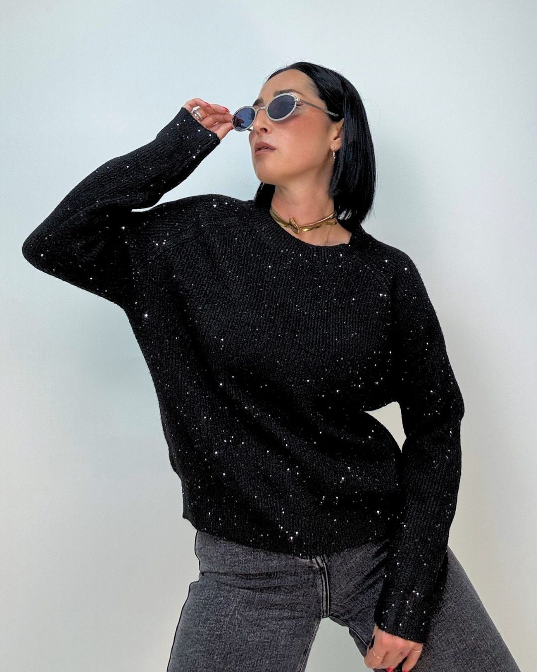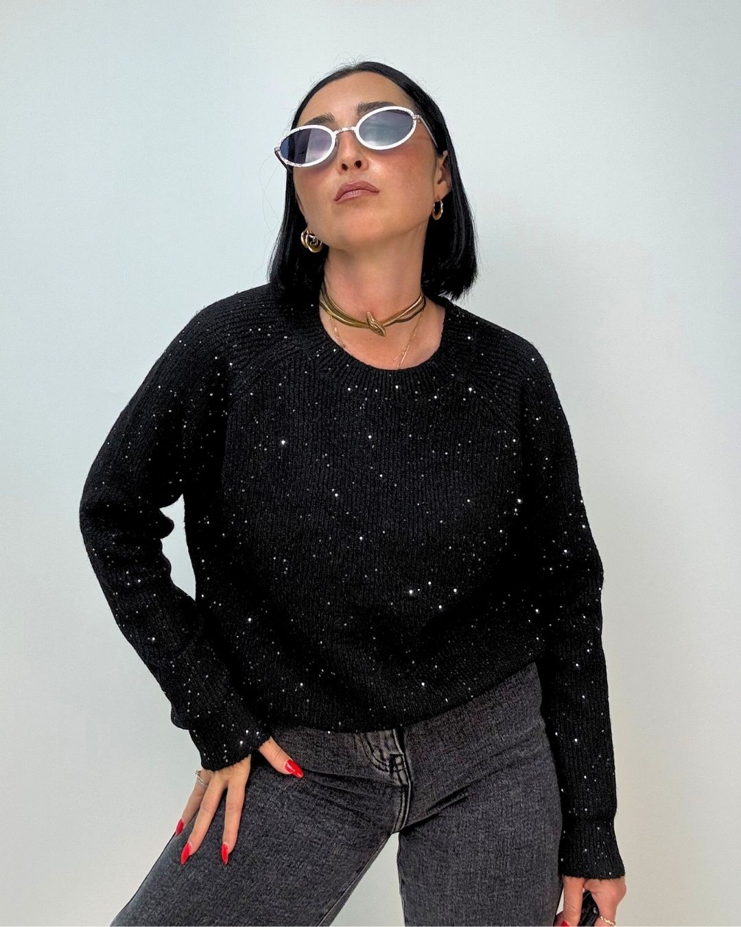 Maglia lavorata a maglia perlata con micro paillettes. Questo capo ultra brillante e molto caldo è l'ideale per chi soffre il freddo e vuole stare sempre al caldo anche nelle uscite serali più eleganti. Dal fit morbido è arricchito da micro paillettes, stupendo da indossare con jeans o gonne per le più freddolose ..un vero must della stagione!