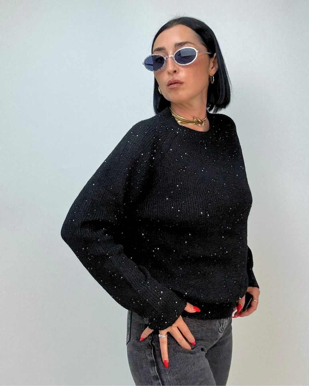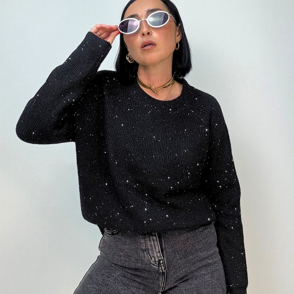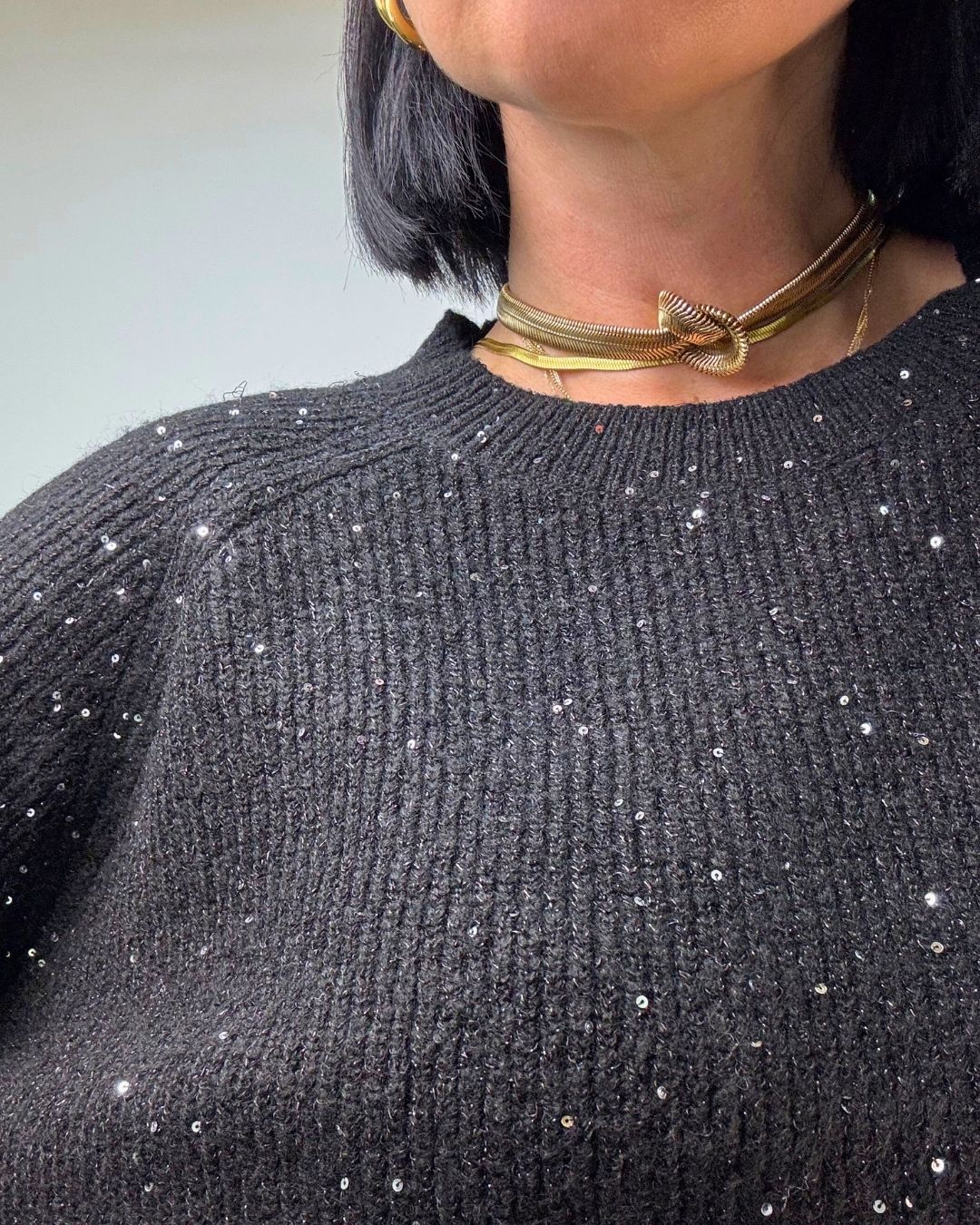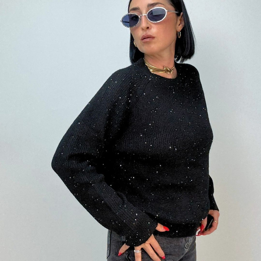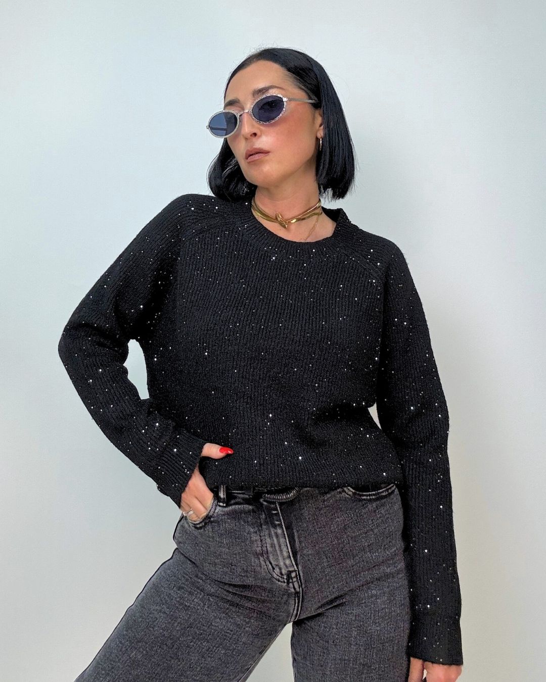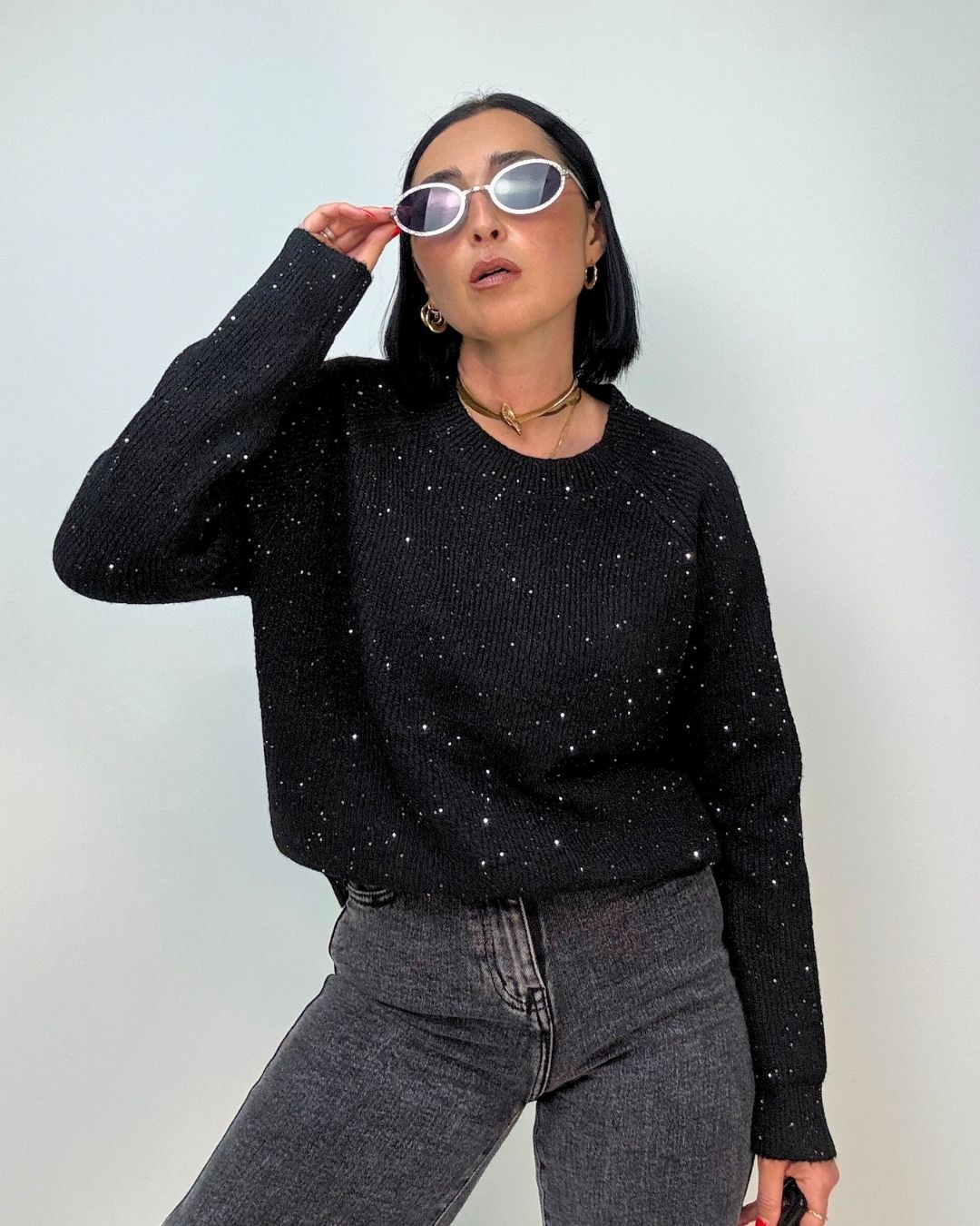 Maglia lavorata a maglia perlata con micro paillettes. Questo capo ultra brillante e molto caldo è l'ideale per chi soffre il freddo e vuole stare sempre al caldo anche nelle uscite serali più eleganti. Dal fit morbido è arricchito da micro paillettes, stupendo da indossare con jeans o gonne per le più freddolose ..un vero must della stagione!