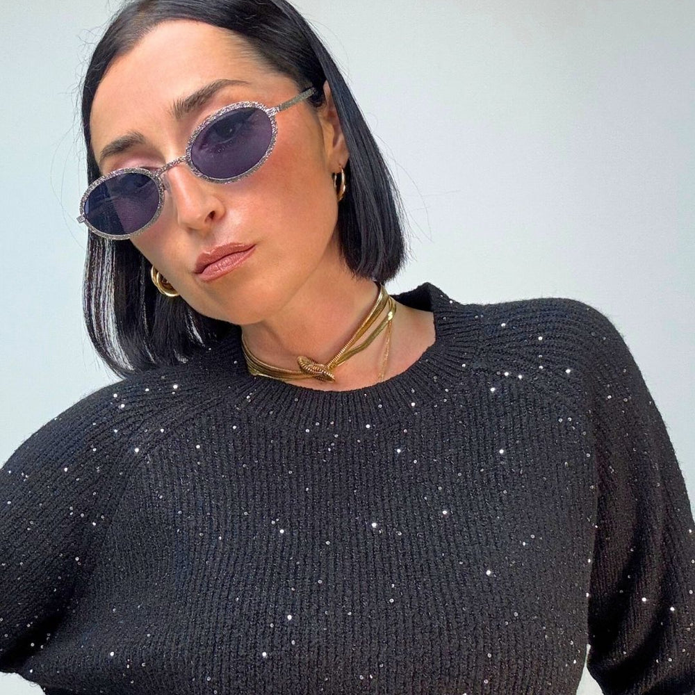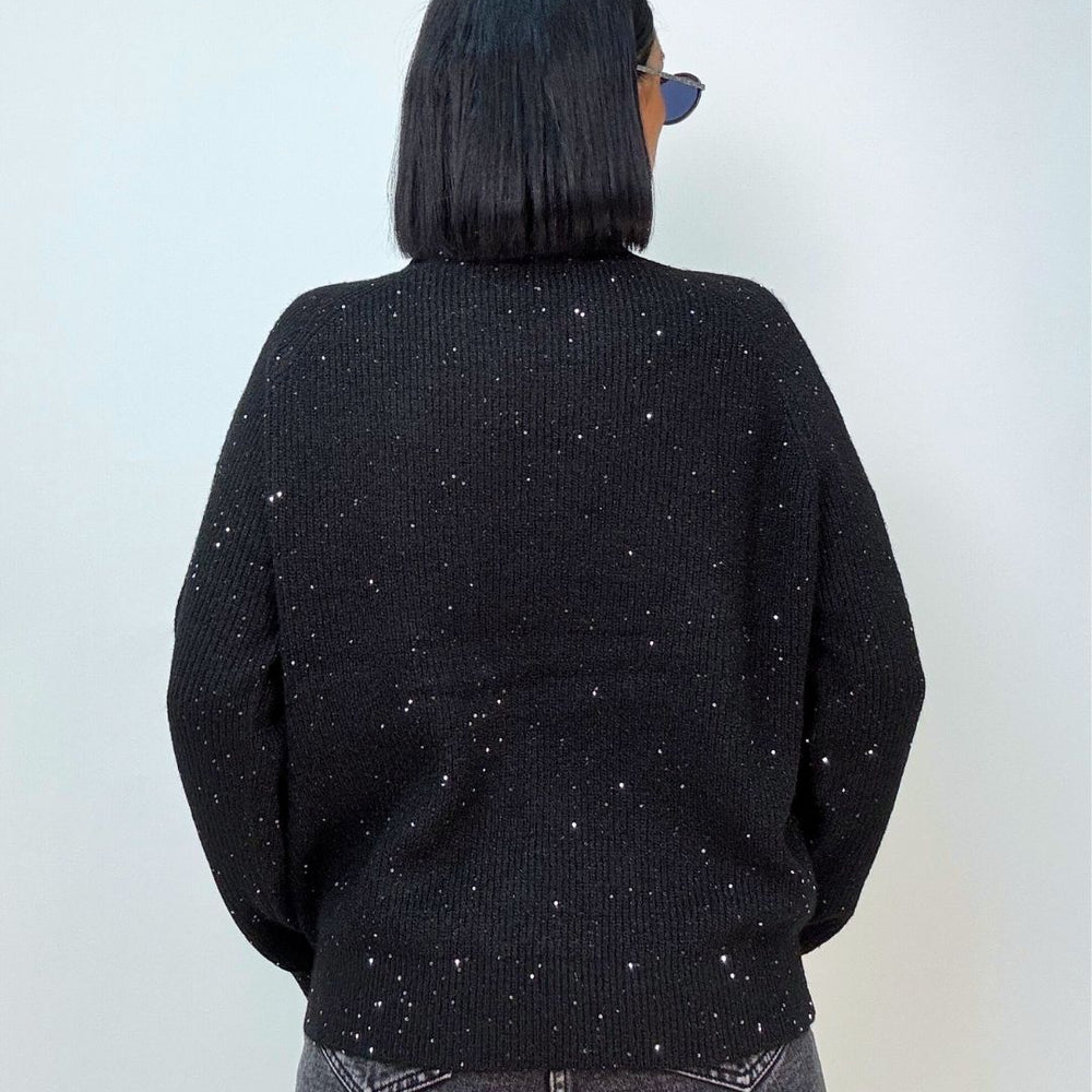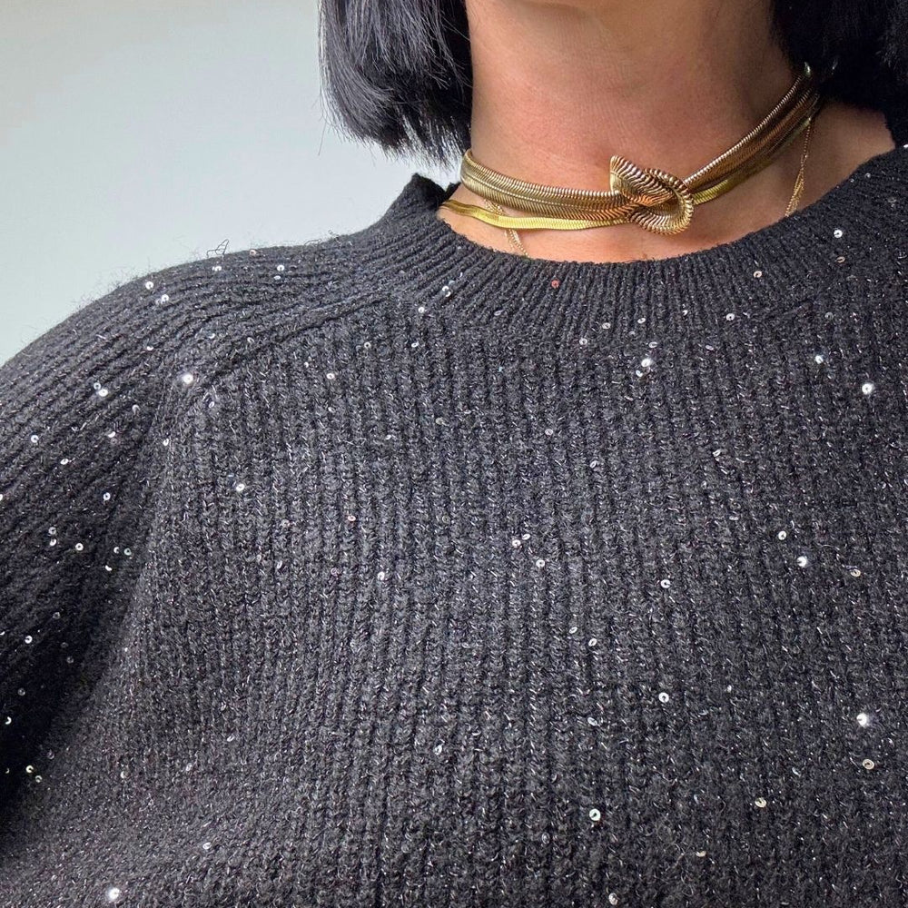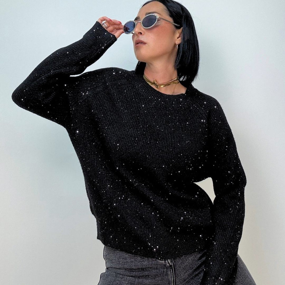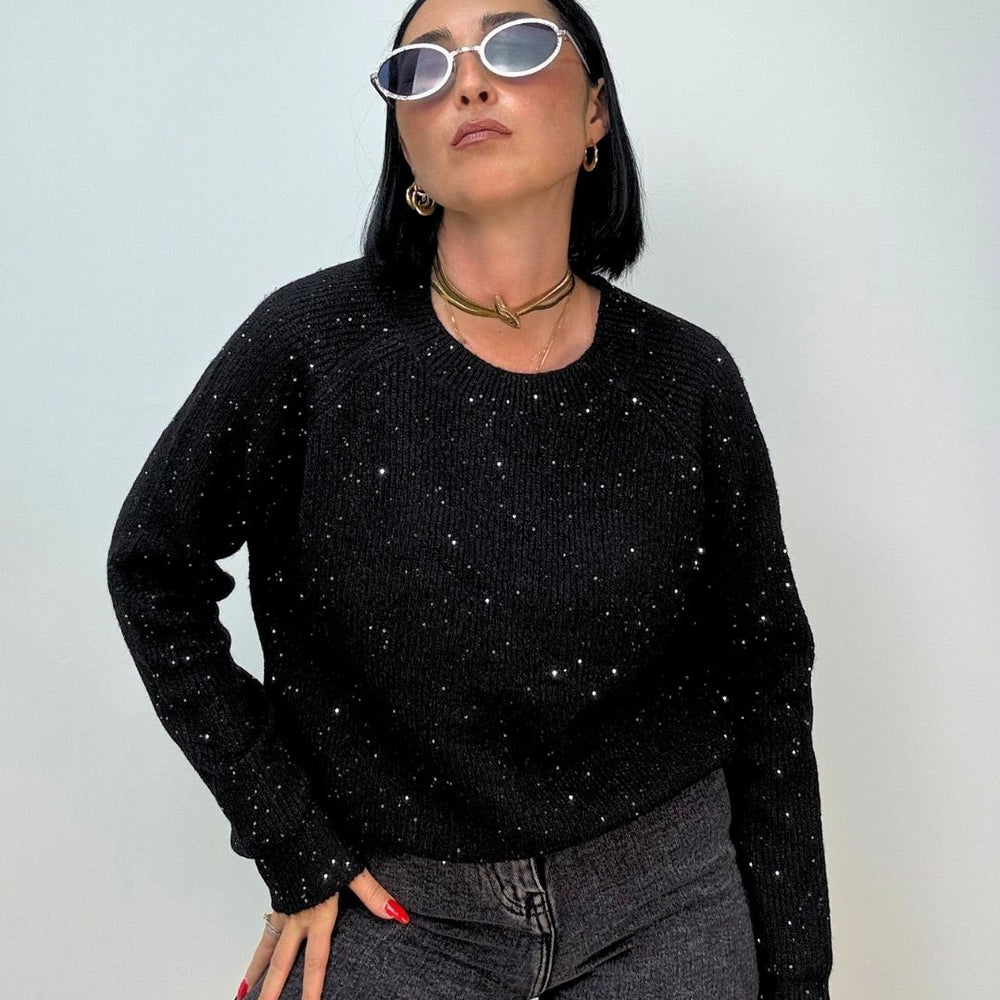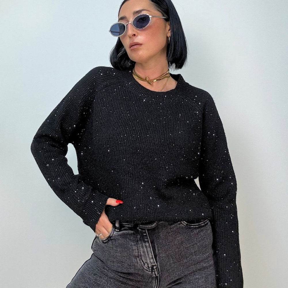 Maglia lavorata a maglia perlata con micro paillettes. Questo capo ultra brillante e molto caldo è l'ideale per chi soffre il freddo e vuole stare sempre al caldo anche nelle uscite serali più eleganti. Dal fit morbido è arricchito da micro paillettes, stupendo da indossare con jeans o gonne per le più freddolose ..un vero must della stagione!