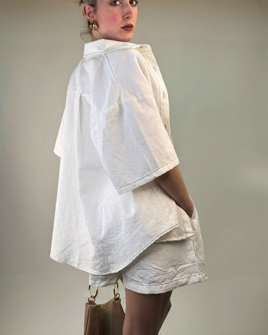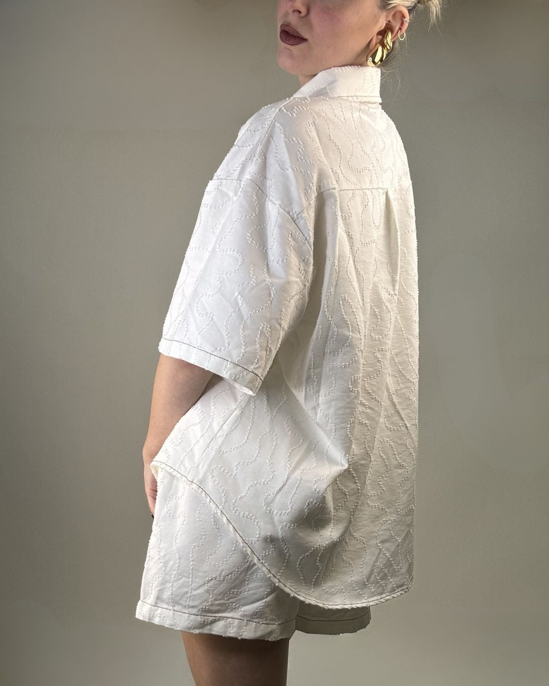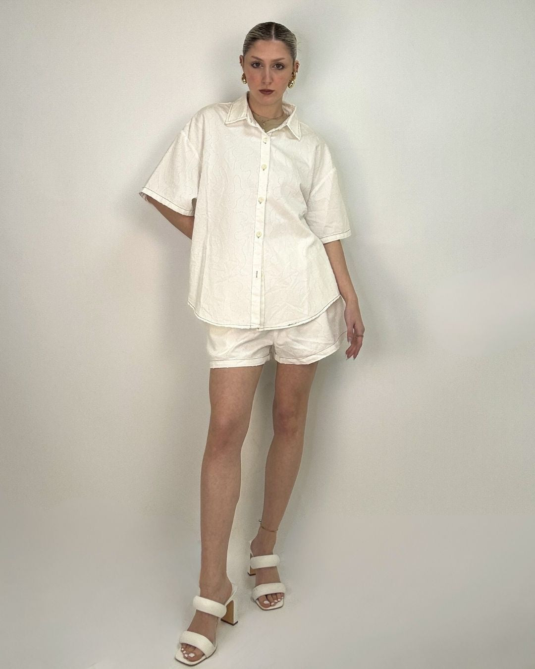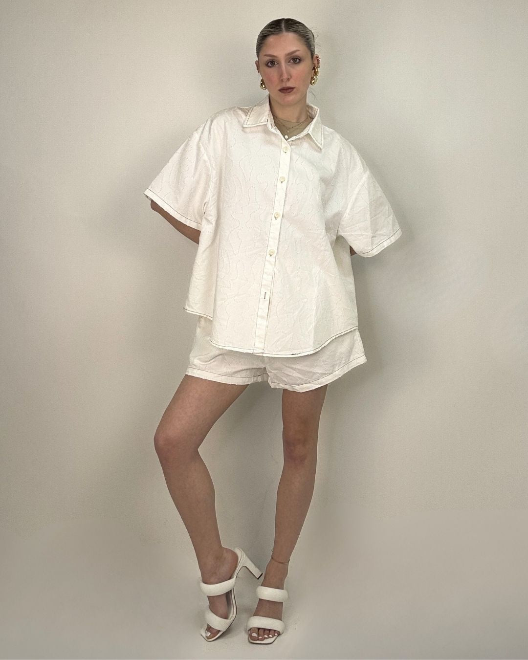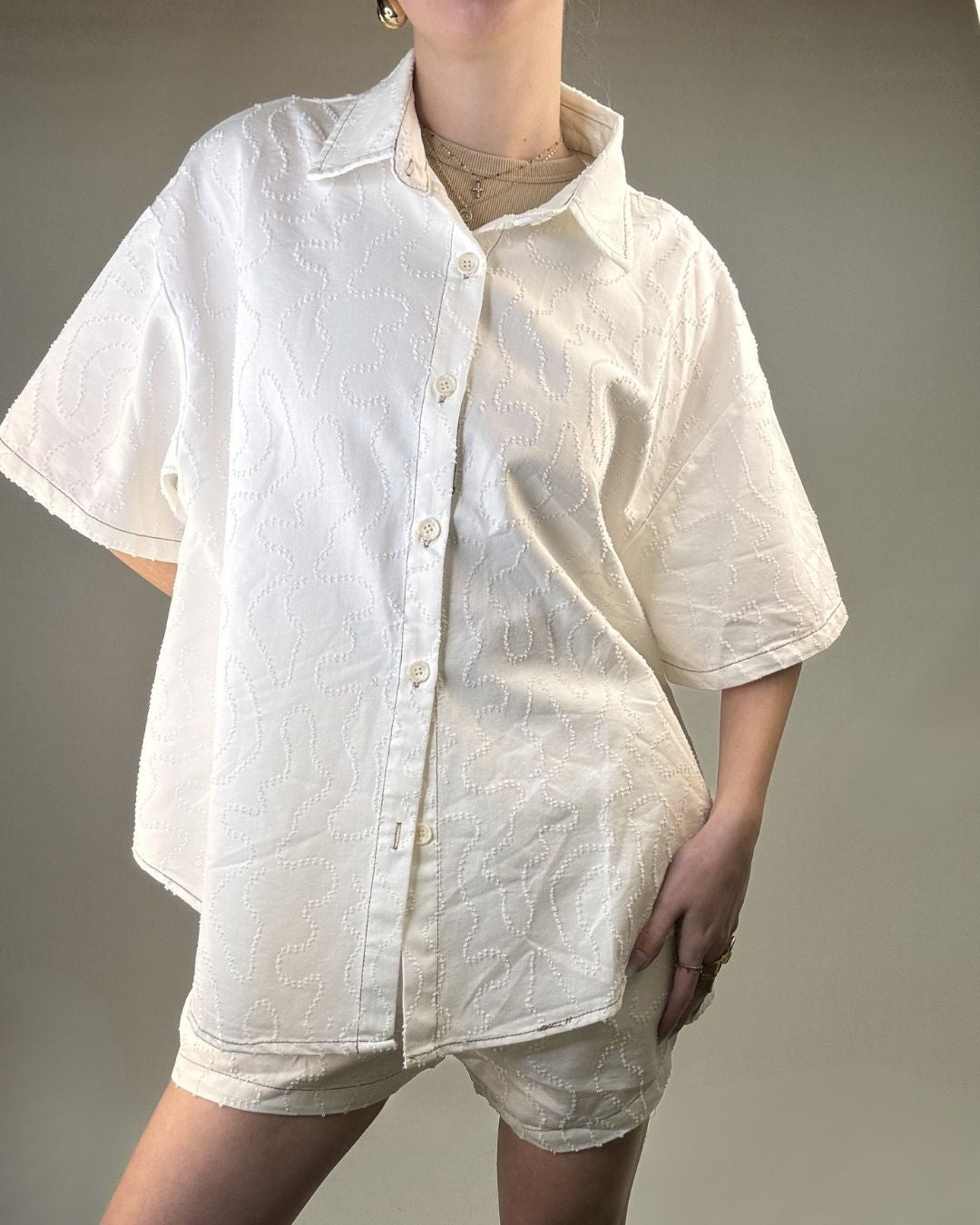 Set pantaloncino e camicia over. In tessuto lavorato in rilievo entrambi i capi sono in taglia unica e vestono dalla taglia XS alla taglia L. Il pantaloncino ha il cinturino elasticizzato che permette una vestibilità comoda e ampia.