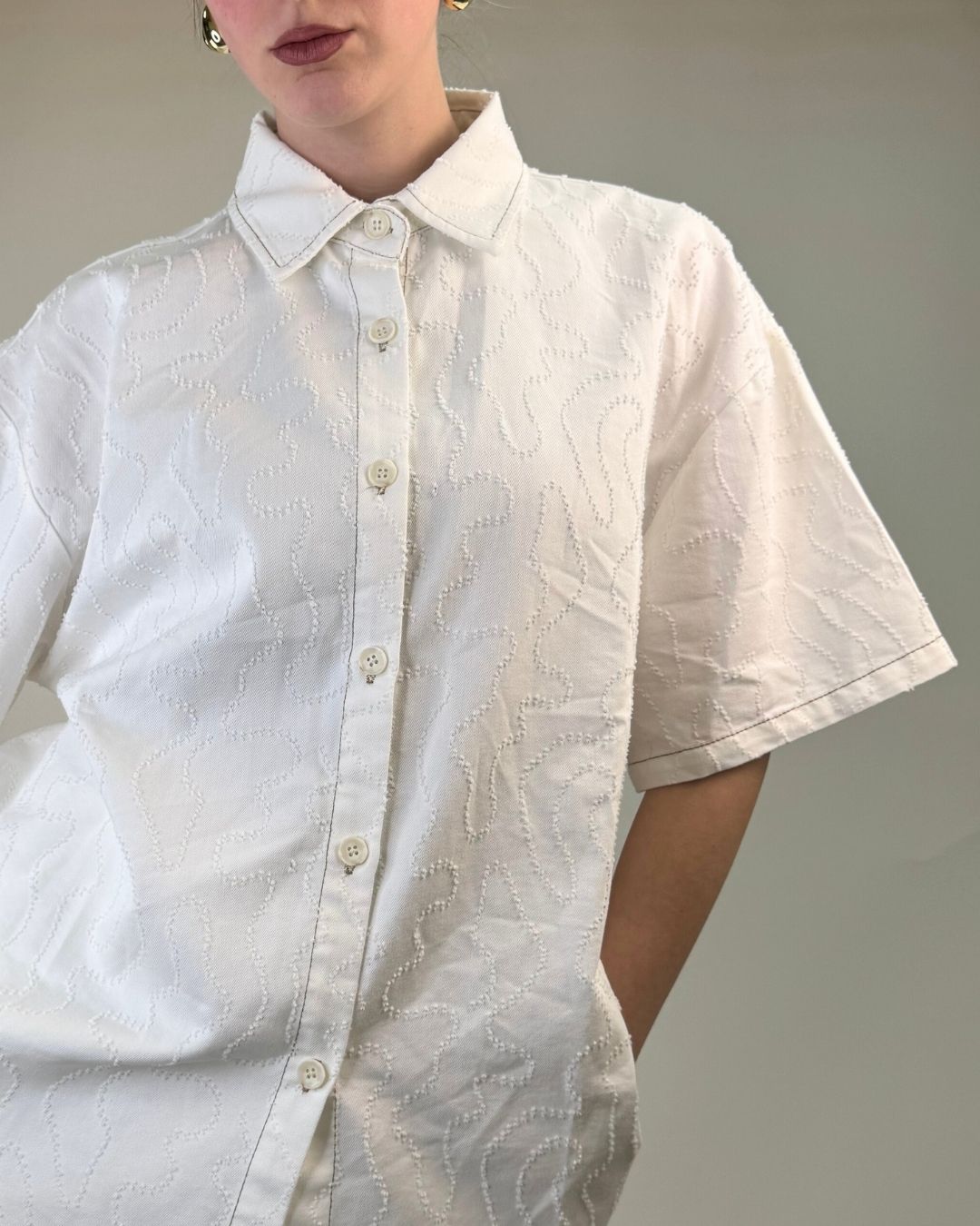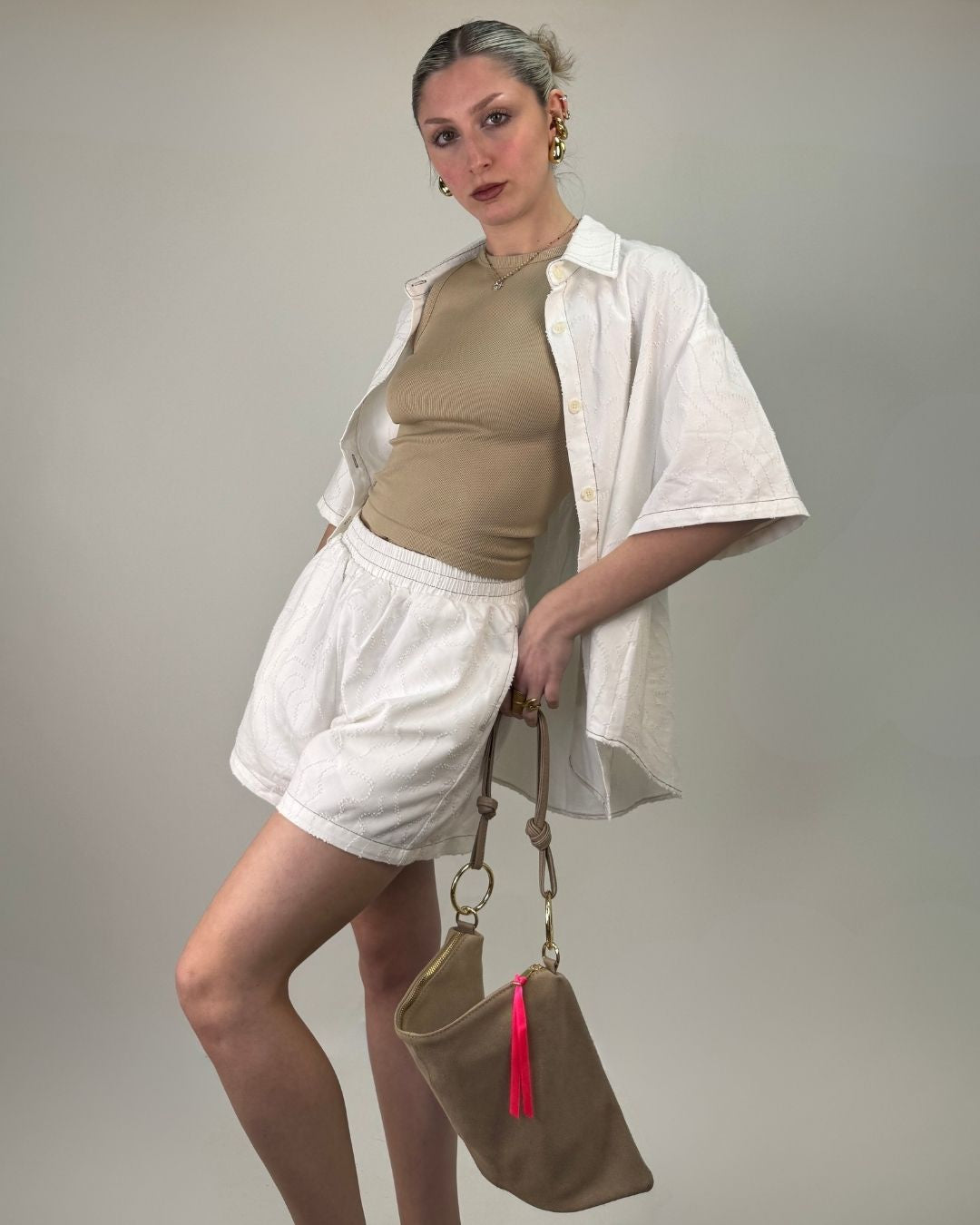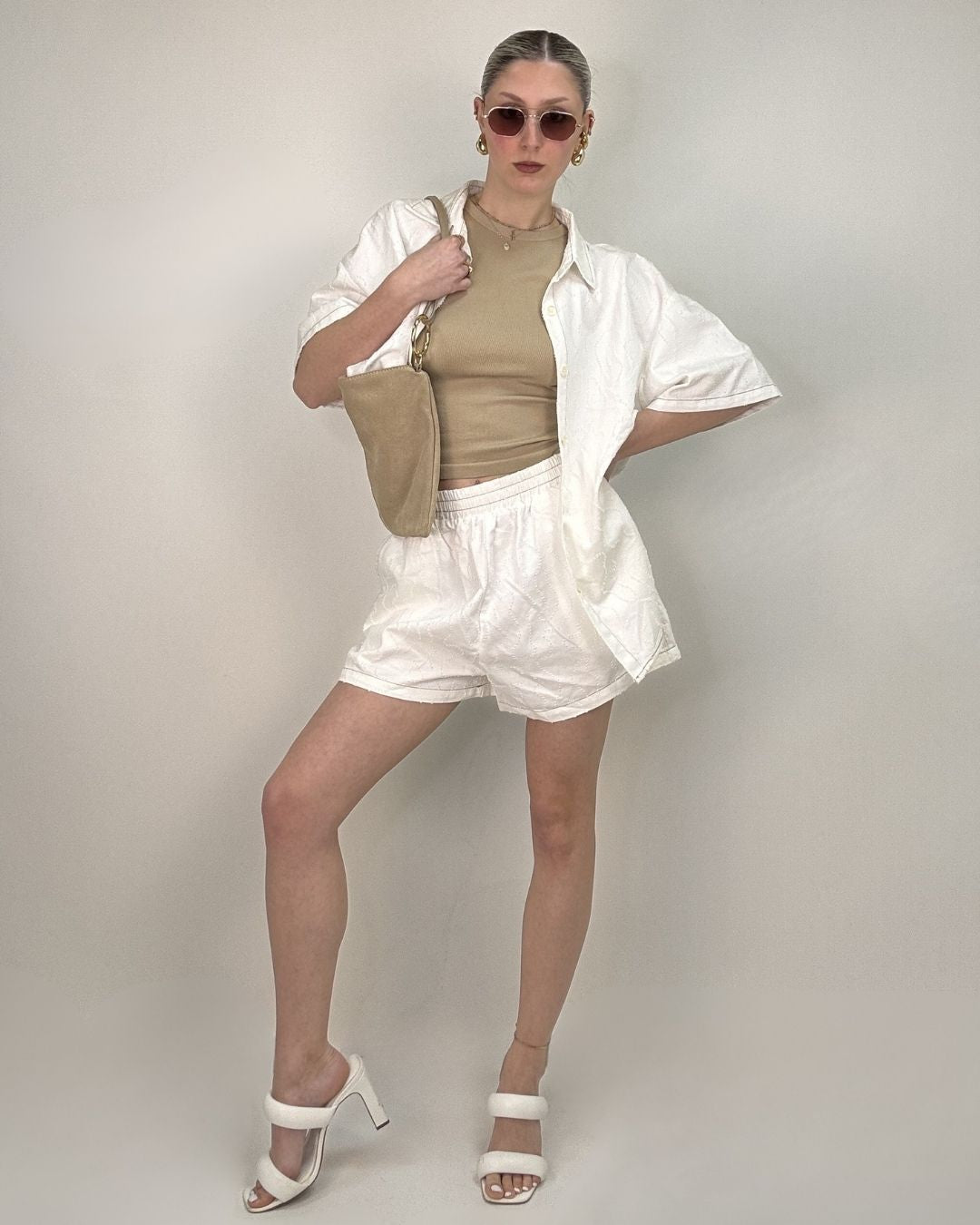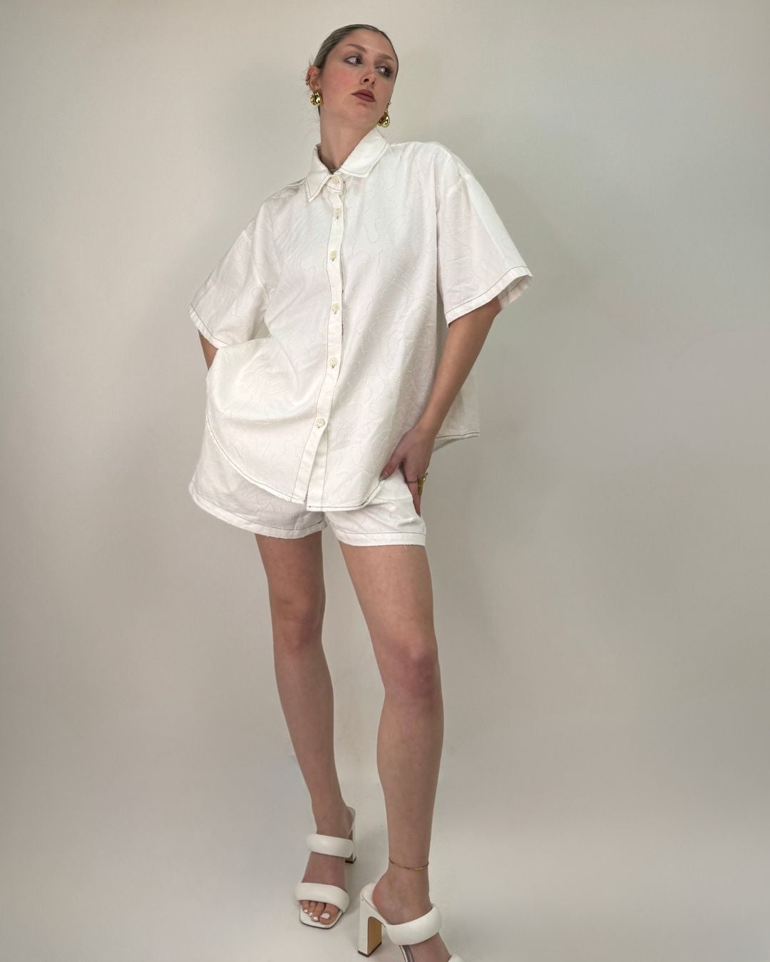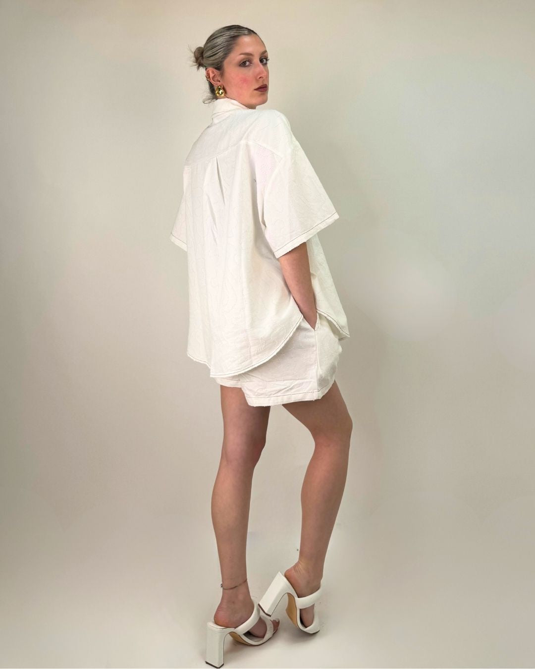 Set pantaloncino e camicia over. In tessuto lavorato in rilievo entrambi i capi sono in taglia unica e vestono dalla taglia XS alla taglia L. Il pantaloncino ha il cinturino elasticizzato che permette una vestibilità comoda e ampia.