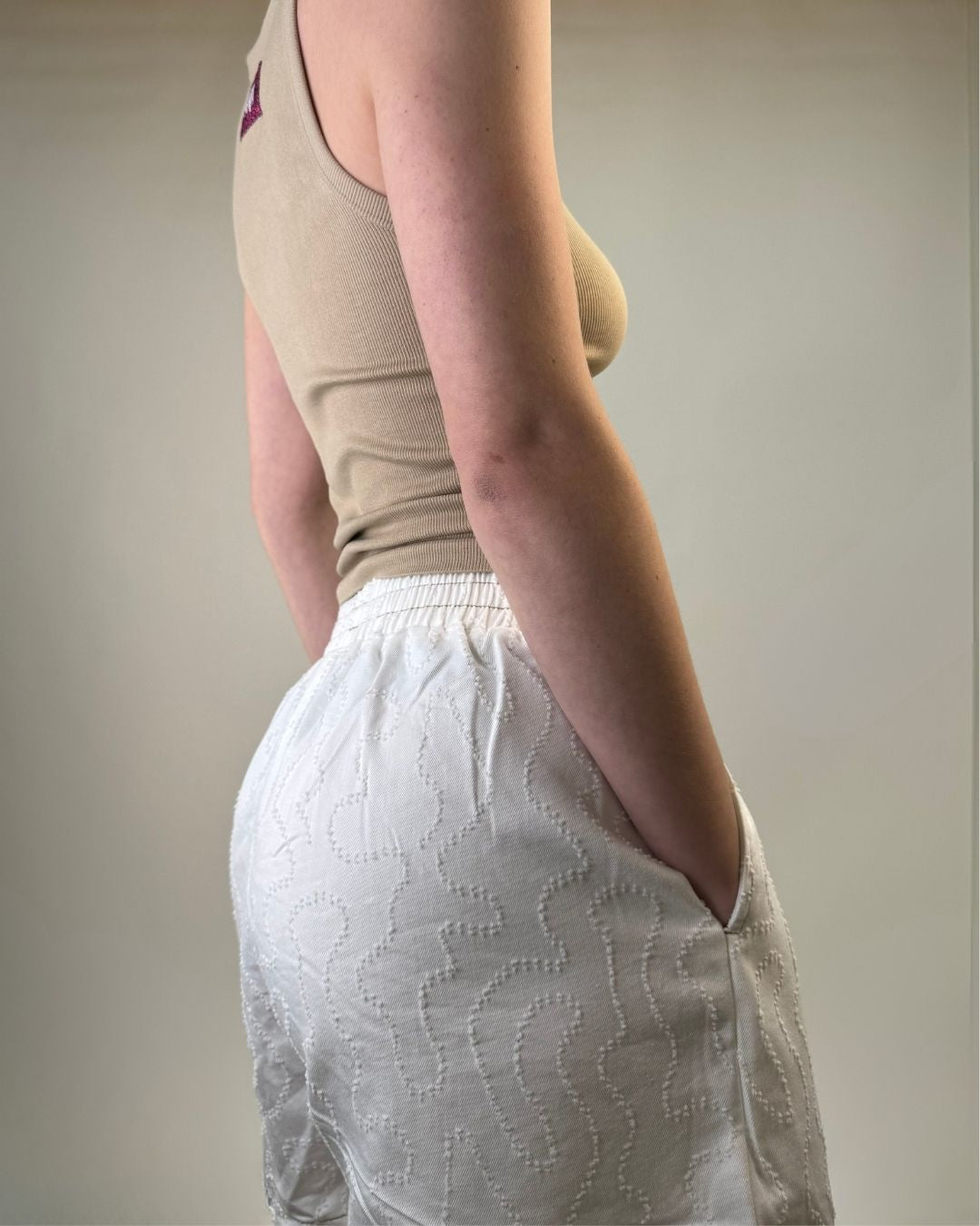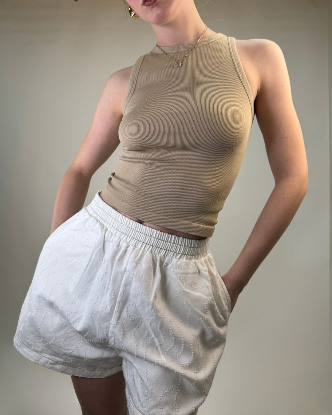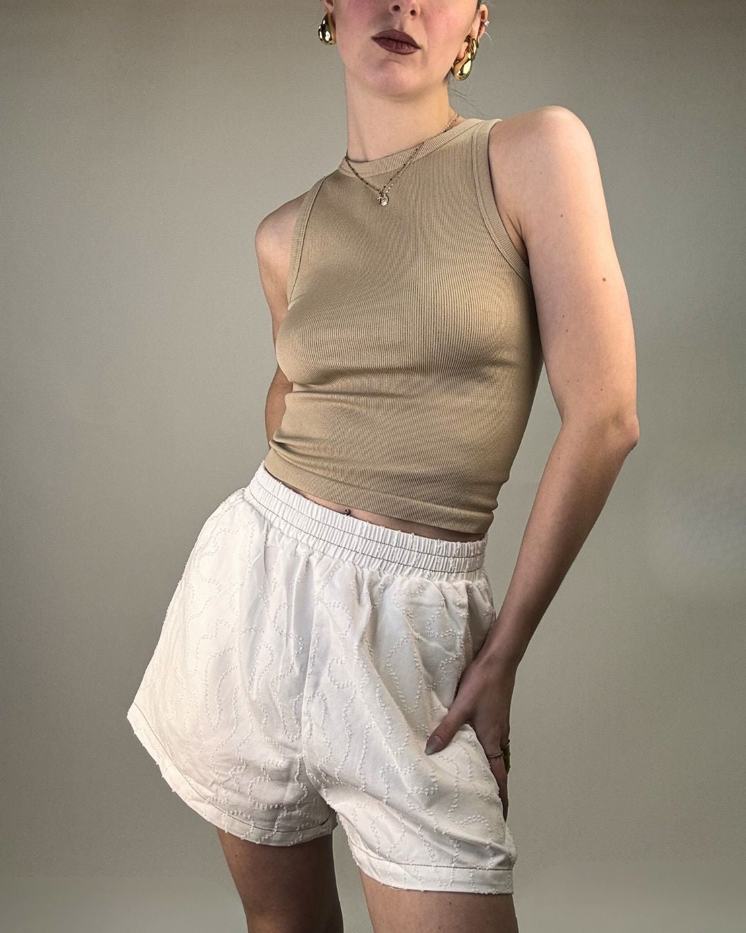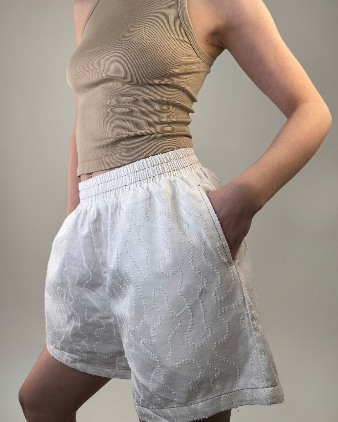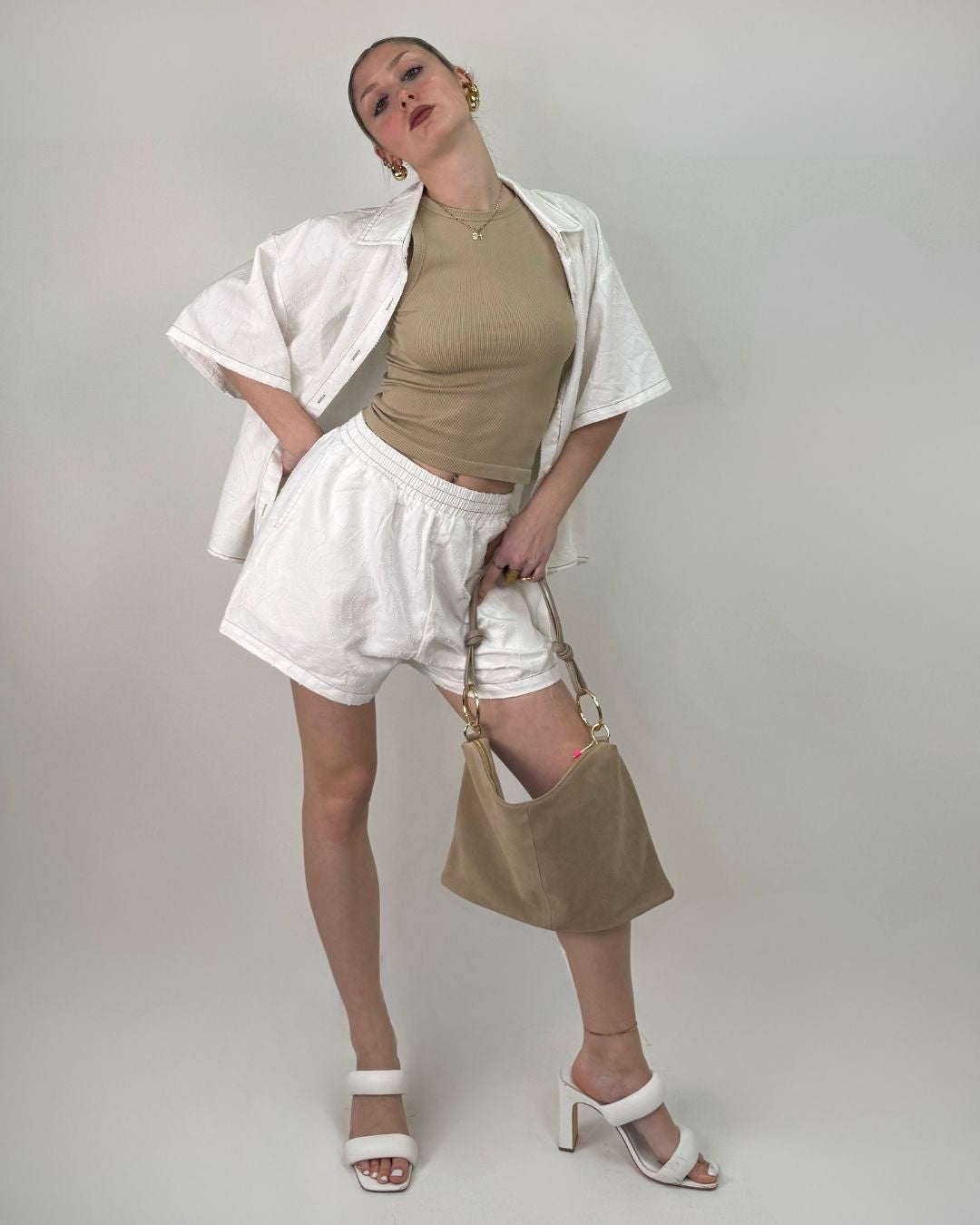 Set pantaloncino e camicia over. In tessuto lavorato in rilievo entrambi i capi sono in taglia unica e vestono dalla taglia XS alla taglia L. Il pantaloncino ha il cinturino elasticizzato che permette una vestibilità comoda e ampia.