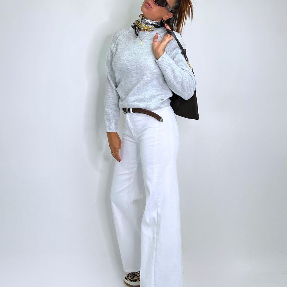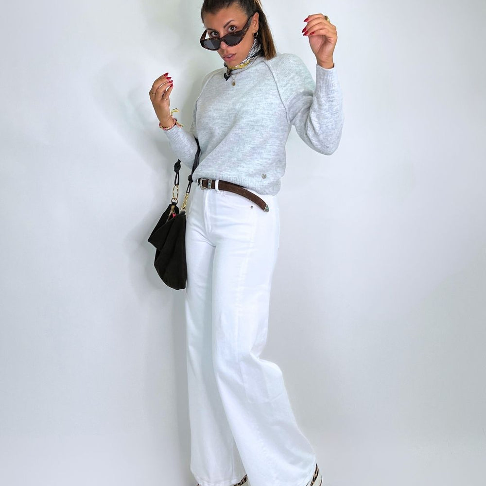 Prezzo normale €210,00Outfit bianco e soffice come la neve per non passare inosservate ma stando sempre al caldo in questo maglioncino super morbido. Il jeans stretch bianco ottico, largo al fondo, aggiunge un tocco di comfort e stile. Completa il look la borsa Sami in vera pelle scamosciata, capiente e versatile, perfetta per il giorno e la sera abbinata in perfetto match di colore alla cintura west, sempre in camoscio e con fibbia di metallo e turchesi made in italy. E sei pronta per uscire!