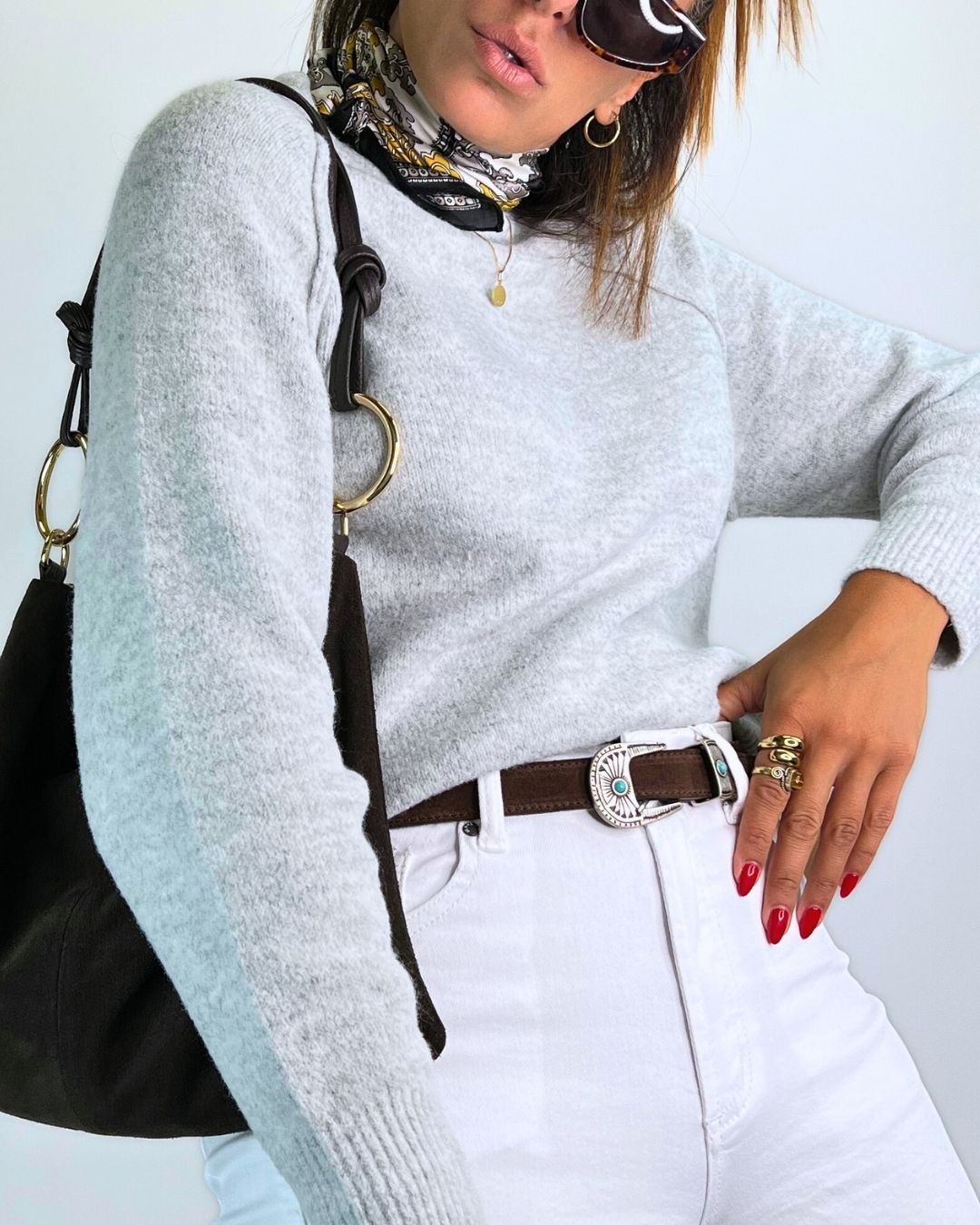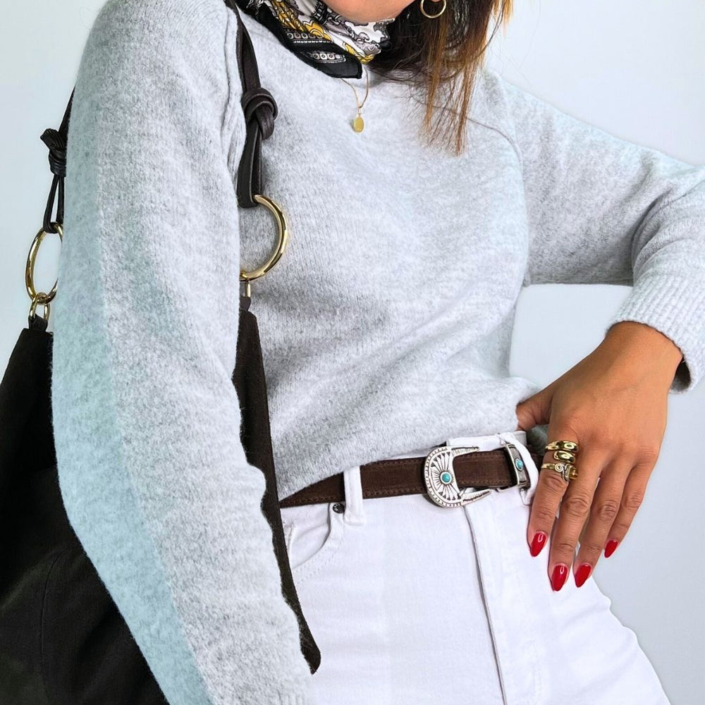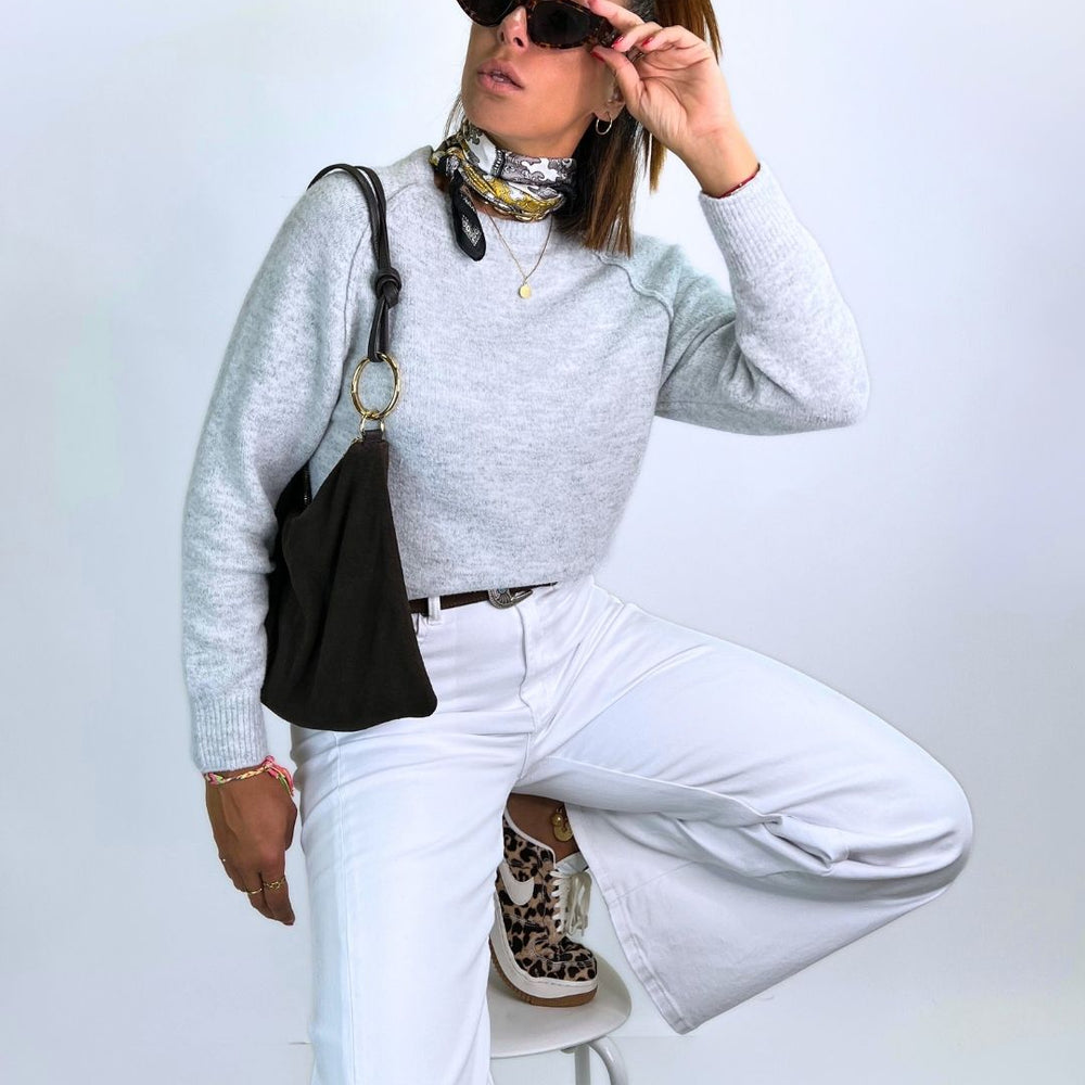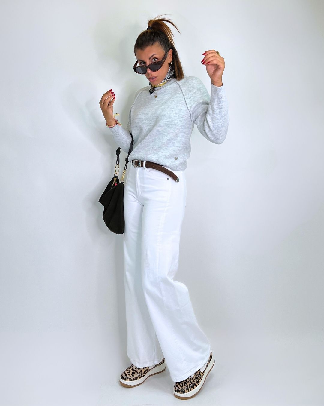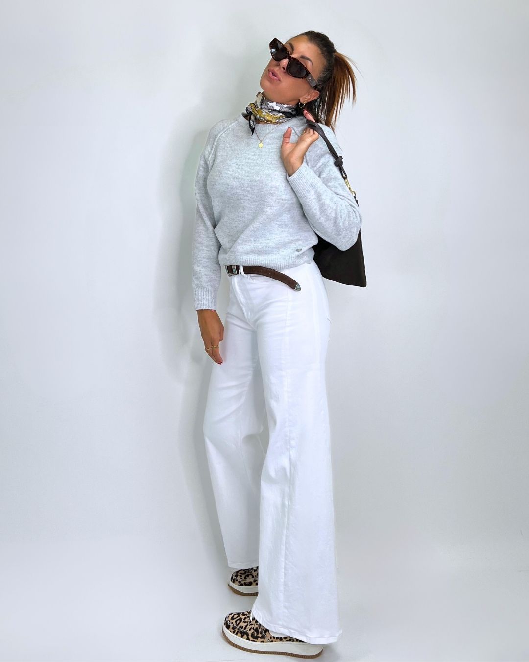 Outfit bianco e soffice come la neve per non passare inosservate ma stando sempre al caldo in questo maglioncino super morbido. Il jeans stretch bianco ottico, largo al fondo, aggiunge un tocco di comfort e stile. Completa il look la borsa Sami in vera pelle scamosciata, capiente e versatile, perfetta per il giorno e la sera abbinata in perfetto match di colore alla cintura west, sempre in camoscio e con fibbia di metallo e turchesi made in italy. E sei pronta per uscire!
