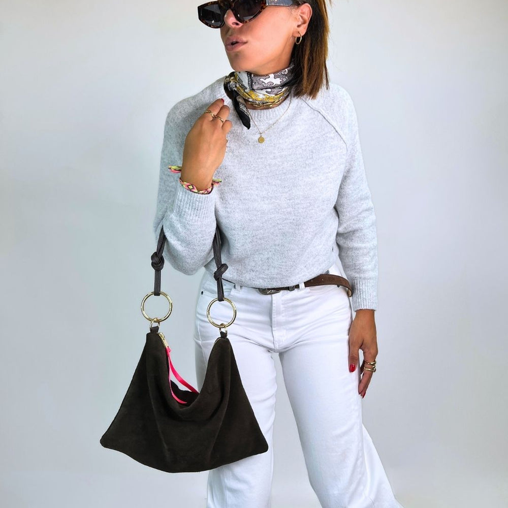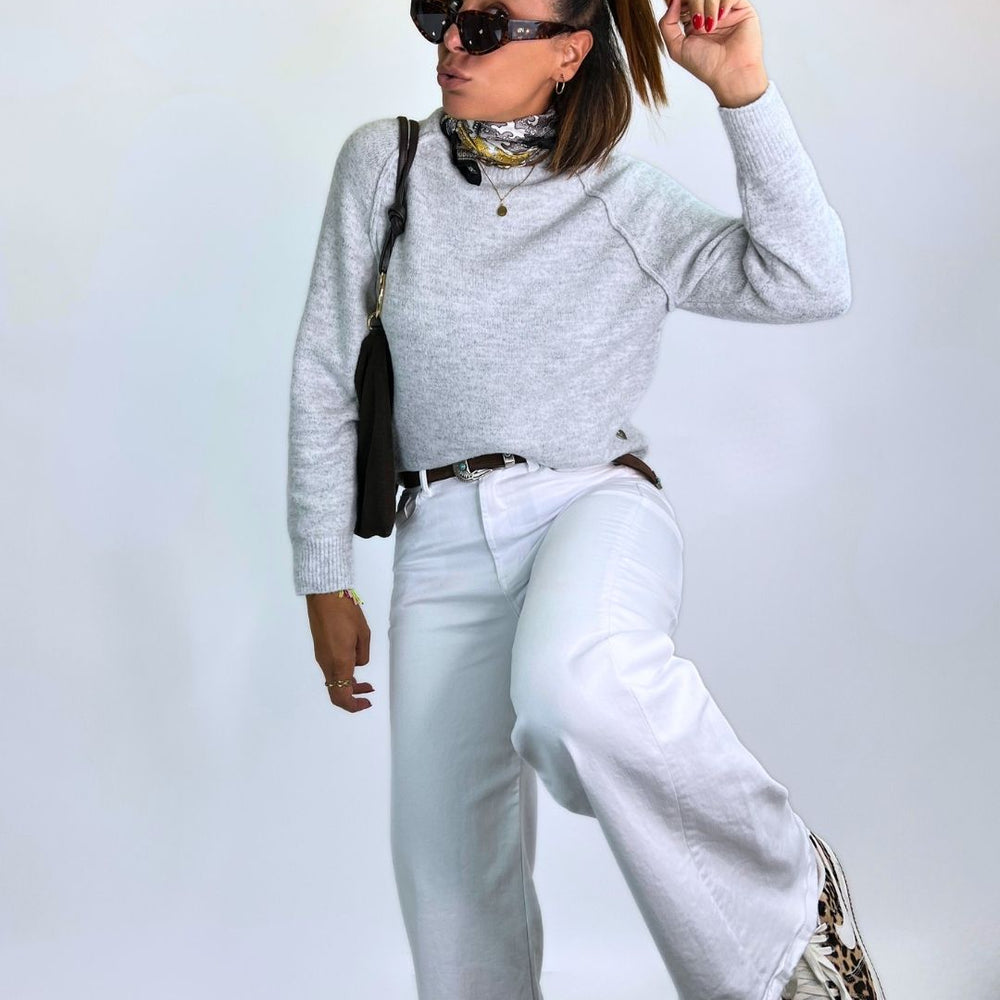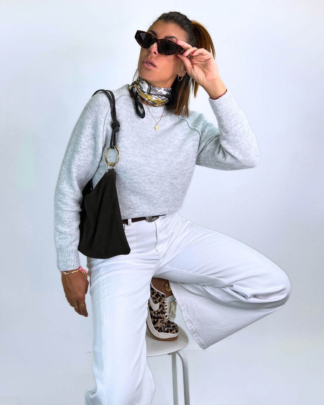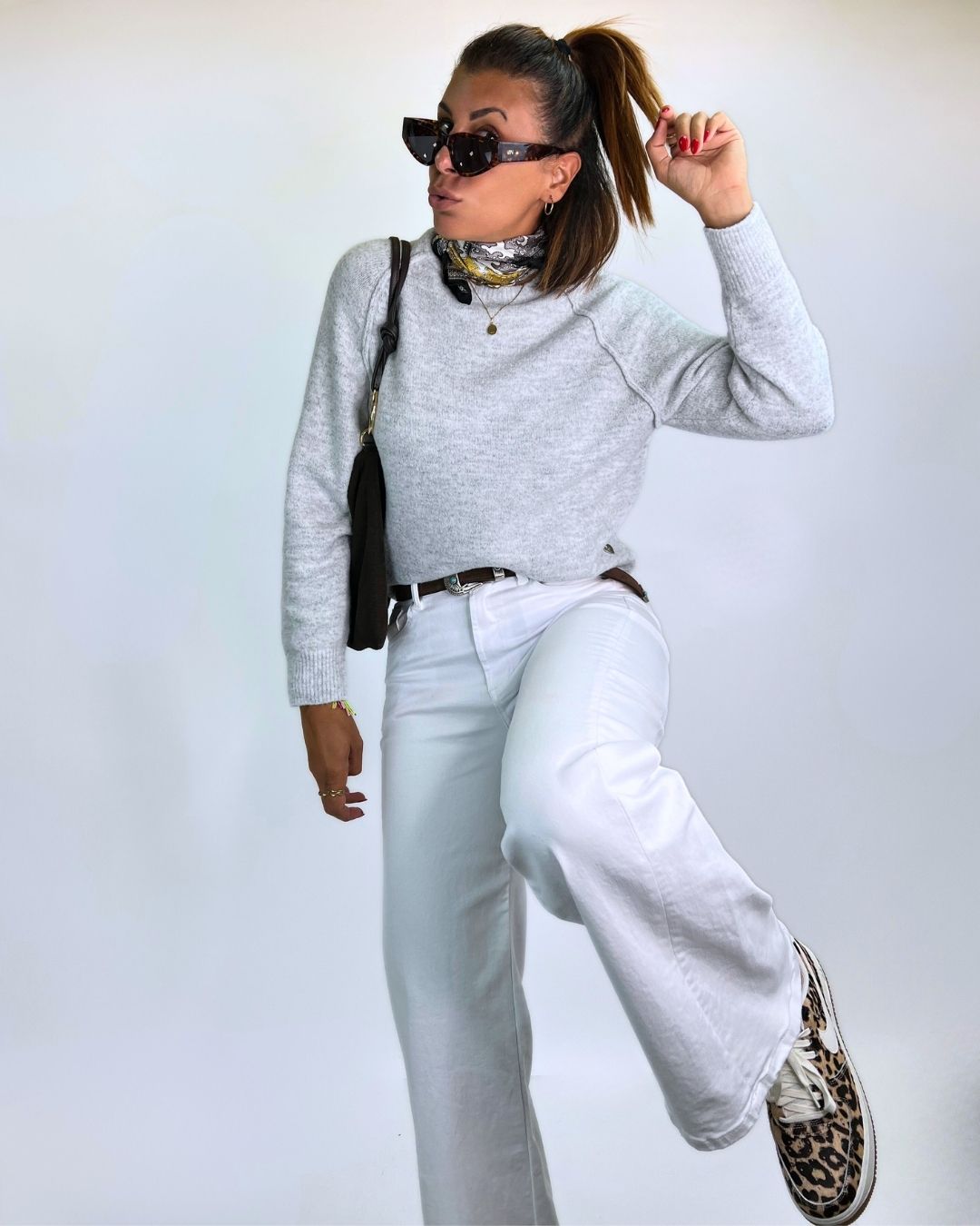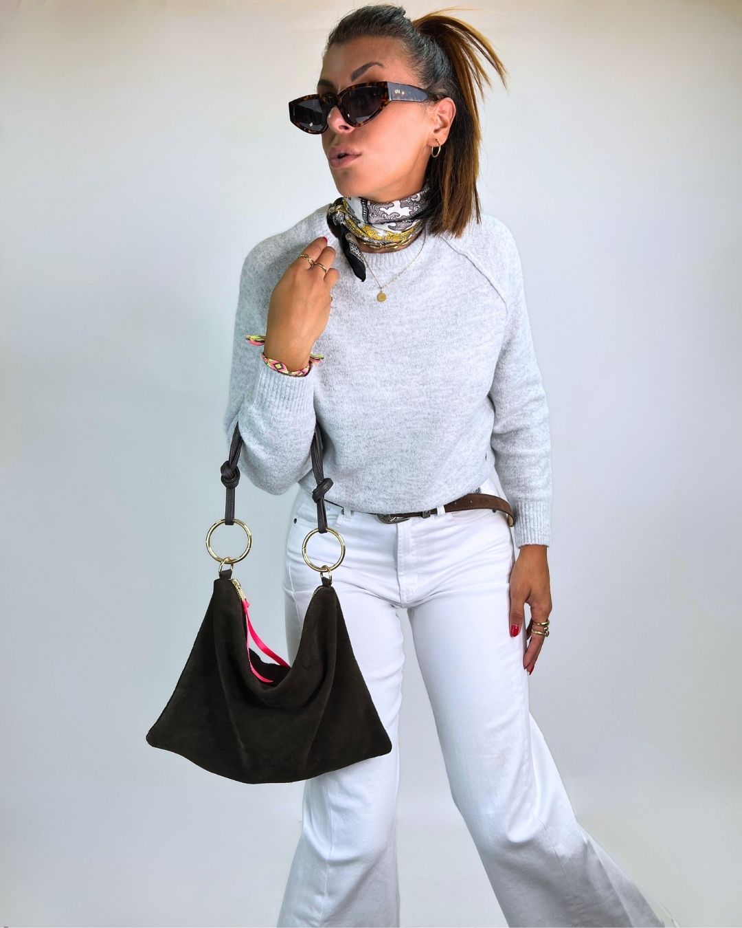 Outfit bianco e soffice come la neve per non passare inosservate ma stando sempre al caldo in questo maglioncino super morbido. Il jeans stretch bianco ottico, largo al fondo, aggiunge un tocco di comfort e stile. Completa il look la borsa Sami in vera pelle scamosciata, capiente e versatile, perfetta per il giorno e la sera abbinata in perfetto match di colore alla cintura west, sempre in camoscio e con fibbia di metallo e turchesi made in italy. E sei pronta per uscire!