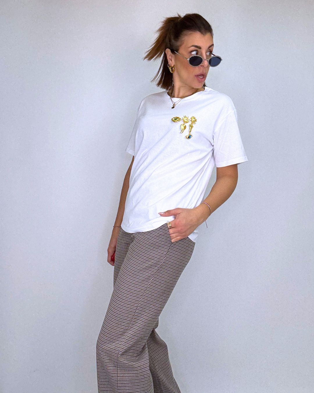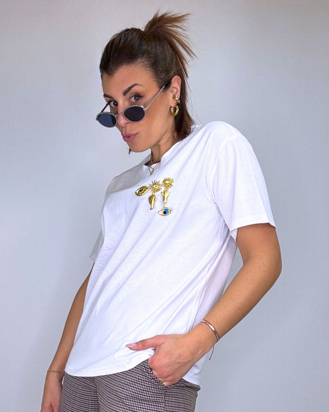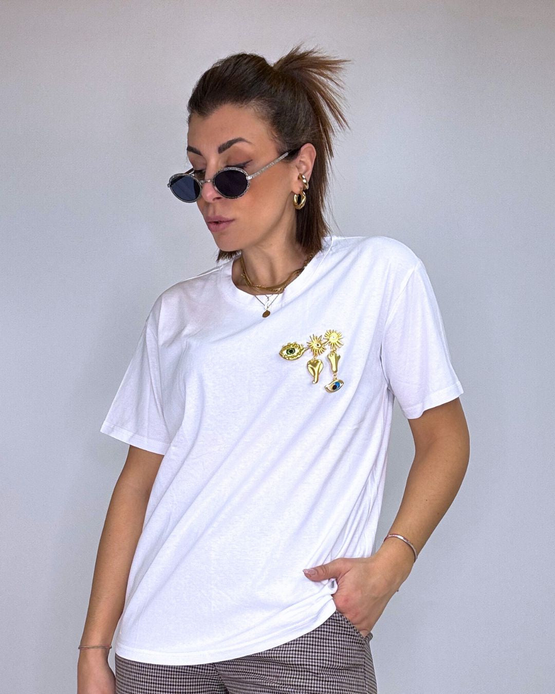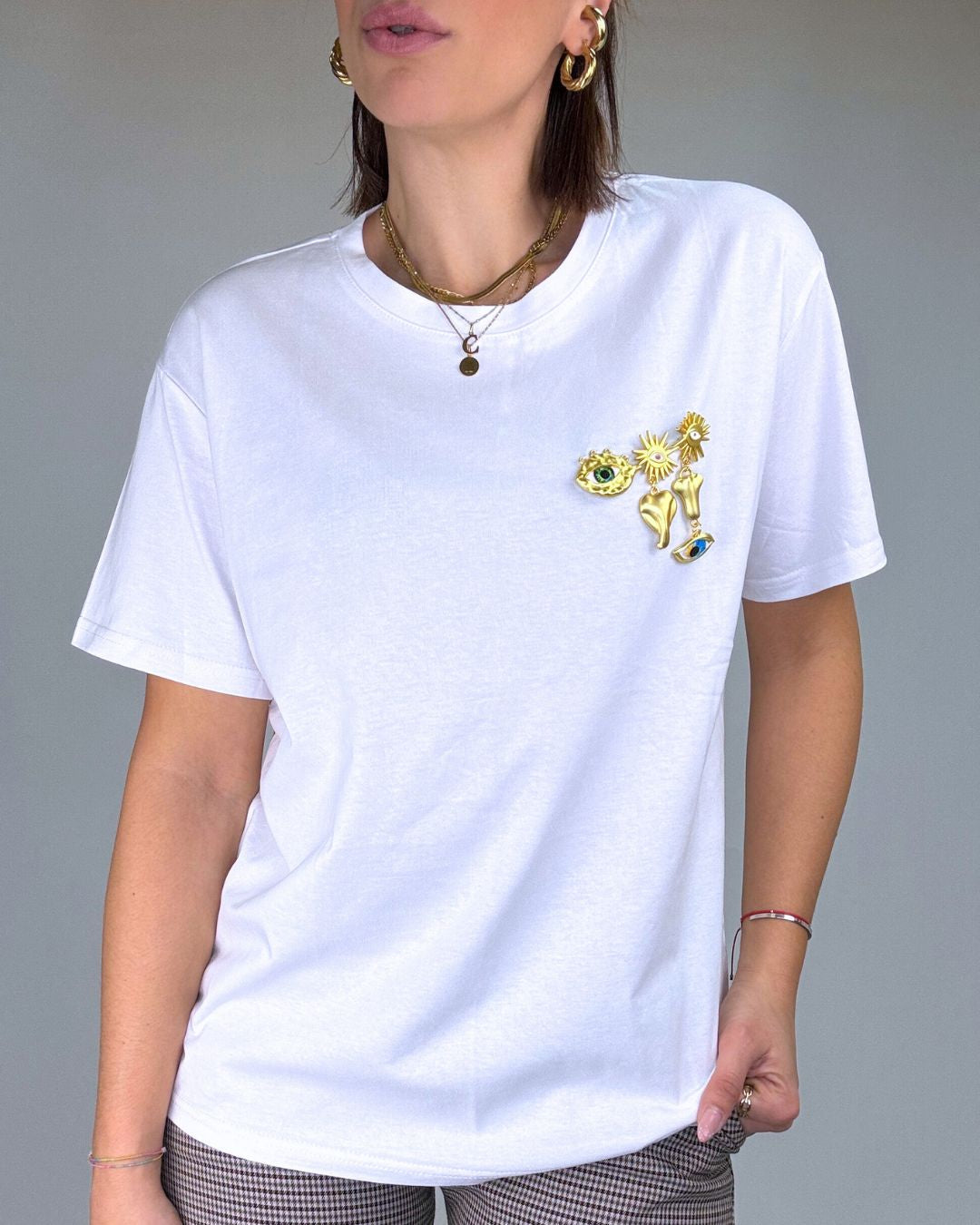 T-shirt a mezza manica fit over, in puro cotone con gioiellini portafortuna cuciti sul petto. Il look è semplice ma di grande effetto, se ami i volumi morbidi e i capi trasversali che si possono abbinare su pantaloni, tute, gonne o leggings, questa t-shirt fa al caso tuo! Veste dalla taglia XS alla taglia L.