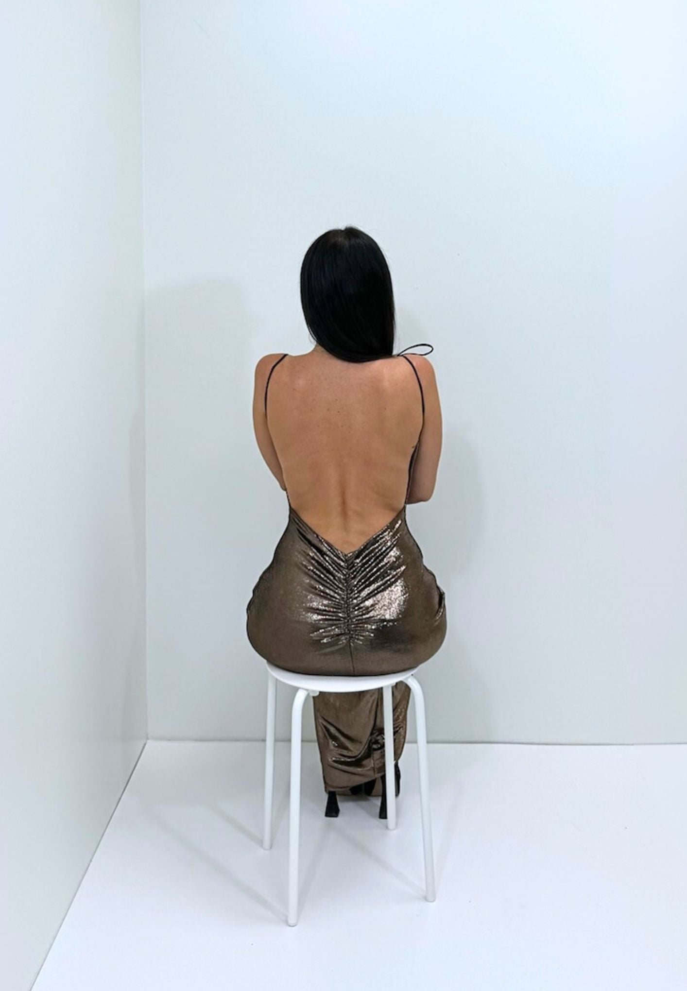 Abito lungo effetto metallizzato elasticizzato con schiena nuda e scollatura a goccia, arricciatura sul dietro per esaltare le forme, chiusura con lacci regolabili su spalle.