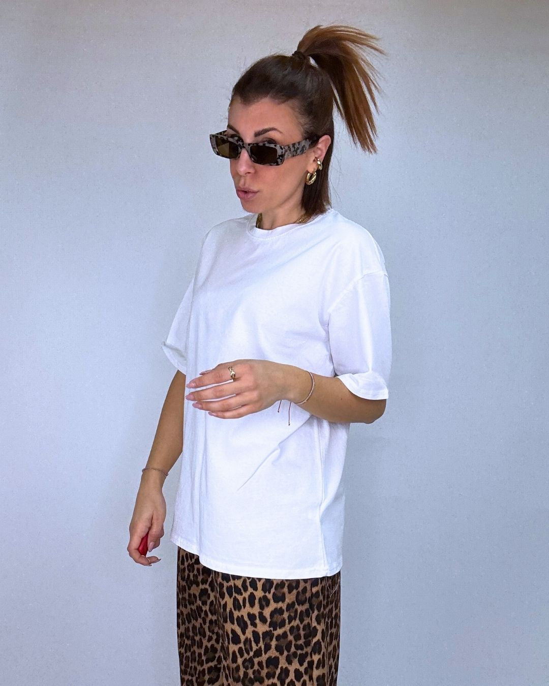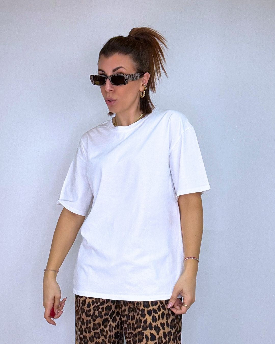 T-shirt over in puro cotone, spalla scesa, petto e fondo ampio, un fit ampio e comodo ideale per essere sfruttato su più outfit, indossalo in estate come capo principale su pantaloni ampi per un look loose fit oppure su fuseaux fit per mettere in risalto le gambe, la t-shirt basic la puoi usare anche in inverno sotto maglioni o felpe e farne vedere solo il colletto estremamente rifinito oppure il fondo che esce dal tuo maglione del cuore! Veste dalla taglia XS alla L.