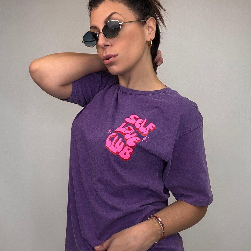 T-shirt vestibilità over, in tessuto di puro cotone tinto freddo, girocollo con spalla scesa e mezza manica. Stampa piccola sul davanti e maxi stampa sul dietro. Veste dalla taglia XS alla taglia L.