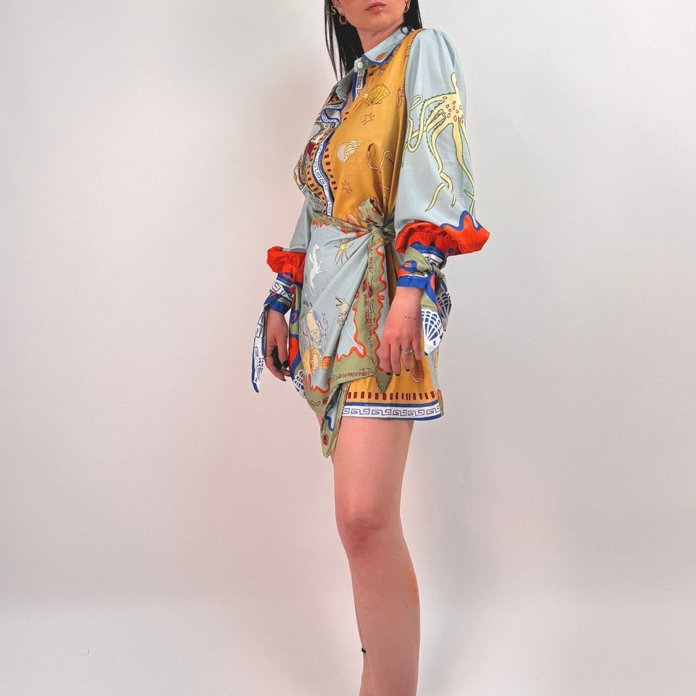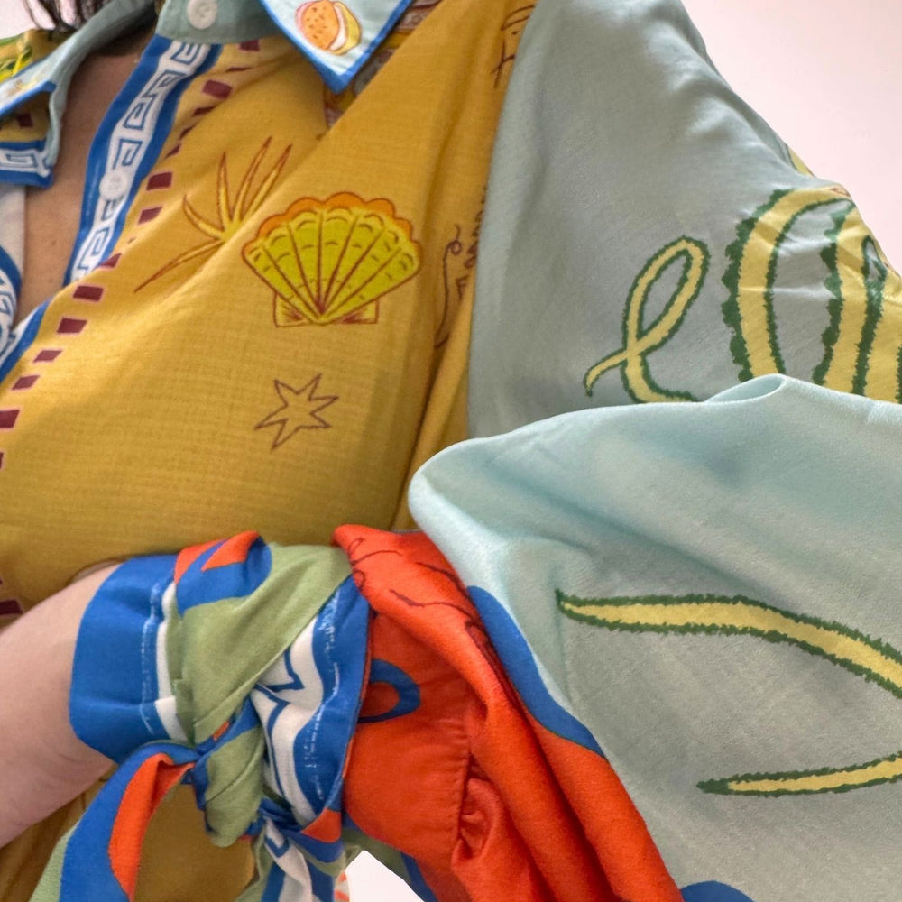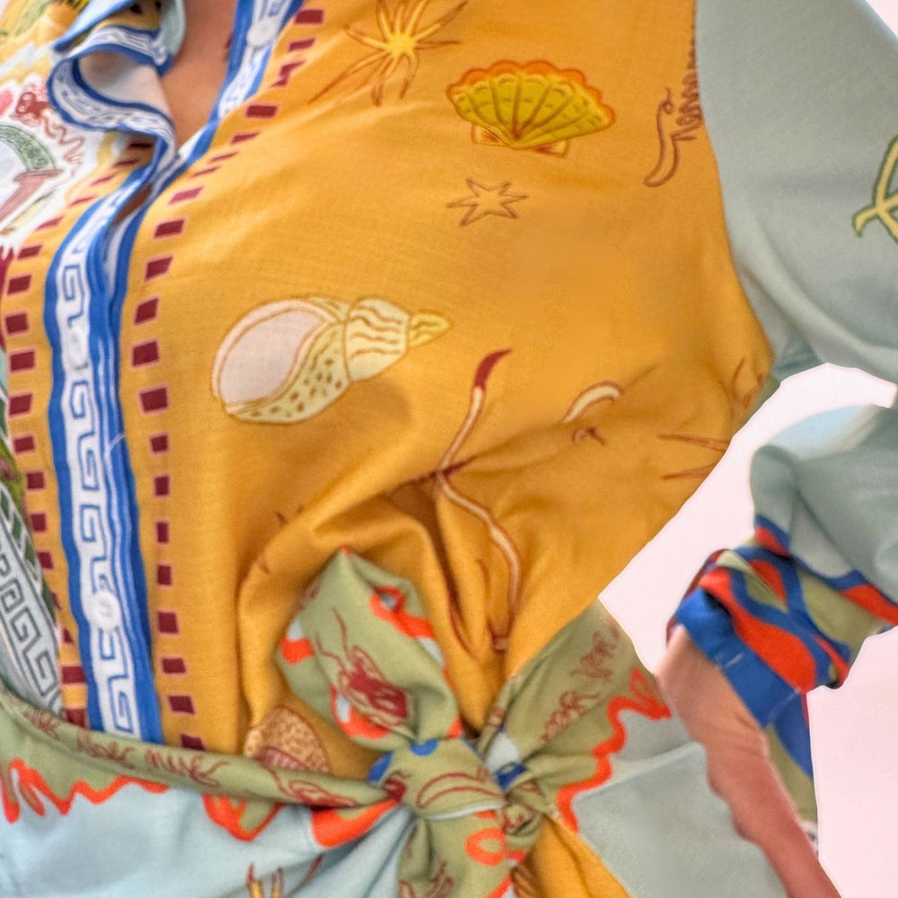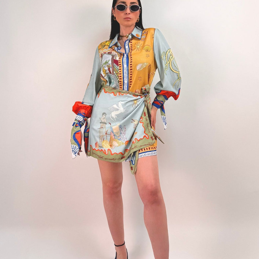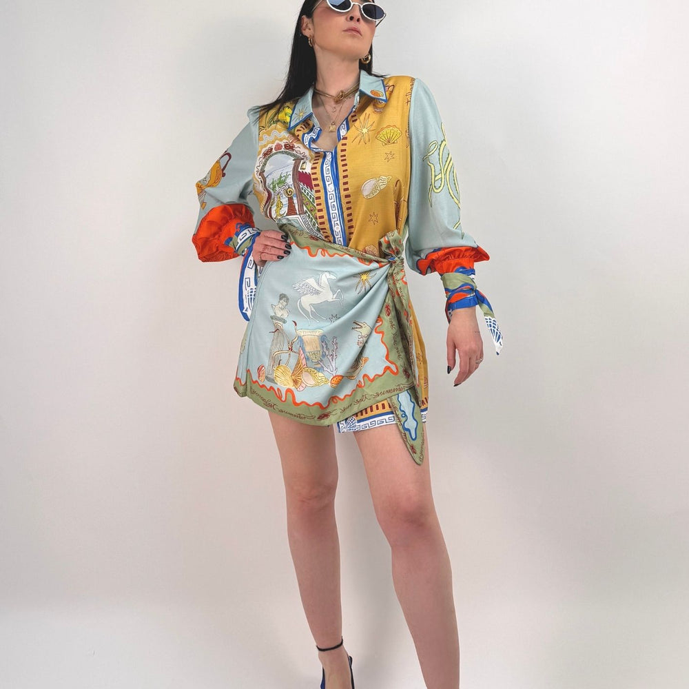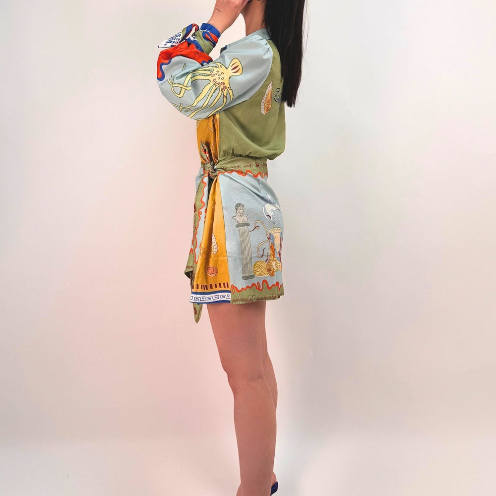 Vestito stampato, colletto a camicia abbottonato ed apribile fino al fondo, gonna a portafoglio da chiudere con nodo (cucita non staccabile). Maniche a palloncino con arricciatura sulle spalle e polsini con lacci da legare a fiocco. Veste dalla taglia XS alla taglia L