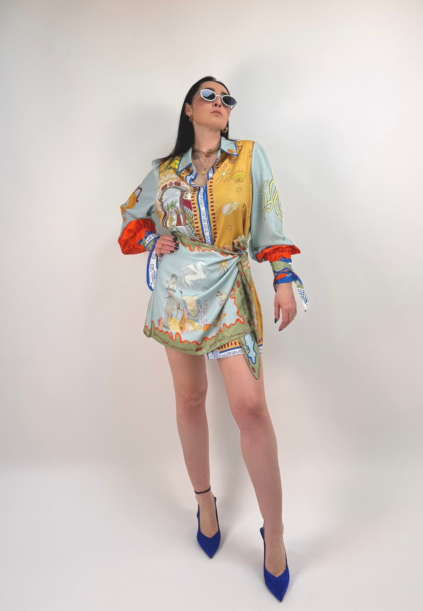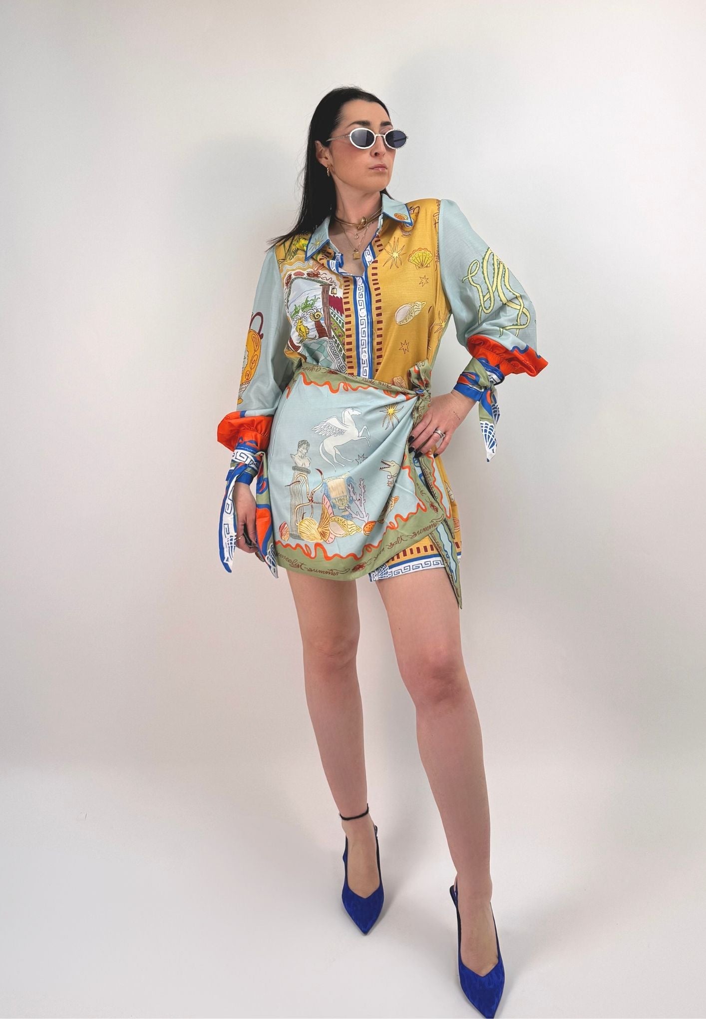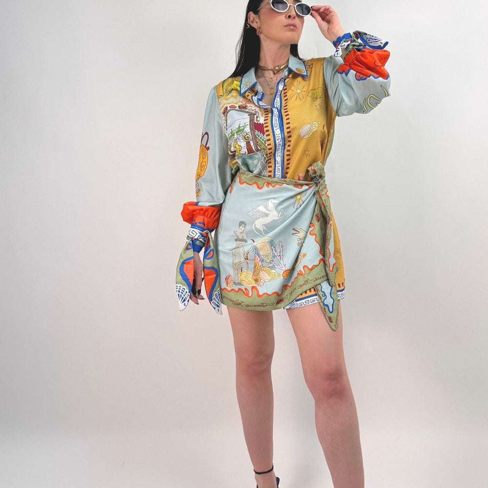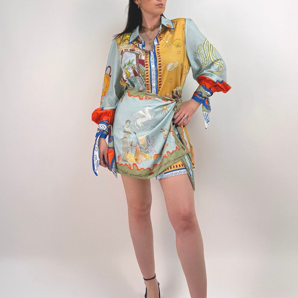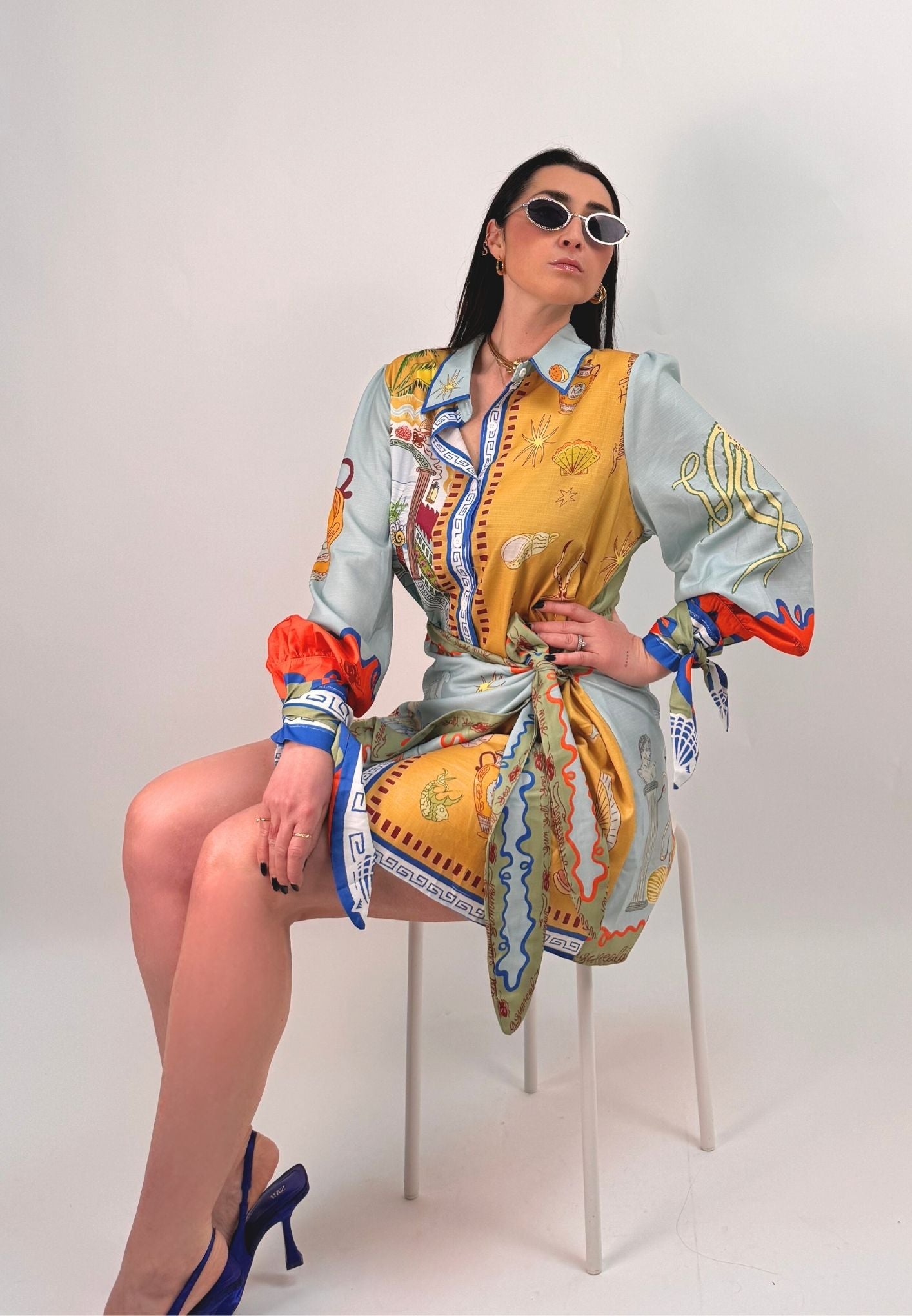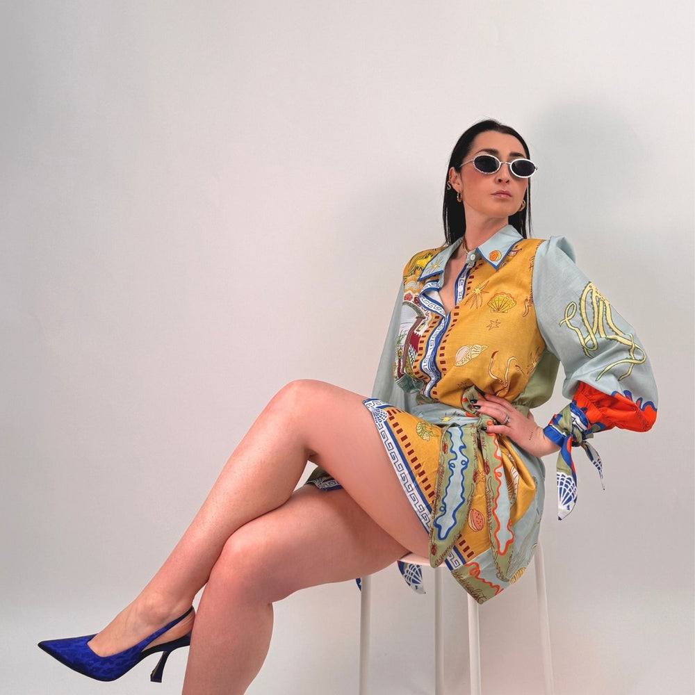 Vestito stampato, colletto a camicia abbottonato ed apribile fino al fondo, gonna a portafoglio da chiudere con nodo (cucita non staccabile). Maniche a palloncino con arricciatura sulle spalle e polsini con lacci da legare a fiocco. Veste dalla taglia XS alla taglia L