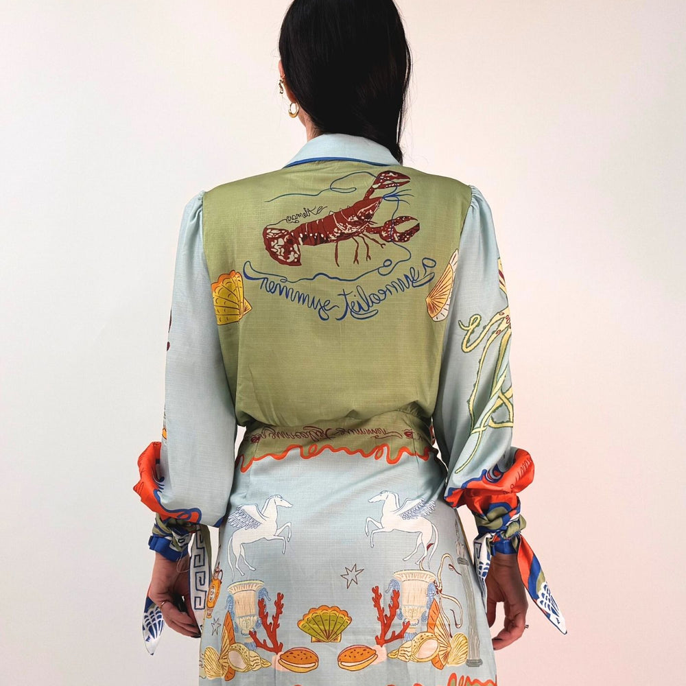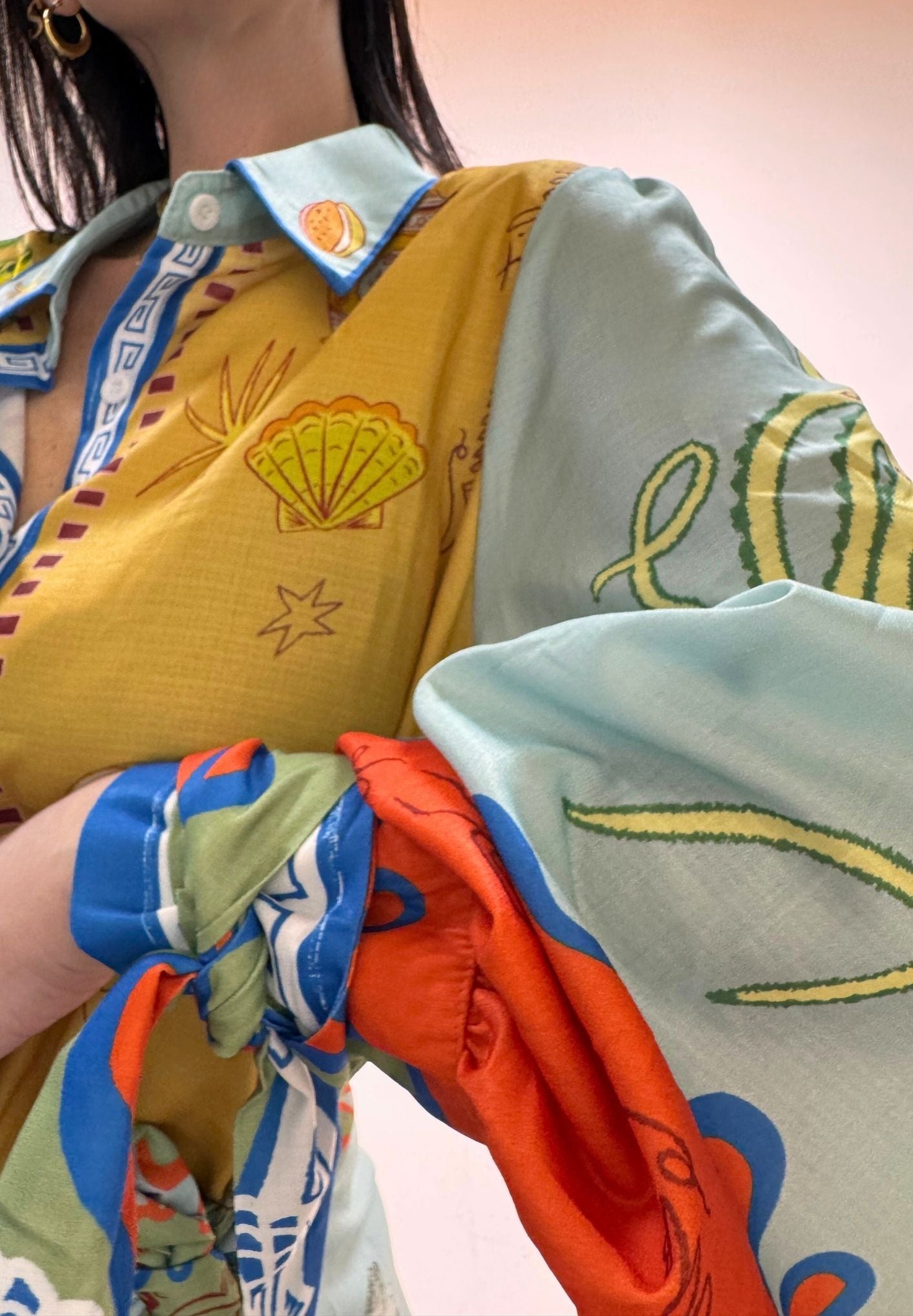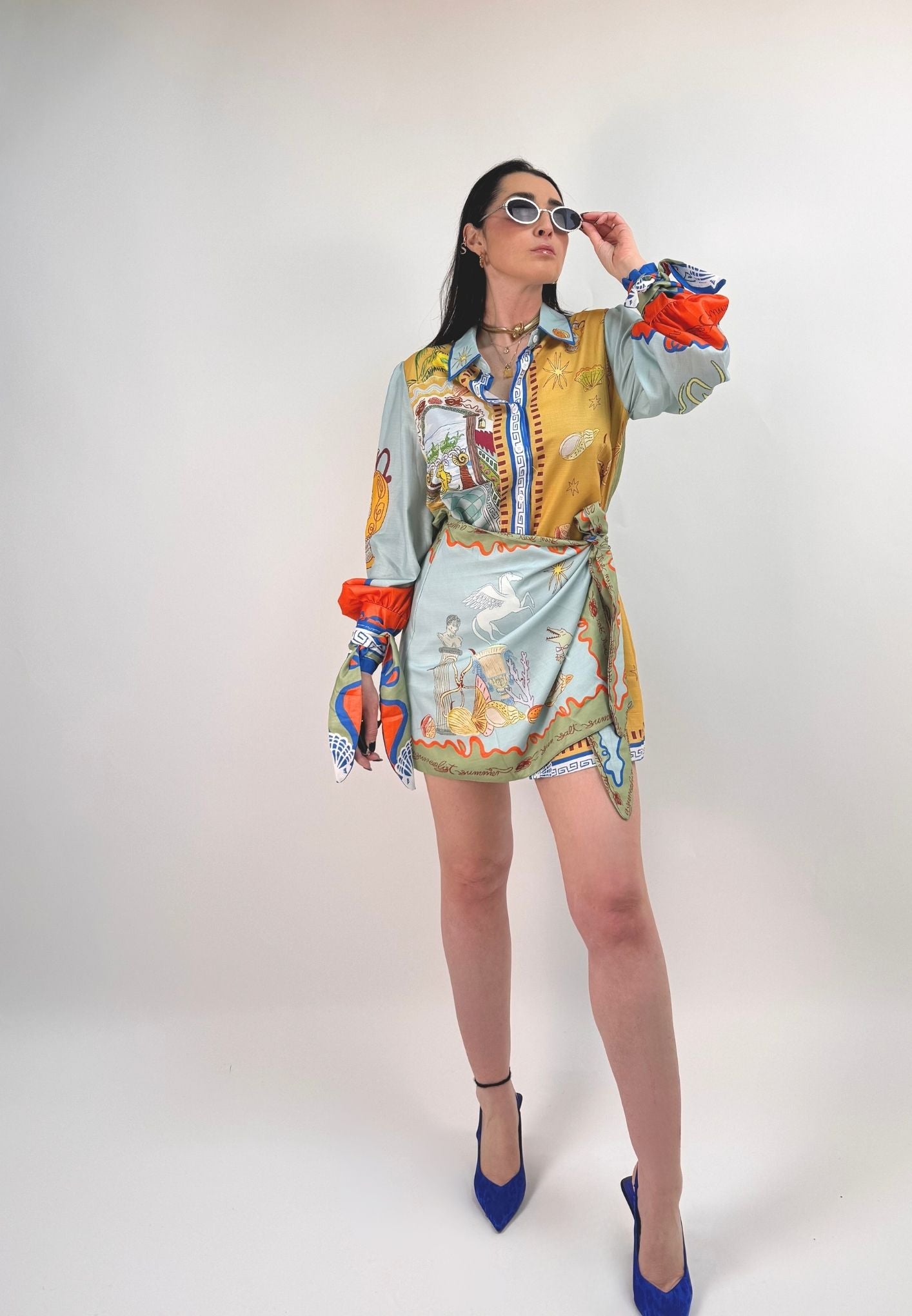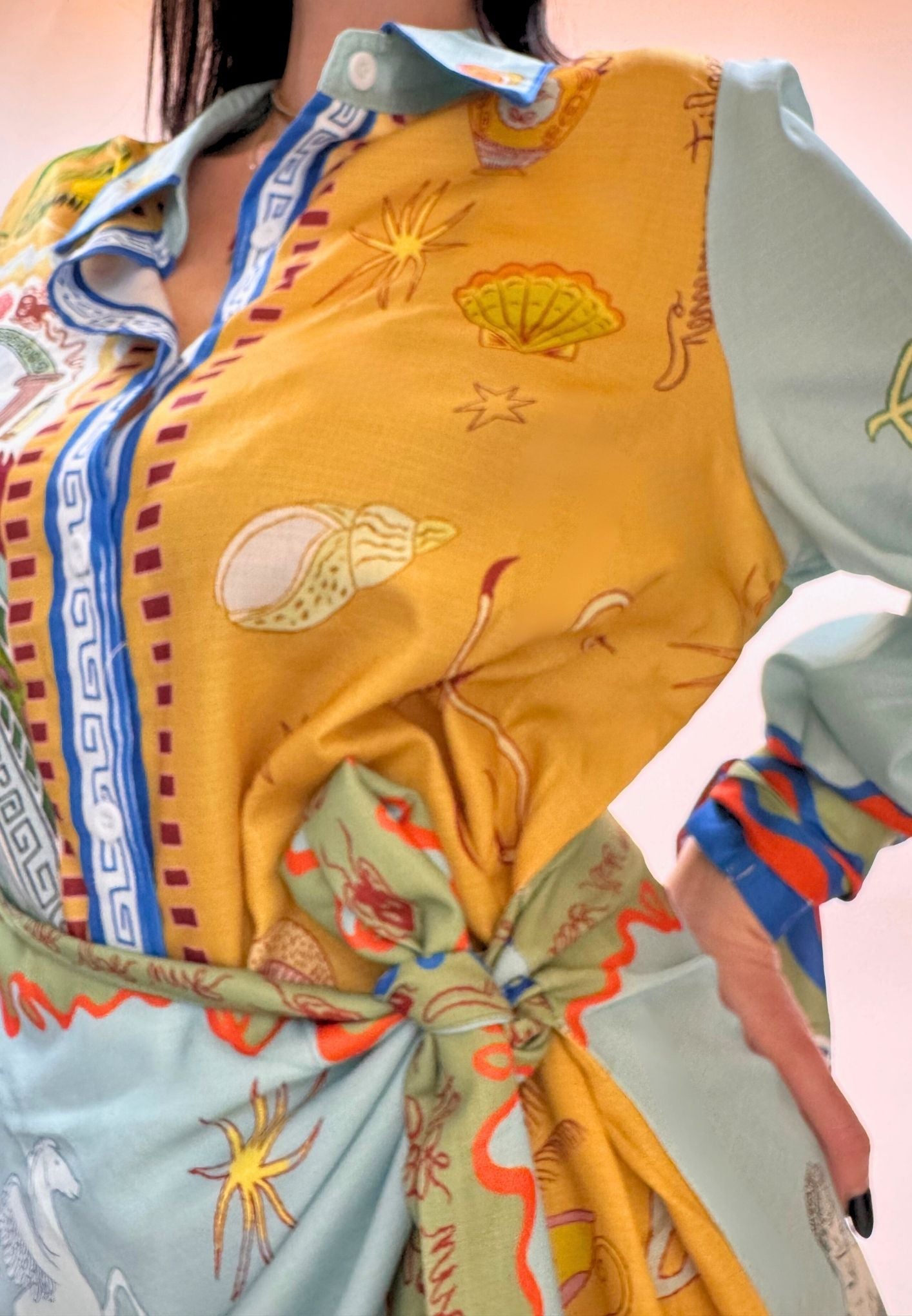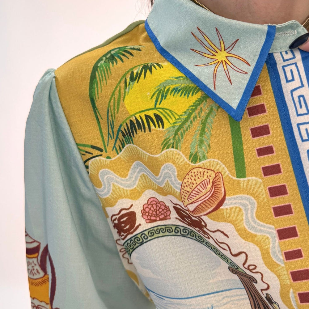 Vestito stampato, colletto a camicia abbottonato ed apribile fino al fondo, gonna a portafoglio da chiudere con nodo (cucita non staccabile). Maniche a palloncino con arricciatura sulle spalle e polsini con lacci da legare a fiocco. Veste dalla taglia XS alla taglia L