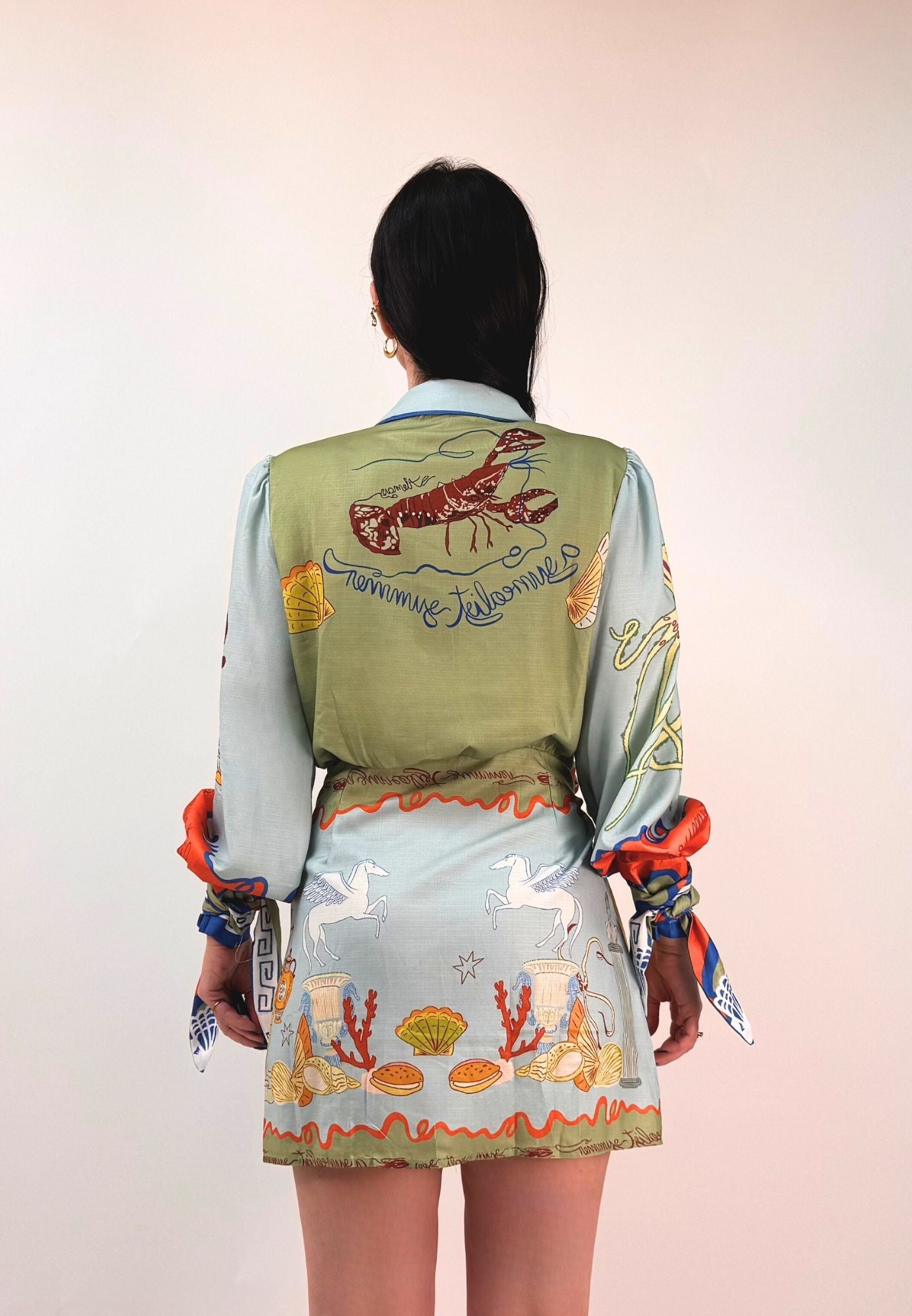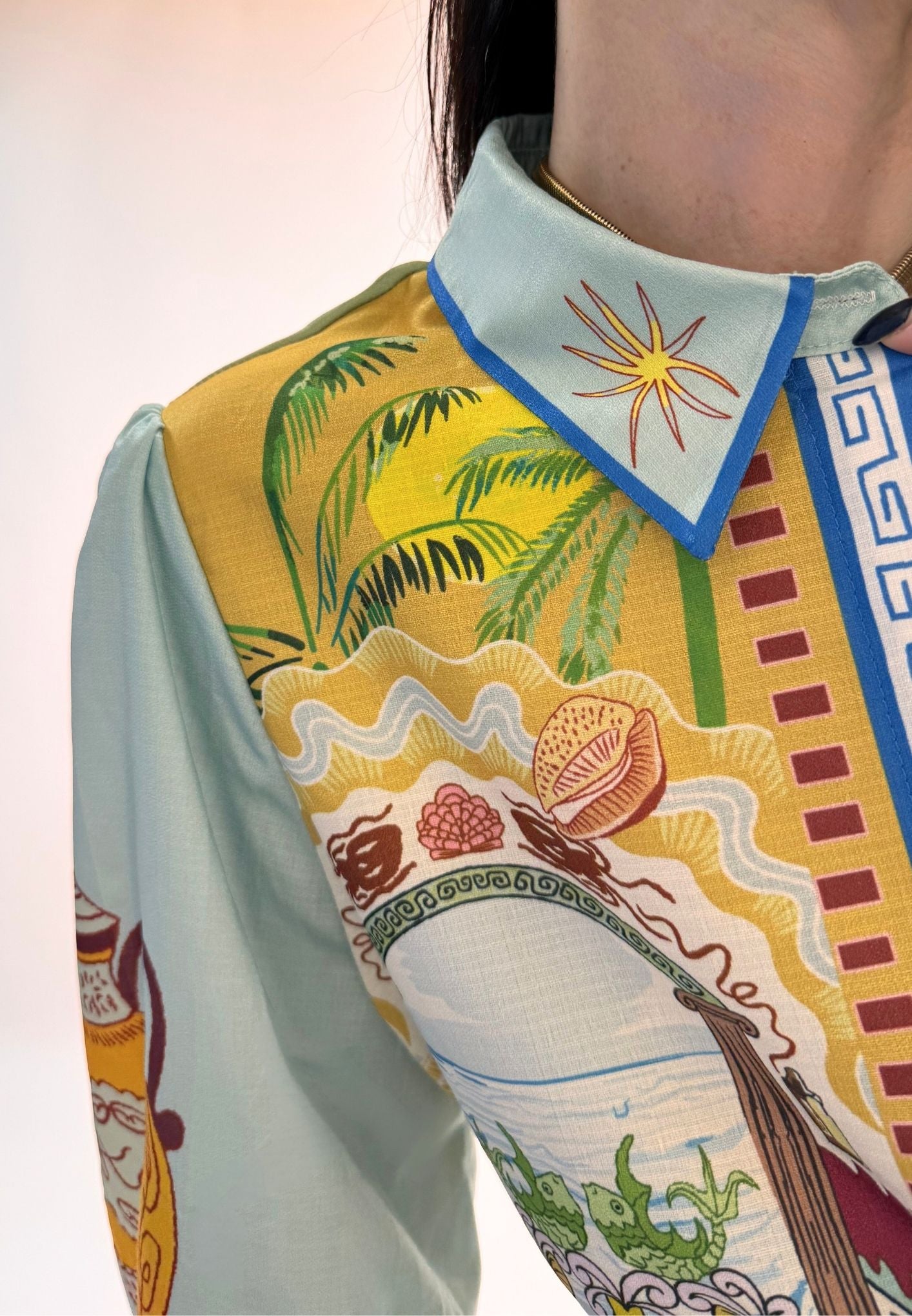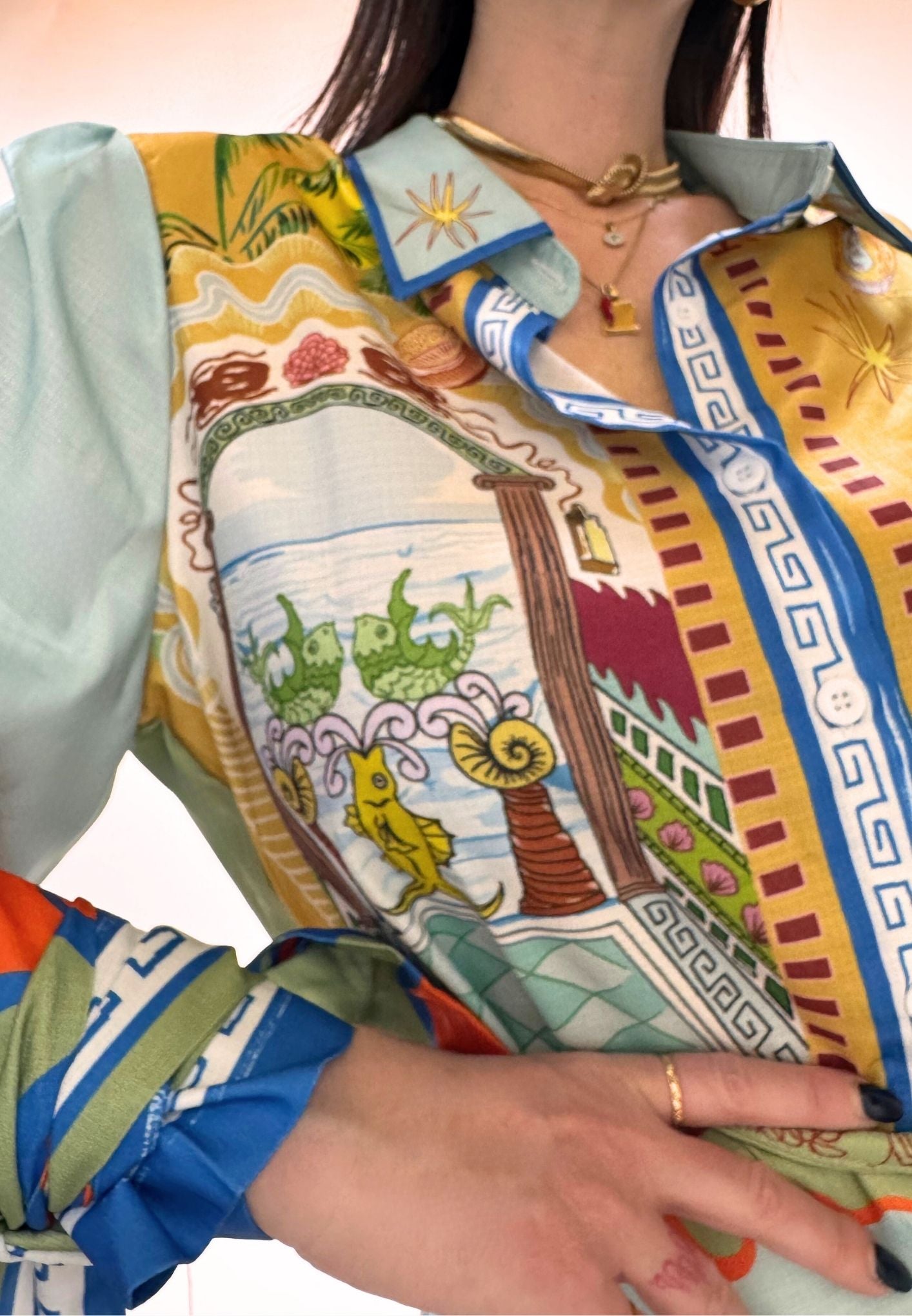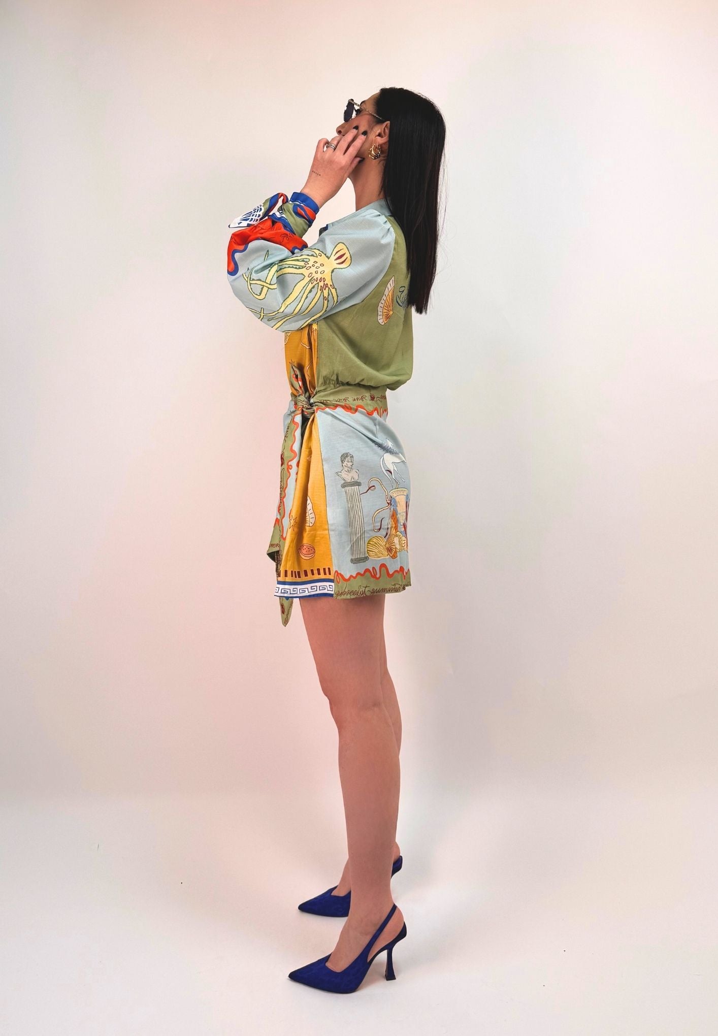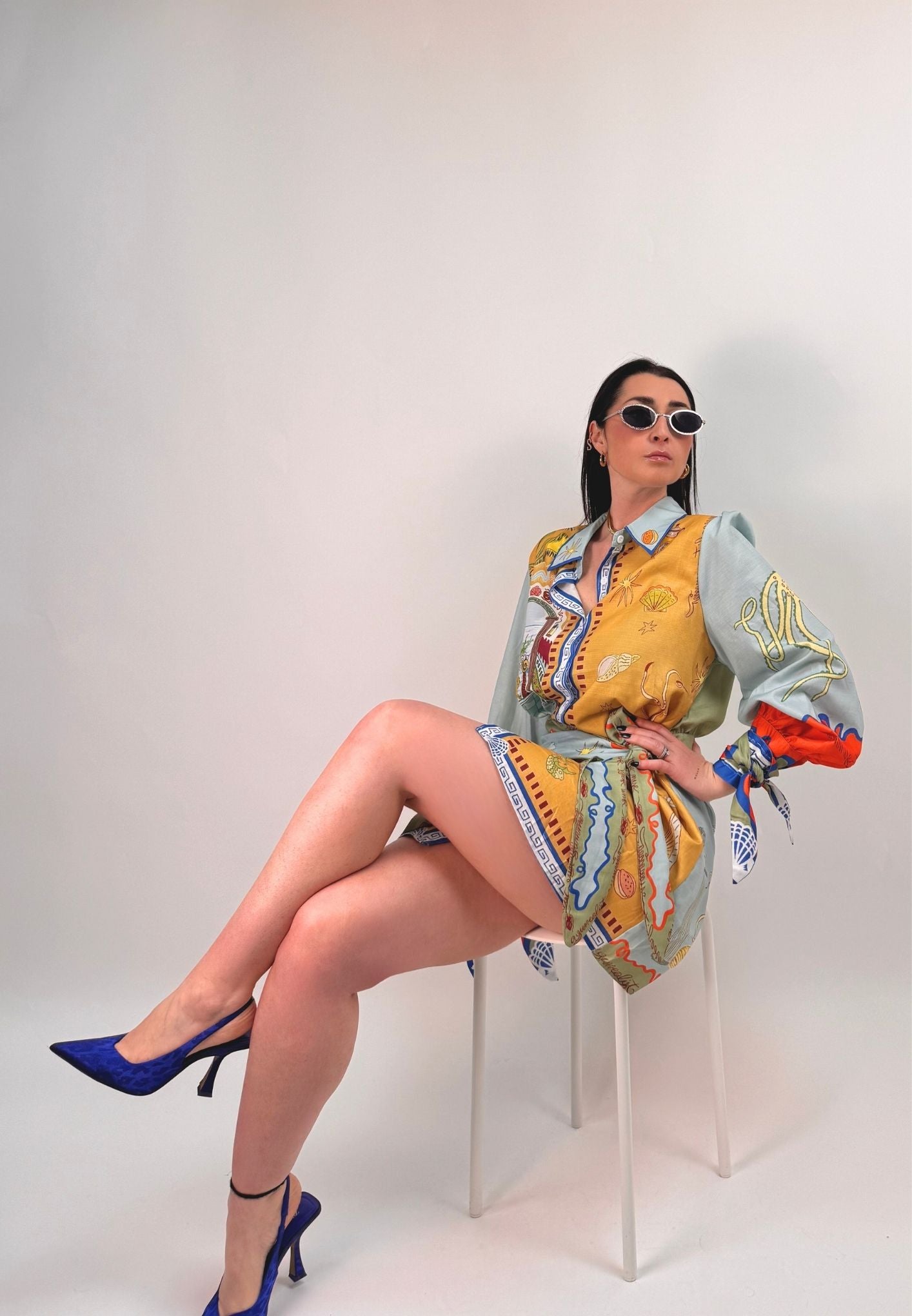 Vestito stampato, colletto a camicia abbottonato ed apribile fino al fondo, gonna a portafoglio da chiudere con nodo (cucita non staccabile). Maniche a palloncino con arricciatura sulle spalle e polsini con lacci da legare a fiocco. Veste dalla taglia XS alla taglia L